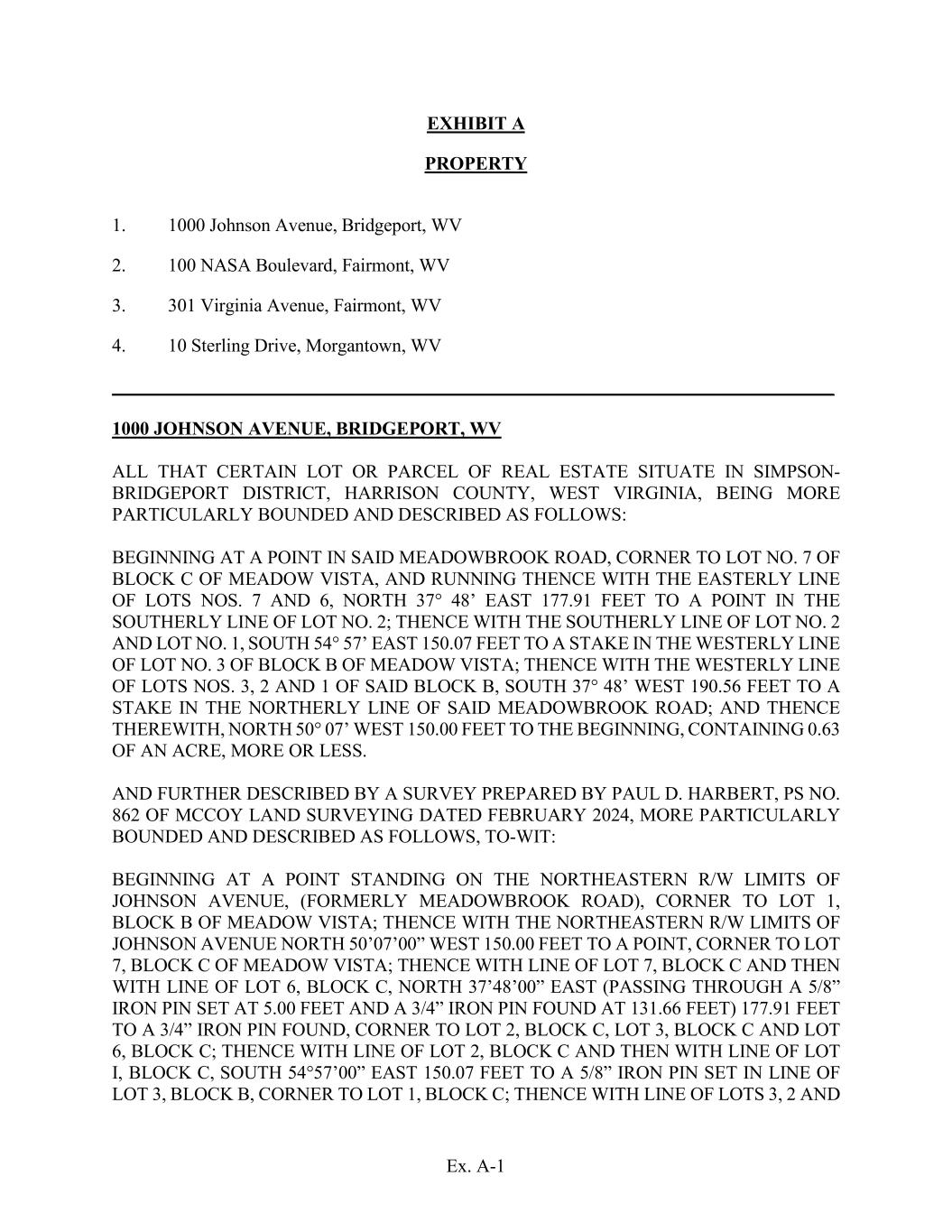Ex. A-1 EXHIBIT A PROPERTY 1. 1000 Johnson Avenue, Bridgeport, WV 2. 100 NASA Boulevard, Fairmont, WV 3. 301 Virginia Avenue, Fairmont, WV 4. 10 Sterling Drive, Morgantown, WV ______________________________________________________________________________ 1000 JOHNSON AVENUE, BRIDGEPORT, WV ALL THAT CERTAIN LOT OR PARCEL OF REAL ESTATE SITUATE IN SIMPSON- BRIDGEPORT DISTRICT, HARRISON COUNTY, WEST VIRGINIA, BEING MORE PARTICULARLY BOUNDED AND DESCRIBED AS FOLLOWS: BEGINNING AT A POINT IN SAID MEADOWBROOK ROAD, CORNER TO LOT NO. 7 OF BLOCK C OF MEADOW VISTA, AND RUNNING THENCE WITH THE EASTERLY LINE OF LOTS NOS. 7 AND 6, NORTH 37° 48’ EAST 177.91 FEET TO A POINT IN THE SOUTHERLY LINE OF LOT NO. 2; THENCE WITH THE SOUTHERLY LINE OF LOT NO. 2 AND LOT NO. 1, SOUTH 54° 57’ EAST 150.07 FEET TO A STAKE IN THE WESTERLY LINE OF LOT NO. 3 OF BLOCK B OF MEADOW VISTA; THENCE WITH THE WESTERLY LINE OF LOTS NOS. 3, 2 AND 1 OF SAID BLOCK B, SOUTH 37° 48’ WEST 190.56 FEET TO A STAKE IN THE NORTHERLY LINE OF SAID MEADOWBROOK ROAD; AND THENCE THEREWITH, NORTH 50° 07’ WEST 150.00 FEET TO THE BEGINNING, CONTAINING 0.63 OF AN ACRE, MORE OR LESS. AND FURTHER DESCRIBED BY A SURVEY PREPARED BY PAUL D. HARBERT, PS NO. 862 OF MCCOY LAND SURVEYING DATED FEBRUARY 2024, MORE PARTICULARLY BOUNDED AND DESCRIBED AS FOLLOWS, TO-WIT: BEGINNING AT A POINT STANDING ON THE NORTHEASTERN R/W LIMITS OF JOHNSON AVENUE, (FORMERLY MEADOWBROOK ROAD), CORNER TO LOT 1, BLOCK B OF MEADOW VISTA; THENCE WITH THE NORTHEASTERN R/W LIMITS OF JOHNSON AVENUE NORTH 50’07’00” WEST 150.00 FEET TO A POINT, CORNER TO LOT 7, BLOCK C OF MEADOW VISTA; THENCE WITH LINE OF LOT 7, BLOCK C AND THEN WITH LINE OF LOT 6, BLOCK C, NORTH 37’48’00” EAST (PASSING THROUGH A 5/8” IRON PIN SET AT 5.00 FEET AND A 3/4” IRON PIN FOUND AT 131.66 FEET) 177.91 FEET TO A 3/4” IRON PIN FOUND, CORNER TO LOT 2, BLOCK C, LOT 3, BLOCK C AND LOT 6, BLOCK C; THENCE WITH LINE OF LOT 2, BLOCK C AND THEN WITH LINE OF LOT I, BLOCK C, SOUTH 54°57’00” EAST 150.07 FEET TO A 5/8” IRON PIN SET IN LINE OF LOT 3, BLOCK B, CORNER TO LOT 1, BLOCK C; THENCE WITH LINE OF LOTS 3, 2 AND