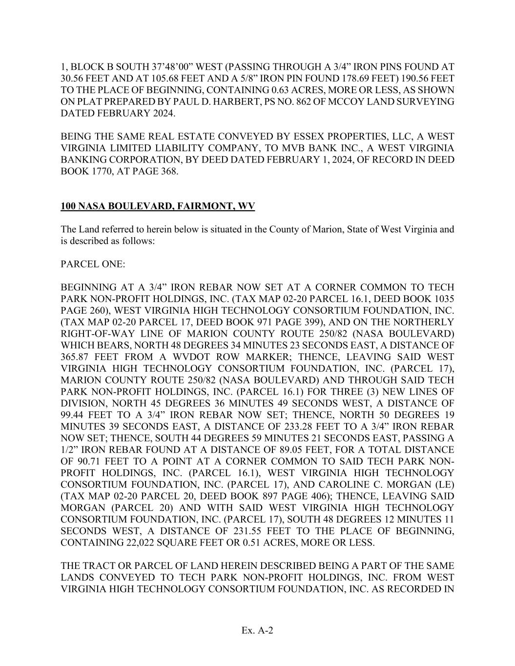 Ex. A-2 1, BLOCK B SOUTH 37’48’00” WEST (PASSING THROUGH A 3/4” IRON PINS FOUND AT 30.56 FEET AND AT 105.68 FEET AND A 5/8” IRON PIN FOUND 178.69 FEET) 190.56 FEET TO THE PLACE OF BEGINNING, CONTAINING 0.63 ACRES, MORE OR LESS, AS SHOWN ON PLAT PREPARED BY PAUL D. HARBERT, PS NO. 862 OF MCCOY LAND SURVEYING DATED FEBRUARY 2024. BEING THE SAME REAL ESTATE CONVEYED BY ESSEX PROPERTIES, LLC, A WEST VIRGINIA LIMITED LIABILITY COMPANY, TO MVB BANK INC., A WEST VIRGINIA BANKING CORPORATION, BY DEED DATED FEBRUARY 1, 2024, OF RECORD IN DEED BOOK 1770, AT PAGE 368. 100 NASA BOULEVARD, FAIRMONT, WV The Land referred to herein below is situated in the County of Marion, State of West Virginia and is described as follows: PARCEL ONE: BEGINNING AT A 3/4” IRON REBAR NOW SET AT A CORNER COMMON TO TECH PARK NON-PROFIT HOLDINGS, INC. (TAX MAP 02-20 PARCEL 16.1, DEED BOOK 1035 PAGE 260), WEST VIRGINIA HIGH TECHNOLOGY CONSORTIUM FOUNDATION, INC. (TAX MAP 02-20 PARCEL 17, DEED BOOK 971 PAGE 399), AND ON THE NORTHERLY RIGHT-OF-WAY LINE OF MARION COUNTY ROUTE 250/82 (NASA BOULEVARD) WHICH BEARS, NORTH 48 DEGREES 34 MINUTES 23 SECONDS EAST, A DISTANCE OF 365.87 FEET FROM A WVDOT ROW MARKER; THENCE, LEAVING SAID WEST VIRGINIA HIGH TECHNOLOGY CONSORTIUM FOUNDATION, INC. (PARCEL 17), MARION COUNTY ROUTE 250/82 (NASA BOULEVARD) AND THROUGH SAID TECH PARK NON-PROFIT HOLDINGS, INC. (PARCEL 16.1) FOR THREE (3) NEW LINES OF DIVISION, NORTH 45 DEGREES 36 MINUTES 49 SECONDS WEST, A DISTANCE OF 99.44 FEET TO A 3/4” IRON REBAR NOW SET; THENCE, NORTH 50 DEGREES 19 MINUTES 39 SECONDS EAST, A DISTANCE OF 233.28 FEET TO A 3/4” IRON REBAR NOW SET; THENCE, SOUTH 44 DEGREES 59 MINUTES 21 SECONDS EAST, PASSING A 1/2” IRON REBAR FOUND AT A DISTANCE OF 89.05 FEET, FOR A TOTAL DISTANCE OF 90.71 FEET TO A POINT AT A CORNER COMMON TO SAID TECH PARK NON- PROFIT HOLDINGS, INC. (PARCEL 16.1), WEST VIRGINIA HIGH TECHNOLOGY CONSORTIUM FOUNDATION, INC. (PARCEL 17), AND CAROLINE C. MORGAN (LE) (TAX MAP 02-20 PARCEL 20, DEED BOOK 897 PAGE 406); THENCE, LEAVING SAID MORGAN (PARCEL 20) AND WITH SAID WEST VIRGINIA HIGH TECHNOLOGY CONSORTIUM FOUNDATION, INC. (PARCEL 17), SOUTH 48 DEGREES 12 MINUTES 11 SECONDS WEST, A DISTANCE OF 231.55 FEET TO THE PLACE OF BEGINNING, CONTAINING 22,022 SQUARE FEET OR 0.51 ACRES, MORE OR LESS. THE TRACT OR PARCEL OF LAND HEREIN DESCRIBED BEING A PART OF THE SAME LANDS CONVEYED TO TECH PARK NON-PROFIT HOLDINGS, INC. FROM WEST VIRGINIA HIGH TECHNOLOGY CONSORTIUM FOUNDATION, INC. AS RECORDED IN