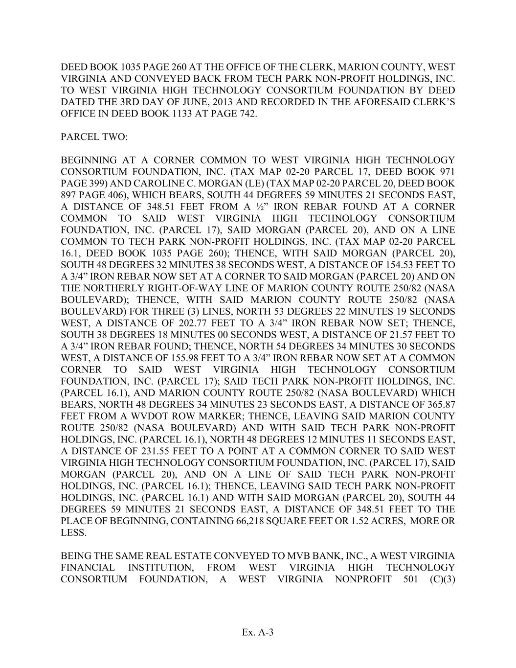 Ex. A-3 DEED BOOK 1035 PAGE 260 AT THE OFFICE OF THE CLERK, MARION COUNTY, WEST VIRGINIA AND CONVEYED BACK FROM TECH PARK NON-PROFIT HOLDINGS, INC. TO WEST VIRGINIA HIGH TECHNOLOGY CONSORTIUM FOUNDATION BY DEED DATED THE 3RD DAY OF JUNE, 2013 AND RECORDED IN THE AFORESAID CLERK’S OFFICE IN DEED BOOK 1133 AT PAGE 742. PARCEL TWO: BEGINNING AT A CORNER COMMON TO WEST VIRGINIA HIGH TECHNOLOGY CONSORTIUM FOUNDATION, INC. (TAX MAP 02-20 PARCEL 17, DEED BOOK 971 PAGE 399) AND CAROLINE C. MORGAN (LE) (TAX MAP 02-20 PARCEL 20, DEED BOOK 897 PAGE 406), WHICH BEARS, SOUTH 44 DEGREES 59 MINUTES 21 SECONDS EAST, A DISTANCE OF 348.51 FEET FROM A ½” IRON REBAR FOUND AT A CORNER COMMON TO SAID WEST VIRGINIA HIGH TECHNOLOGY CONSORTIUM FOUNDATION, INC. (PARCEL 17), SAID MORGAN (PARCEL 20), AND ON A LINE COMMON TO TECH PARK NON-PROFIT HOLDINGS, INC. (TAX MAP 02-20 PARCEL 16.1, DEED BOOK 1035 PAGE 260); THENCE, WITH SAID MORGAN (PARCEL 20), SOUTH 48 DEGREES 32 MINUTES 38 SECONDS WEST, A DISTANCE OF 154.53 FEET TO A 3/4” IRON REBAR NOW SET AT A CORNER TO SAID MORGAN (PARCEL 20) AND ON THE NORTHERLY RIGHT-OF-WAY LINE OF MARION COUNTY ROUTE 250/82 (NASA BOULEVARD); THENCE, WITH SAID MARION COUNTY ROUTE 250/82 (NASA BOULEVARD) FOR THREE (3) LINES, NORTH 53 DEGREES 22 MINUTES 19 SECONDS WEST, A DISTANCE OF 202.77 FEET TO A 3/4” IRON REBAR NOW SET; THENCE, SOUTH 38 DEGREES 18 MINUTES 00 SECONDS WEST, A DISTANCE OF 21.57 FEET TO A 3/4” IRON REBAR FOUND; THENCE, NORTH 54 DEGREES 34 MINUTES 30 SECONDS WEST, A DISTANCE OF 155.98 FEET TO A 3/4” IRON REBAR NOW SET AT A COMMON CORNER TO SAID WEST VIRGINIA HIGH TECHNOLOGY CONSORTIUM FOUNDATION, INC. (PARCEL 17); SAID TECH PARK NON-PROFIT HOLDINGS, INC. (PARCEL 16.1), AND MARION COUNTY ROUTE 250/82 (NASA BOULEVARD) WHICH BEARS, NORTH 48 DEGREES 34 MINUTES 23 SECONDS EAST, A DISTANCE OF 365.87 FEET FROM A WVDOT ROW MARKER; THENCE, LEAVING SAID MARION COUNTY ROUTE 250/82 (NASA BOULEVARD) AND WITH SAID TECH PARK NON-PROFIT HOLDINGS, INC. (PARCEL 16.1), NORTH 48 DEGREES 12 MINUTES 11 SECONDS EAST, A DISTANCE OF 231.55 FEET TO A POINT AT A COMMON CORNER TO SAID WEST VIRGINIA HIGH TECHNOLOGY CONSORTIUM FOUNDATION, INC. (PARCEL 17), SAID MORGAN (PARCEL 20), AND ON A LINE OF SAID TECH PARK NON-PROFIT HOLDINGS, INC. (PARCEL 16.1); THENCE, LEAVING SAID TECH PARK NON-PROFIT HOLDINGS, INC. (PARCEL 16.1) AND WITH SAID MORGAN (PARCEL 20), SOUTH 44 DEGREES 59 MINUTES 21 SECONDS EAST, A DISTANCE OF 348.51 FEET TO THE PLACE OF BEGINNING, CONTAINING 66,218 SQUARE FEET OR 1.52 ACRES, MORE OR LESS. BEING THE SAME REAL ESTATE CONVEYED TO MVB BANK, INC., A WEST VIRGINIA FINANCIAL INSTITUTION, FROM WEST VIRGINIA HIGH TECHNOLOGY CONSORTIUM FOUNDATION, A WEST VIRGINIA NONPROFIT 501 (C)(3)