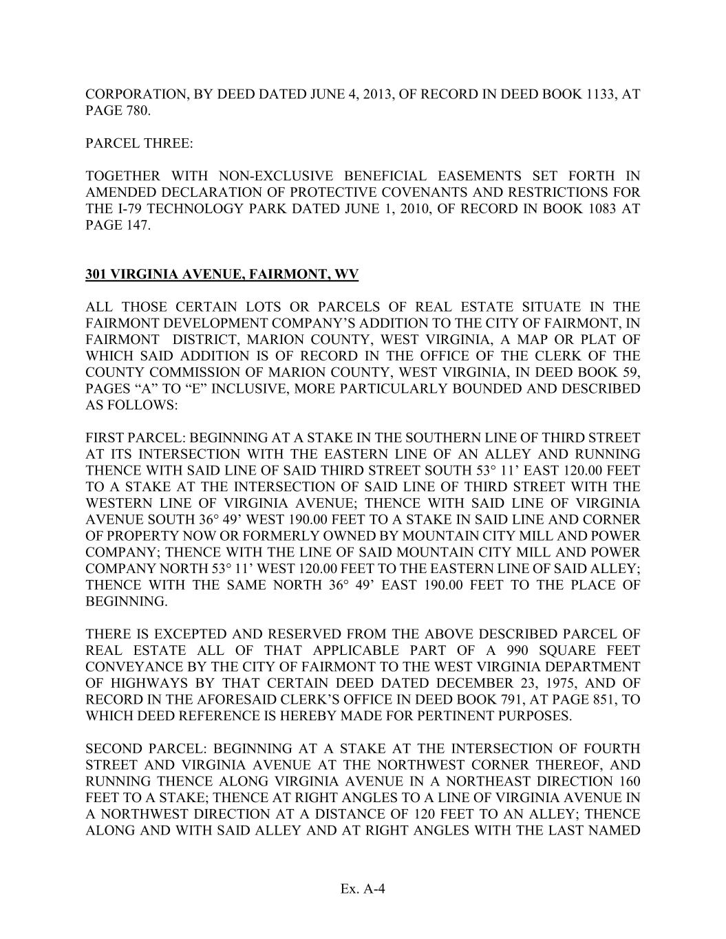 Ex. A-4 CORPORATION, BY DEED DATED JUNE 4, 2013, OF RECORD IN DEED BOOK 1133, AT PAGE 780. PARCEL THREE: TOGETHER WITH NON-EXCLUSIVE BENEFICIAL EASEMENTS SET FORTH IN AMENDED DECLARATION OF PROTECTIVE COVENANTS AND RESTRICTIONS FOR THE I-79 TECHNOLOGY PARK DATED JUNE 1, 2010, OF RECORD IN BOOK 1083 AT PAGE 147. 301 VIRGINIA AVENUE, FAIRMONT, WV ALL THOSE CERTAIN LOTS OR PARCELS OF REAL ESTATE SITUATE IN THE FAIRMONT DEVELOPMENT COMPANY’S ADDITION TO THE CITY OF FAIRMONT, IN FAIRMONT DISTRICT, MARION COUNTY, WEST VIRGINIA, A MAP OR PLAT OF WHICH SAID ADDITION IS OF RECORD IN THE OFFICE OF THE CLERK OF THE COUNTY COMMISSION OF MARION COUNTY, WEST VIRGINIA, IN DEED BOOK 59, PAGES “A” TO “E” INCLUSIVE, MORE PARTICULARLY BOUNDED AND DESCRIBED AS FOLLOWS: FIRST PARCEL: BEGINNING AT A STAKE IN THE SOUTHERN LINE OF THIRD STREET AT ITS INTERSECTION WITH THE EASTERN LINE OF AN ALLEY AND RUNNING THENCE WITH SAID LINE OF SAID THIRD STREET SOUTH 53° 11’ EAST 120.00 FEET TO A STAKE AT THE INTERSECTION OF SAID LINE OF THIRD STREET WITH THE WESTERN LINE OF VIRGINIA AVENUE; THENCE WITH SAID LINE OF VIRGINIA AVENUE SOUTH 36° 49’ WEST 190.00 FEET TO A STAKE IN SAID LINE AND CORNER OF PROPERTY NOW OR FORMERLY OWNED BY MOUNTAIN CITY MILL AND POWER COMPANY; THENCE WITH THE LINE OF SAID MOUNTAIN CITY MILL AND POWER COMPANY NORTH 53° 11’ WEST 120.00 FEET TO THE EASTERN LINE OF SAID ALLEY; THENCE WITH THE SAME NORTH 36° 49’ EAST 190.00 FEET TO THE PLACE OF BEGINNING. THERE IS EXCEPTED AND RESERVED FROM THE ABOVE DESCRIBED PARCEL OF REAL ESTATE ALL OF THAT APPLICABLE PART OF A 990 SQUARE FEET CONVEYANCE BY THE CITY OF FAIRMONT TO THE WEST VIRGINIA DEPARTMENT OF HIGHWAYS BY THAT CERTAIN DEED DATED DECEMBER 23, 1975, AND OF RECORD IN THE AFORESAID CLERK’S OFFICE IN DEED BOOK 791, AT PAGE 851, TO WHICH DEED REFERENCE IS HEREBY MADE FOR PERTINENT PURPOSES. SECOND PARCEL: BEGINNING AT A STAKE AT THE INTERSECTION OF FOURTH STREET AND VIRGINIA AVENUE AT THE NORTHWEST CORNER THEREOF, AND RUNNING THENCE ALONG VIRGINIA AVENUE IN A NORTHEAST DIRECTION 160 FEET TO A STAKE; THENCE AT RIGHT ANGLES TO A LINE OF VIRGINIA AVENUE IN A NORTHWEST DIRECTION AT A DISTANCE OF 120 FEET TO AN ALLEY; THENCE ALONG AND WITH SAID ALLEY AND AT RIGHT ANGLES WITH THE LAST NAMED