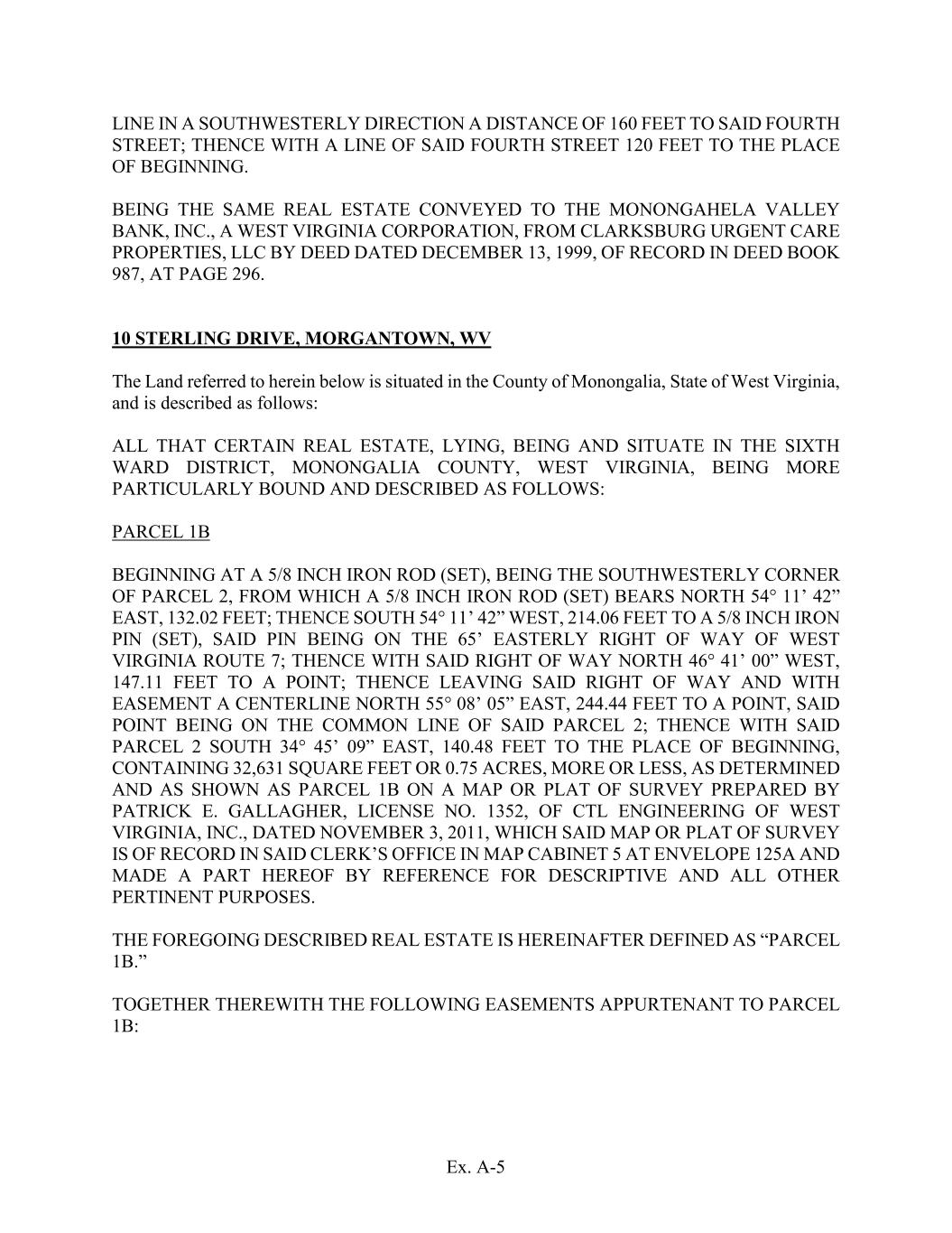 Ex. A-5 LINE IN A SOUTHWESTERLY DIRECTION A DISTANCE OF 160 FEET TO SAID FOURTH STREET; THENCE WITH A LINE OF SAID FOURTH STREET 120 FEET TO THE PLACE OF BEGINNING. BEING THE SAME REAL ESTATE CONVEYED TO THE MONONGAHELA VALLEY BANK, INC., A WEST VIRGINIA CORPORATION, FROM CLARKSBURG URGENT CARE PROPERTIES, LLC BY DEED DATED DECEMBER 13, 1999, OF RECORD IN DEED BOOK 987, AT PAGE 296. 10 STERLING DRIVE, MORGANTOWN, WV The Land referred to herein below is situated in the County of Monongalia, State of West Virginia, and is described as follows: ALL THAT CERTAIN REAL ESTATE, LYING, BEING AND SITUATE IN THE SIXTH WARD DISTRICT, MONONGALIA COUNTY, WEST VIRGINIA, BEING MORE PARTICULARLY BOUND AND DESCRIBED AS FOLLOWS: PARCEL 1B BEGINNING AT A 5/8 INCH IRON ROD (SET), BEING THE SOUTHWESTERLY CORNER OF PARCEL 2, FROM WHICH A 5/8 INCH IRON ROD (SET) BEARS NORTH 54° 11’ 42” EAST, 132.02 FEET; THENCE SOUTH 54° 11’ 42” WEST, 214.06 FEET TO A 5/8 INCH IRON PIN (SET), SAID PIN BEING ON THE 65’ EASTERLY RIGHT OF WAY OF WEST VIRGINIA ROUTE 7; THENCE WITH SAID RIGHT OF WAY NORTH 46° 41’ 00” WEST, 147.11 FEET TO A POINT; THENCE LEAVING SAID RIGHT OF WAY AND WITH EASEMENT A CENTERLINE NORTH 55° 08’ 05” EAST, 244.44 FEET TO A POINT, SAID POINT BEING ON THE COMMON LINE OF SAID PARCEL 2; THENCE WITH SAID PARCEL 2 SOUTH 34° 45’ 09” EAST, 140.48 FEET TO THE PLACE OF BEGINNING, CONTAINING 32,631 SQUARE FEET OR 0.75 ACRES, MORE OR LESS, AS DETERMINED AND AS SHOWN AS PARCEL 1B ON A MAP OR PLAT OF SURVEY PREPARED BY PATRICK E. GALLAGHER, LICENSE NO. 1352, OF CTL ENGINEERING OF WEST VIRGINIA, INC., DATED NOVEMBER 3, 2011, WHICH SAID MAP OR PLAT OF SURVEY IS OF RECORD IN SAID CLERK’S OFFICE IN MAP CABINET 5 AT ENVELOPE 125A AND MADE A PART HEREOF BY REFERENCE FOR DESCRIPTIVE AND ALL OTHER PERTINENT PURPOSES. THE FOREGOING DESCRIBED REAL ESTATE IS HEREINAFTER DEFINED AS “PARCEL 1B.” TOGETHER THEREWITH THE FOLLOWING EASEMENTS APPURTENANT TO PARCEL 1B: