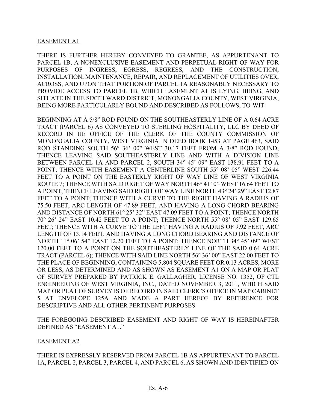 Ex. A-6 EASEMENT A1 THERE IS FURTHER HEREBY CONVEYED TO GRANTEE, AS APPURTENANT TO PARCEL 1B, A NONEXCLUSIVE EASEMENT AND PERPETUAL RIGHT OF WAY FOR PURPOSES OF INGRESS, EGRESS, REGRESS, AND THE CONSTRUCTION, INSTALLATION, MAINTENANCE, REPAIR, AND REPLACEMENT OF UTILITIES OVER, ACROSS, AND UPON THAT PORTION OF PARCEL 1A REASONABLY NECESSARY TO PROVIDE ACCESS TO PARCEL 1B, WHICH EASEMENT A1 IS LYING, BEING, AND SITUATE IN THE SIXTH WARD DISTRICT, MONONGALIA COUNTY, WEST VIRGINIA, BEING MORE PARTICULARLY BOUND AND DESCRIBED AS FOLLOWS, TO-WIT: BEGINNING AT A 5/8” ROD FOUND ON THE SOUTHEASTERLY LINE OF A 0.64 ACRE TRACT (PARCEL 6) AS CONVEYED TO STERLING HOSPITALITY, LLC BY DEED OF RECORD IN HE OFFICE OF THE CLERK OF THE COUNTY COMMISSION OF MONONGALIA COUNTY, WEST VIRGINIA IN DEED BOOK 1453 AT PAGE 463, SAID ROD STANDING SOUTH 56° 36’ 00” WEST 30.17 FEET FROM A 3/8” ROD FOUND; THENCE LEAVING SAID SOUTHEASTERLY LINE AND WITH A DIVISION LINE BETWEEN PARCEL 1A AND PARCEL 2, SOUTH 34° 45’ 09” EAST 138.91 FEET TO A POINT; THENCE WITH EASEMENT A CENTERLINE SOUTH 55° 08’ 05” WEST 226.44 FEET TO A POINT ON THE EASTERLY RIGHT OF WAY LINE OF WEST VIRGINIA ROUTE 7; THENCE WITH SAID RIGHT OF WAY NORTH 46° 41’ 0” WEST 16.64 FEET TO A POINT; THENCE LEAVING SAID RIGHT OF WAY LINE NORTH 43° 24’ 29” EAST 12.87 FEET TO A POINT; THENCE WITH A CURVE TO THE RIGHT HAVING A RADIUS OF 75.50 FEET, ARC LENGTH OF 47.89 FEET, AND HAVING A LONG CHORD BEARING AND DISTANCE OF NORTH 61° 25’ 32” EAST 47.09 FEET TO A POINT; THENCE NORTH 70° 26’ 24” EAST 10.42 FEET TO A POINT; THENCE NORTH 55° 08’ 05” EAST 129.65 FEET; THENCE WITH A CURVE TO THE LEFT HAVING A RADIUS OF 9.92 FEET, ARC LENGTH OF 13.14 FEET, AND HAVING A LONG CHORD BEARING AND DISTANCE OF NORTH 11° 06’ 54” EAST 12.20 FEET TO A POINT; THENCE NORTH 34° 45’ 09” WEST 120.00 FEET TO A POINT ON THE SOUTHEASTERLY LINE OF THE SAID 0.64 ACRE TRACT (PARCEL 6); THENCE WITH SAID LINE NORTH 56° 36’ 00” EAST 22.00 FEET TO THE PLACE OF BEGINNING, CONTAINING 5,804 SQUARE FEET OR 0.13 ACRES, MORE OR LESS, AS DETERMINED AND AS SHOWN AS EASEMENT A1 ON A MAP OR PLAT OF SURVEY PREPARED BY PATRICK E. GALLAGHER, LICENSE NO. 1352, OF CTL ENGINEERING OF WEST VIRGINIA, INC., DATED NOVEMBER 3, 2011, WHICH SAID MAP OR PLAT OF SURVEY IS OF RECORD IN SAID CLERK’S OFFICE IN MAP CABINET 5 AT ENVELOPE 125A AND MADE A PART HEREOF BY REFERENCE FOR DESCRIPTIVE AND ALL OTHER PERTINENT PURPOSES. THE FOREGOING DESCRIBED EASEMENT AND RIGHT OF WAY IS HEREINAFTER DEFINED AS “EASEMENT A1.” EASEMENT A2 THERE IS EXPRESSLY RESERVED FROM PARCEL 1B AS APPURTENANT TO PARCEL 1A, PARCEL 2, PARCEL 3, PARCEL 4, AND PARCEL 6, AS SHOWN AND IDENTIFIED ON
