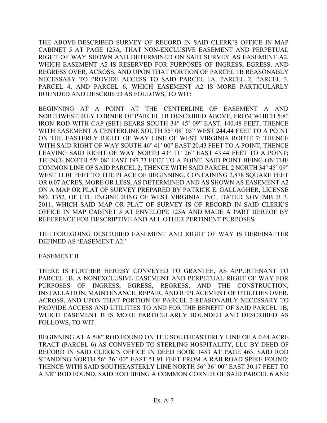 Ex. A-7 THE ABOVE-DESCRIBED SURVEY OF RECORD IN SAID CLERK’S OFFICE IN MAP CABINET 5 AT PAGE 125A, THAT NON-EXCLUSIVE EASEMENT AND PERPETUAL RIGHT OF WAY SHOWN AND DETERMINED ON SAID SURVEY AS EASEMENT A2, WHICH EASEMENT A2 IS RESERVED FOR PURPOSES OF INGRESS, EGRESS, AND REGRESS OVER, ACROSS, AND UPON THAT PORTION OF PARCEL 1B REASONABLY NECESSARY TO PROVIDE ACCESS TO SAID PARCEL 1A, PARCEL 2, PARCEL 3, PARCEL 4, AND PARCEL 6, WHICH EASEMENT A2 IS MORE PARTICULARLY BOUNDED AND DESCRIBED AS FOLLOWS, TO WIT: BEGINNING AT A POINT AT THE CENTERLINE OF EASEMENT A AND NORTHWESTERLY CORNER OF PARCEL 1B DESCRIBED ABOVE, FROM WHICH 5/8” IRON ROD WITH CAP (SET) BEARS SOUTH 34° 45’ 09” EAST, 140.48 FEET; THENCE WITH EASEMENT A CENTERLINE SOUTH 55° 08’ 05” WEST 244.44 FEET TO A POINT ON THE EASTERLY RIGHT OF WAY LINE OF WEST VIRGINIA ROUTE 7; THENCE WITH SAID RIGHT OF WAY SOUTH 46° 41’ 00” EAST 20.43 FEET TO A POINT; THENCE LEAVING SAID RIGHT OF WAY NORTH 43° 11’ 26” EAST 43.44 FEET TO A POINT; THENCE NORTH 55° 08’ EAST 197.73 FEET TO A POINT, SAID POINT BEING ON THE COMMON LINE OF SAID PARCEL 2; THENCE WITH SAID PARCEL 2 NORTH 34° 45’ 09” WEST 11.01 FEET TO THE PLACE OF BEGINNING, CONTAINING 2,878 SQUARE FEET OR 0.07 ACRES, MORE OR LESS, AS DETERMINED AND AS SHOWN AS EASEMENT A2 ON A MAP OR PLAT OF SURVEY PREPARED BY PATRICK E. GALLAGHER, LICENSE NO. 1352, OF CTL ENGINEERING OF WEST VIRGINIA, INC., DATED NOVEMBER 3, 2011, WHICH SAID MAP OR PLAT OF SURVEY IS OF RECORD IN SAID CLERK’S OFFICE IN MAP CABINET 5 AT ENVELOPE 125A AND MADE A PART HEREOF BY REFERENCE FOR DESCRIPTIVE AND ALL OTHER PERTINENT PURPOSES. THE FOREGOING DESCRIBED EASEMENT AND RIGHT OF WAY IS HEREINAFTER DEFINED AS ‘EASEMENT A2.’ EASEMENT B THERE IS FURTHER HEREBY CONVEYED TO GRANTEE, AS APPURTENANT TO PARCEL 1B, A NONEXCLUSIVE EASEMENT AND PERPETUAL RIGHT OF WAY FOR PURPOSES OF INGRESS, EGRESS, REGRESS, AND THE CONSTRUCTION, INSTALLATION, MAINTENANCE, REPAIR, AND REPLACEMENT OF UTILITIES OVER, ACROSS, AND UPON THAT PORTION OF PARCEL 2 REASONABLY NECESSARY TO PROVIDE ACCESS AND UTILITIES TO AND FOR THE BENEFIT OF SAID PARCEL 1B, WHICH EASEMENT B IS MORE PARTICULARLY BOUNDED AND DESCRIBED AS FOLLOWS, TO WIT: BEGINNING AT A 5/8” ROD FOUND ON THE SOUTHEASTERLY LINE OF A 0.64 ACRE TRACT (PARCEL 6) AS CONVEYED TO STERLING HOSPITALITY, LLC BY DEED OF RECORD IN SAID CLERK’S OFFICE IN DEED BOOK 1453 AT PAGE 463, SAID ROD STANDING NORTH 56° 36’ 00” EAST 51.91 FEET FROM A RAILROAD SPIKE FOUND; THENCE WITH SAID SOUTHEASTERLY LINE NORTH 56° 36’ 00” EAST 30.17 FEET TO A 3/8” ROD FOUND, SAID ROD BEING A COMMON CORNER OF SAID PARCEL 6 AND