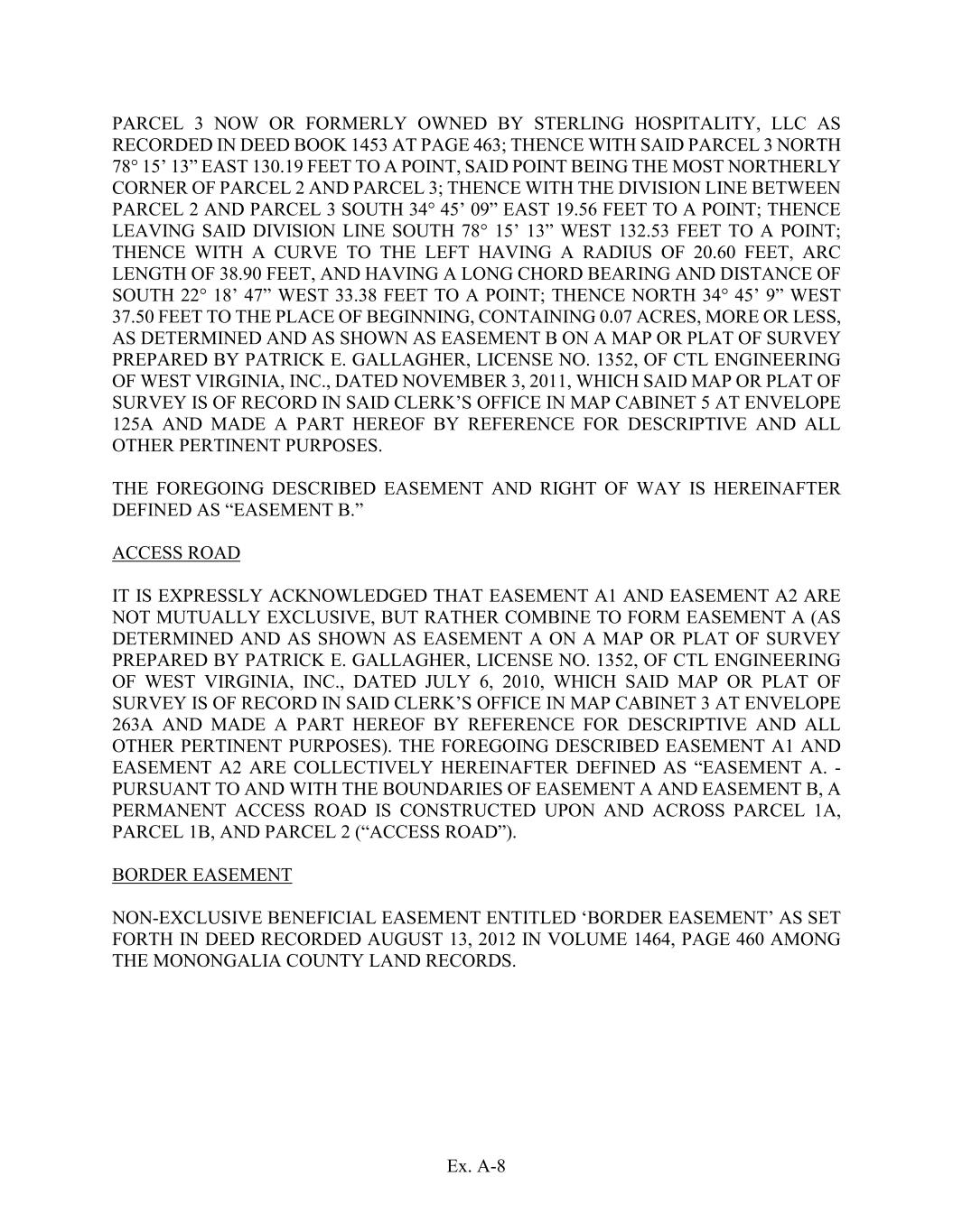 Ex. A-8 PARCEL 3 NOW OR FORMERLY OWNED BY STERLING HOSPITALITY, LLC AS RECORDED IN DEED BOOK 1453 AT PAGE 463; THENCE WITH SAID PARCEL 3 NORTH 78° 15’ 13” EAST 130.19 FEET TO A POINT, SAID POINT BEING THE MOST NORTHERLY CORNER OF PARCEL 2 AND PARCEL 3; THENCE WITH THE DIVISION LINE BETWEEN PARCEL 2 AND PARCEL 3 SOUTH 34° 45’ 09” EAST 19.56 FEET TO A POINT; THENCE LEAVING SAID DIVISION LINE SOUTH 78° 15’ 13” WEST 132.53 FEET TO A POINT; THENCE WITH A CURVE TO THE LEFT HAVING A RADIUS OF 20.60 FEET, ARC LENGTH OF 38.90 FEET, AND HAVING A LONG CHORD BEARING AND DISTANCE OF SOUTH 22° 18’ 47” WEST 33.38 FEET TO A POINT; THENCE NORTH 34° 45’ 9” WEST 37.50 FEET TO THE PLACE OF BEGINNING, CONTAINING 0.07 ACRES, MORE OR LESS, AS DETERMINED AND AS SHOWN AS EASEMENT B ON A MAP OR PLAT OF SURVEY PREPARED BY PATRICK E. GALLAGHER, LICENSE NO. 1352, OF CTL ENGINEERING OF WEST VIRGINIA, INC., DATED NOVEMBER 3, 2011, WHICH SAID MAP OR PLAT OF SURVEY IS OF RECORD IN SAID CLERK’S OFFICE IN MAP CABINET 5 AT ENVELOPE 125A AND MADE A PART HEREOF BY REFERENCE FOR DESCRIPTIVE AND ALL OTHER PERTINENT PURPOSES. THE FOREGOING DESCRIBED EASEMENT AND RIGHT OF WAY IS HEREINAFTER DEFINED AS “EASEMENT B.” ACCESS ROAD IT IS EXPRESSLY ACKNOWLEDGED THAT EASEMENT A1 AND EASEMENT A2 ARE NOT MUTUALLY EXCLUSIVE, BUT RATHER COMBINE TO FORM EASEMENT A (AS DETERMINED AND AS SHOWN AS EASEMENT A ON A MAP OR PLAT OF SURVEY PREPARED BY PATRICK E. GALLAGHER, LICENSE NO. 1352, OF CTL ENGINEERING OF WEST VIRGINIA, INC., DATED JULY 6, 2010, WHICH SAID MAP OR PLAT OF SURVEY IS OF RECORD IN SAID CLERK’S OFFICE IN MAP CABINET 3 AT ENVELOPE 263A AND MADE A PART HEREOF BY REFERENCE FOR DESCRIPTIVE AND ALL OTHER PERTINENT PURPOSES). THE FOREGOING DESCRIBED EASEMENT A1 AND EASEMENT A2 ARE COLLECTIVELY HEREINAFTER DEFINED AS “EASEMENT A. - PURSUANT TO AND WITH THE BOUNDARIES OF EASEMENT A AND EASEMENT B, A PERMANENT ACCESS ROAD IS CONSTRUCTED UPON AND ACROSS PARCEL 1A, PARCEL 1B, AND PARCEL 2 (“ACCESS ROAD”). BORDER EASEMENT NON-EXCLUSIVE BENEFICIAL EASEMENT ENTITLED ‘BORDER EASEMENT’ AS SET FORTH IN DEED RECORDED AUGUST 13, 2012 IN VOLUME 1464, PAGE 460 AMONG THE MONONGALIA COUNTY LAND RECORDS.