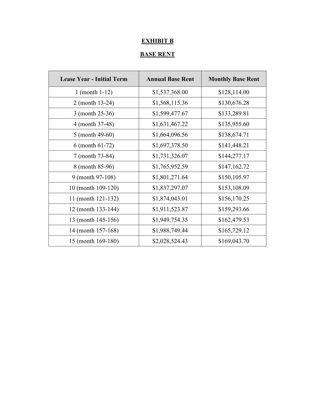 EXHIBIT B BASE RENT Lease Year - Initial Term Annual Base Rent Monthly Base Rent 1 (month 1-12) $1,537,368.00 $128,114.00 2 (month 13-24) $1,568,115.36 $130,676.28 3 (month 25-36) $1,599,477.67 $133,289.81 4 (month 37-48) $1,631,467.22 $135,955.60 5 (month 49-60) $1,664,096.56 $138,674.71 6 (month 61-72) $1,697,378.50 $141,448.21 7 (month 73-84) $1,731,326.07 $144,277.17 8 (month 85-96) $1,765,952.59 $147,162.72 9 (month 97-108) $1,801,271.64 $150,105.97 10 (month 109-120) $1,837,297.07 $153,108.09 11 (month 121-132) $1,874,043.01 $156,170.25 12 (month 133-144) $1,911,523.87 $159,293.66 13 (month 145-156) $1,949,754.35 $162,479.53 14 (month 157-168) $1,988,749.44 $165,729.12 15 (month 169-180) $2,028,524.43 $169,043.70