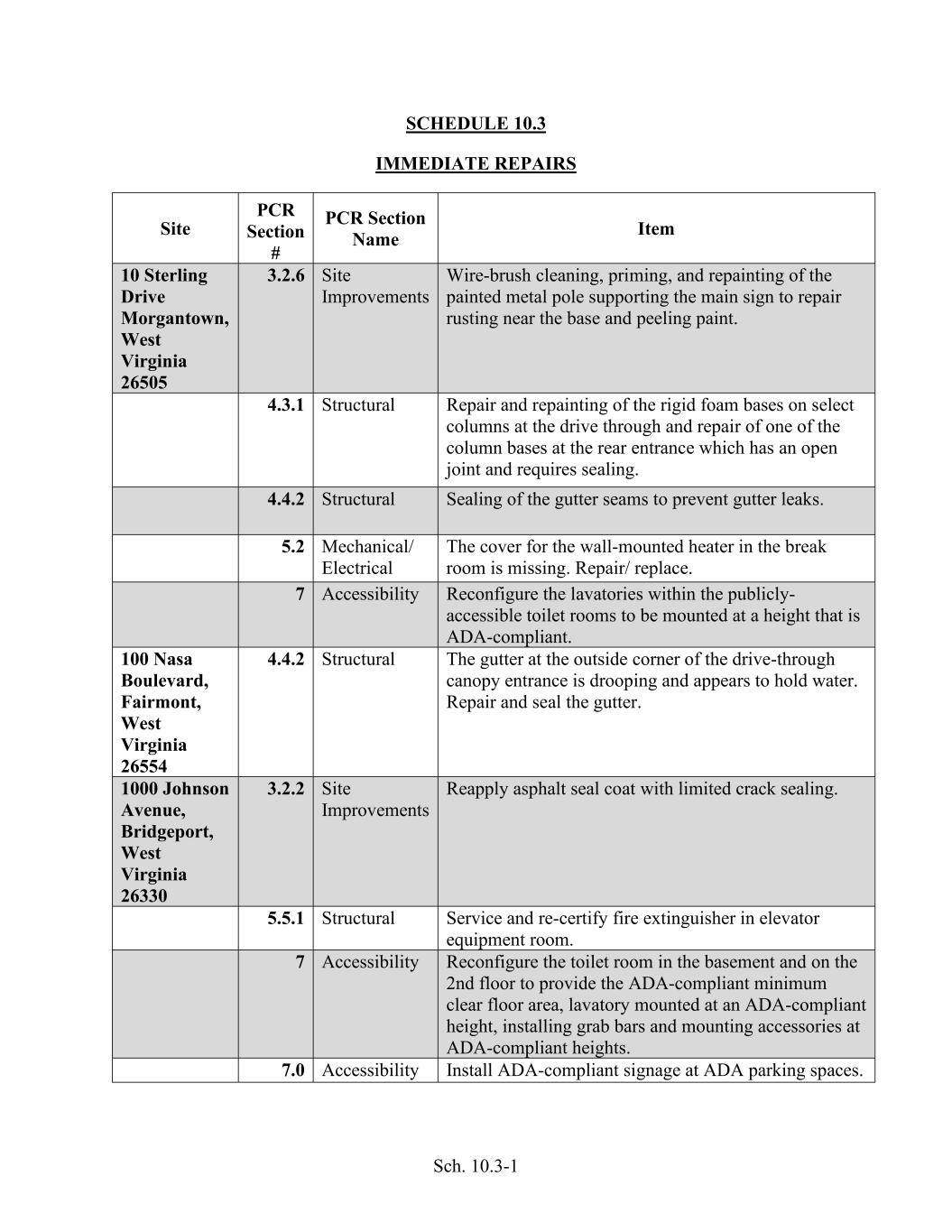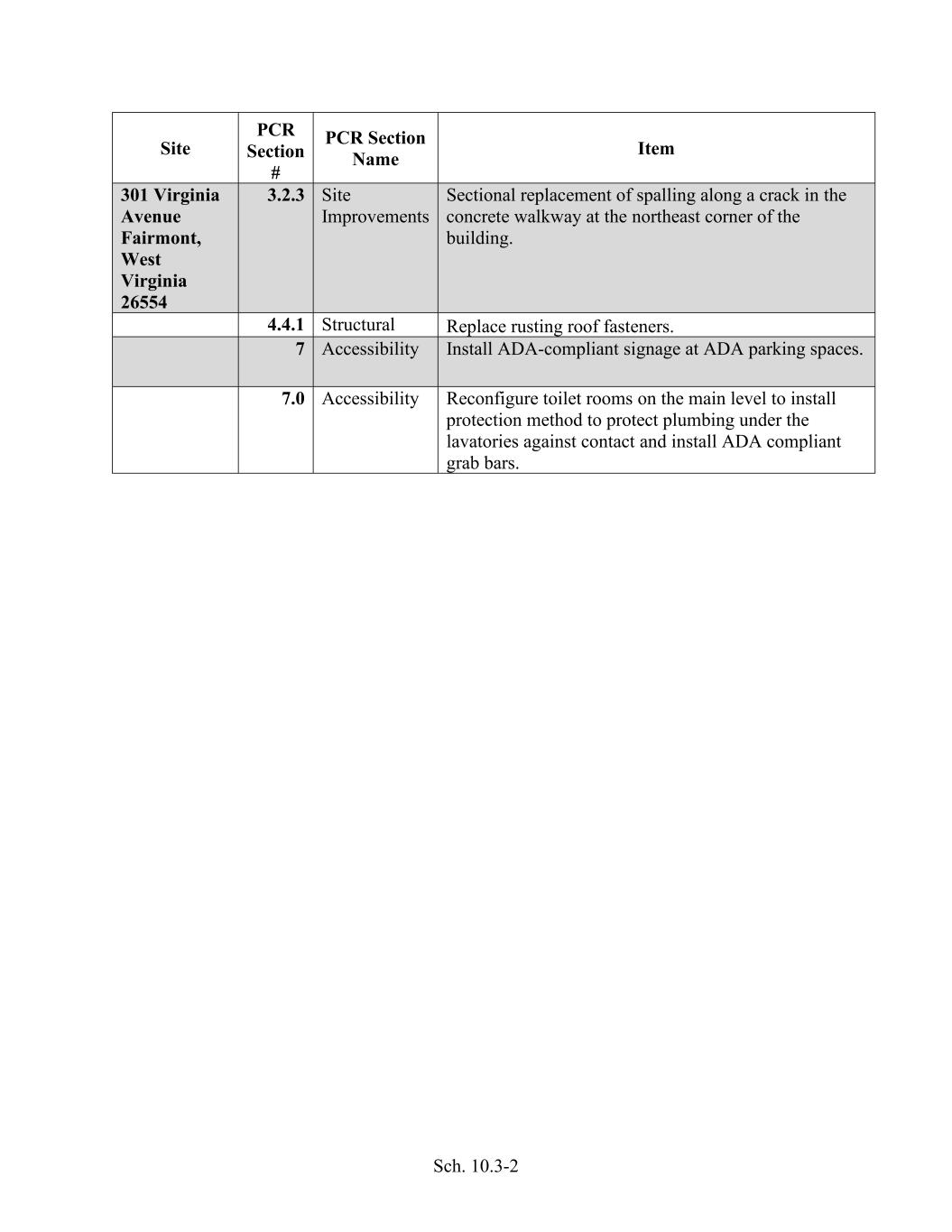 Sch. 10.3-2 Site PCR Section # PCR Section Name Item 301 Virginia Avenue Fairmont, West Virginia 26554 3.2.3 Site Improvements Sectional replacement of spalling along a crack in the concrete walkway at the northeast corner of the building. 4.4.1 Structural Replace rusting roof fasteners. 7 Accessibility Install ADA-compliant signage at ADA parking spaces. 7.0 Accessibility Reconfigure toilet rooms on the main level to install protection method to protect plumbing under the lavatories against contact and install ADA compliant grab bars.