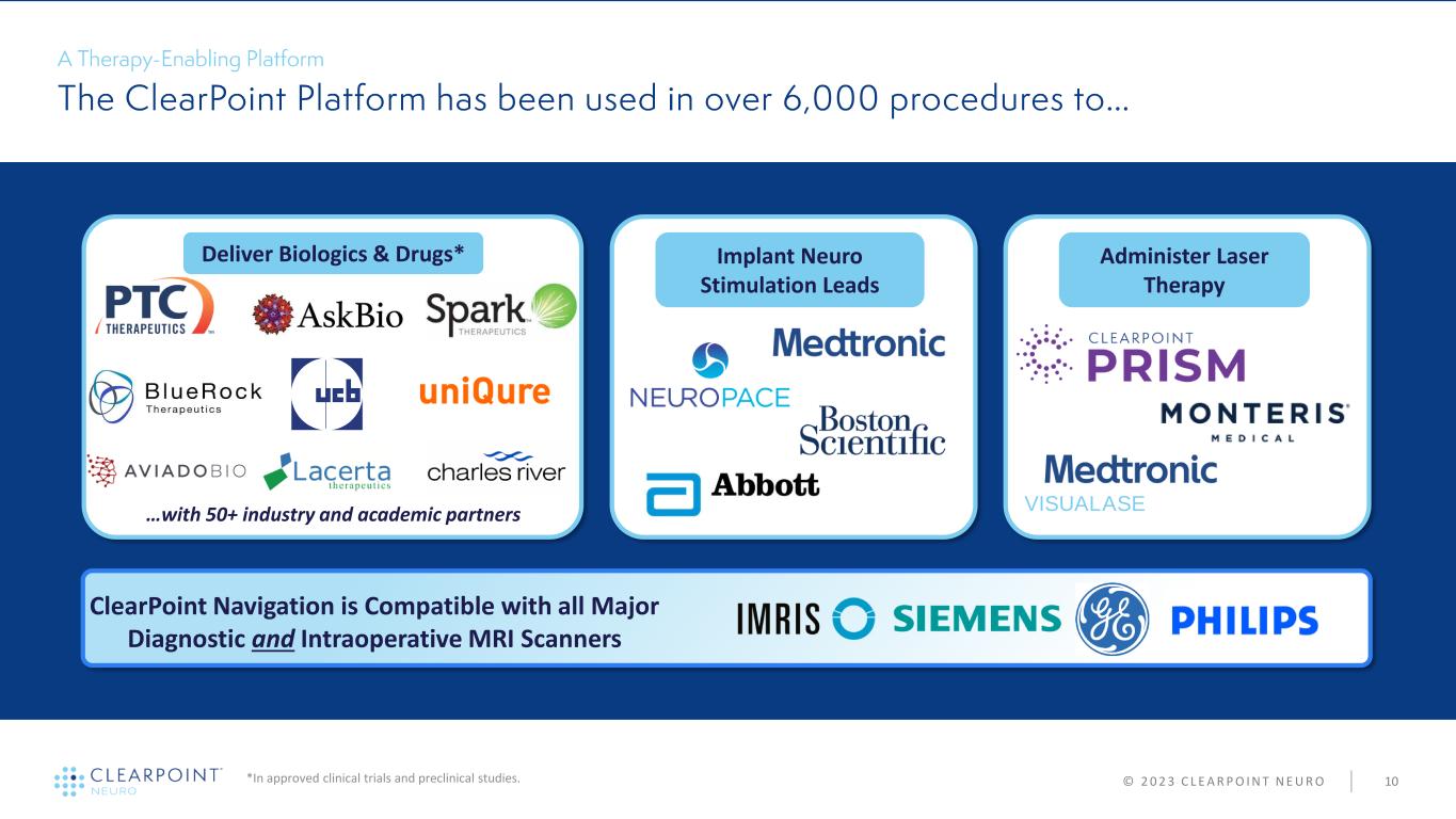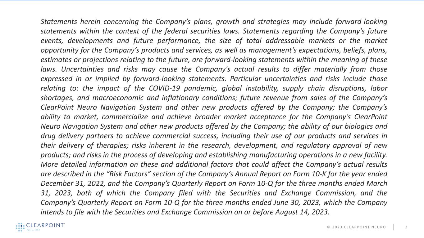 © 2 0 2 3 C L E A R P O I N T N E U R O 2 Statements herein concerning the Company’s plans, growth and strategies may include forward-looking statements within the context of the federal securities laws. Statements regarding the Company's future events, developments and future performance, the size of total addressable markets or the market opportunity for the Company’s products and services, as well as management's expectations, beliefs, plans, estimates or projections relating to the future, are forward-looking statements within the meaning of these laws. Uncertainties and risks may cause the Company's actual results to differ materially from those expressed in or implied by forward-looking statements. Particular uncertainties and risks include those relating to: the impact of the COVID-19 pandemic, global instability, supply chain disruptions, labor shortages, and macroeconomic and inflationary conditions; future revenue from sales of the Company’s ClearPoint Neuro Navigation System and other new products offered by the Company; the Company’s ability to market, commercialize and achieve broader market acceptance for the Company’s ClearPoint Neuro Navigation System and other new products offered by the Company; the ability of our biologics and drug delivery partners to achieve commercial success, including their use of our products and services in their delivery of therapies; risks inherent in the research, development, and regulatory approval of new products; and risks in the process of developing and establishing manufacturing operations in a new facility. More detailed information on these and additional factors that could affect the Company’s actual results are described in the “Risk Factors” section of the Company’s Annual Report on Form 10-K for the year ended December 31, 2022, and the Company’s Quarterly Report on Form 10-Q for the three months ended March 31, 2023, both of which the Company filed with the Securities and Exchange Commission, and the Company’s Quarterly Report on Form 10-Q for the three months ended June 30, 2023, which the Company intends to file with the Securities and Exchange Commission on or before August 14, 2023.