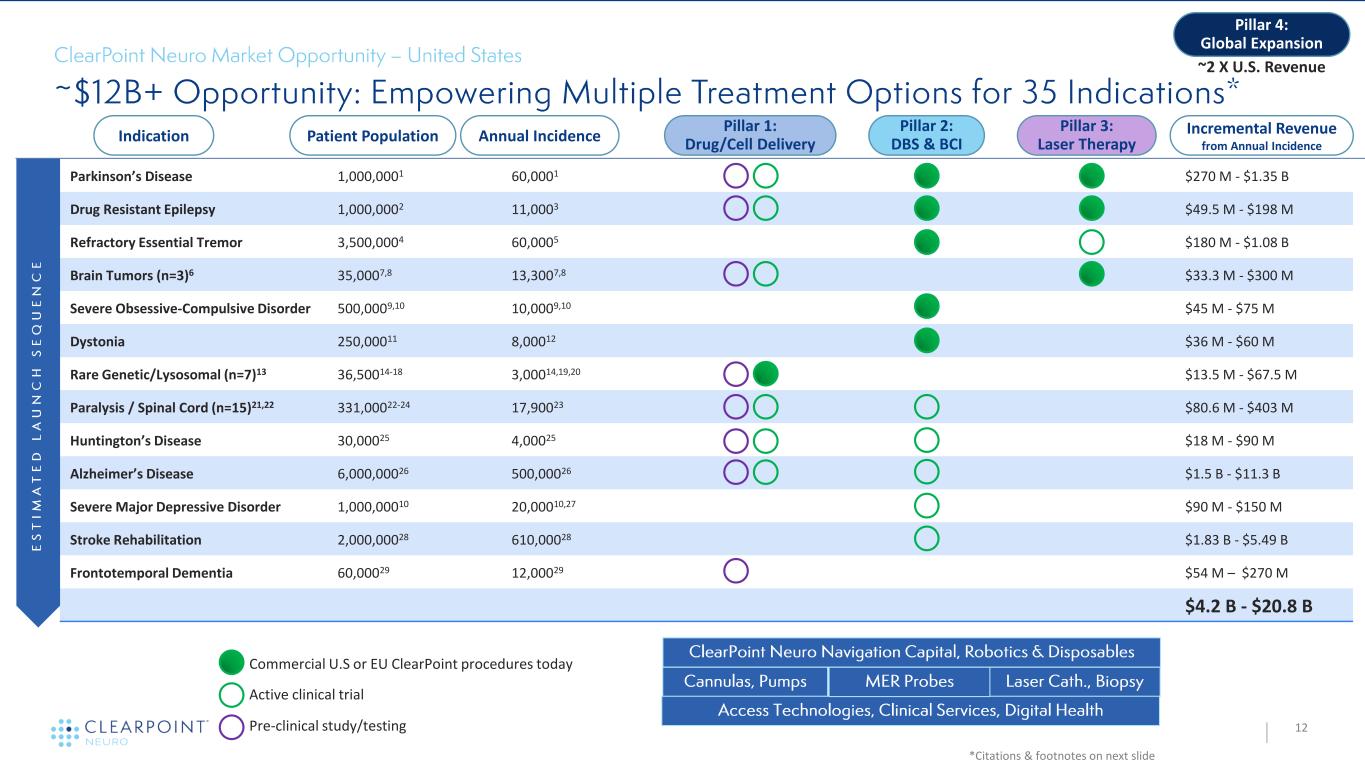 © 2 0 2 3 C L E A R P O I N T N E U R O 13 1. “Parkinson’s Disease Statistics,” Parkinson’s News Today, https://parkinsonsnewstoday.com/parkinsons-disease-statistics/#:~:text=An%20estimated%20seven%20to%2010,who%20are%2080%20and%20older 2. Neurona Therapeutics. (2021 November 4). Neurona Therapeutics Receives IND Clearance to Initiate Phase 1/2 Clinical Trial of Neural Cell Therapy NRTX-1001 in Chronic Focal Epilepsy Patients [Press release] https://www.neuronatherapeutics.com/wp-content/uploads/2021/11/2021_11_01_-INDClearance_FINALVersion.pdf 3. Asadi-Pooya AA, Stewart GR, Abrams DJ, Sharan A. Prevalence and Incidence of Drug-Resistant Mesial Temporal Lobe Epilepsy in the United States. World Neurosurg. 2017;99:662-666. 4. Zesiewicz TA, Chari A, Jahan I, Miller AM, Sullivan KL. Overview of essential tremor. Neuropsychiatr Dis Treat. 2010;6:401-408. Published 2010 Sep 7. 5. Diaz NL, Louis ED. Survey of medication usage patterns among essential tremor patients: movement disorder specialists vs. general neurologists. Parkinsonism Relat Disord. 2010;16(9):604-607. 6. Includes: Glioblastoma, Diffuse Intrinsic Pontine Glioma and deep small eloquent brain tumors. 7. “Glioblastoma Multiforme,” American Association of Neurological Surgeons, https://www.aans.org/en/Patients/Neurosurgical-Conditions-and-Treatments/Glioblastoma-Multiforme 8. “About DIPG/DMG,” DIPG/DMG Registry, https://dipgregistry.org/patients-families/about-dipg-dmg/ 9. Medtronic Clinical Summary – Reclaim DBS for Chronic Extreme OCD M947128A001. 10. Mantovani A, Lisanby SH. Brain stimulation in the treatment of anxiety disorders. In: Simpson HB, Neria Y, Lewis-Fernández R, Schneier F, eds. Anxiety Disorders: Theory, Research and Clinical Perspectives. Cambridge: Cambridge University Press; 2010:323-335. 11. https://www.aans.org/en/Patients/Neurosurgical-Conditions-and-Treatments/Dystonia 12. Medtronic DBS™ Therapy for Dystonia - Clinical Summary 2015. 13. Includes: AADC deficiency, Friedreich’s ataxia, Angelman syndrome, multiple system atrophy, metachromatic leukodystrophy, and spinocerebellar ataxia type 3. 14. "Multiple System Atrophy," Medscape, https://emedicine.medscape.com/article/1154583-overview#a6 15. PTC Therapeutics November 30, 2021 Corporate Presentation, https://ir.ptcbio.com/static-files/0fd5d54f-55b8-416b-8006-4eb4c0d82f45 16. “Spinocerebellar ataxia type 3,” Orphanet, https://www.orpha.net/consor/cgi-bin/OC_Exp.php?lng=EN&Expert=98757 17. Lysogene Corporate Presentation at 38th Annual J.P. Morgan Healthcare Conference on Jan 13, 2020, http://www.lysogene.com/wp-content/uploads/2020/01/jpm-2020-corporate-presentation_final.pdf 18. “Metachromatic Leukodystrophy,” National Organization of Rare Disorders, https://rarediseases.org/rare-diseases/metachromatic-leukodystrophy/ 19. “Aromatic L’Amino Acid Decarboxylase Deficiency,” National Organization for Rare Disorders, https://rarediseases.org/rare-diseases/aromatic-l-amino-acid-decarboxylase-deficiency/ 20. Puckett Y, Mallorga-Hernández A, Montaño AM. Epidemiology of mucopolysaccharidoses (MPS) in United States: challenges and opportunities. Orphanet J Rare Dis. 2021;16(1):241. Published 2021 May 29. 21. Includes: stroke, spinal cord injury, multiple sclerosis, cerebral palsy, other (traumatic brain injury, complications from surgery, amyotrophic lateral sclerosis, neurofibromatosis, Chiari malformation, syringomyelia, postpolio syndrome, spinal muscular atrophy, Friedreich’s ataxia, transverse myelitis, and spina bifida). 22. Armour BS, Courtney-Long EA, Fox MH, Fredine H, Cahill A. Prevalence and Causes of Paralysis-United States, 2013. Am J Public Health. 2016;106(10):1855-1857. 23. Wyndaele M, Wyndaele JJ. Incidence, prevalence and epidemiology of spinal cord injury: what learns a worldwide literature survey?. Spinal Cord. 2006;44(9):523-529. 24. National Spinal Cord Injury Statistical Center (NSCISC): 2020 Annual Report and 2021 Facts and Figures. https://www.nscisc.uab.edu/ 25. “Huntington’s Disease,” Mov Disord. 2019 Jun; 34(6): 858–865. 26. “Alzheimer’s Disease: Facts & Figures,” Brightfocus Foundation, https://www.brightfocus.org/alzheimers/article/alzheimers-disease-facts-figures 27. Goodman WK, Alterman RL. Deep brain stimulation for intractable psychiatric disorders. Annu Rev Med. 2012;63:511-524. 28. “Stroke Facts,” Center for Disease Control and Prevention, https://www.cdc.gov/stroke/facts.htm 29. Onyike CU, Diehl-Schmid J. The epidemiology of frontotemporal dementia. Int Rev Psychiatry. 2013;25(2):130-137.