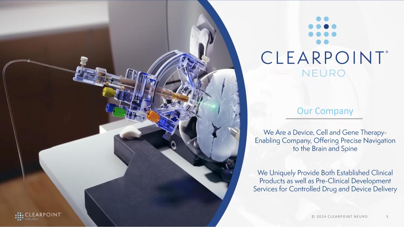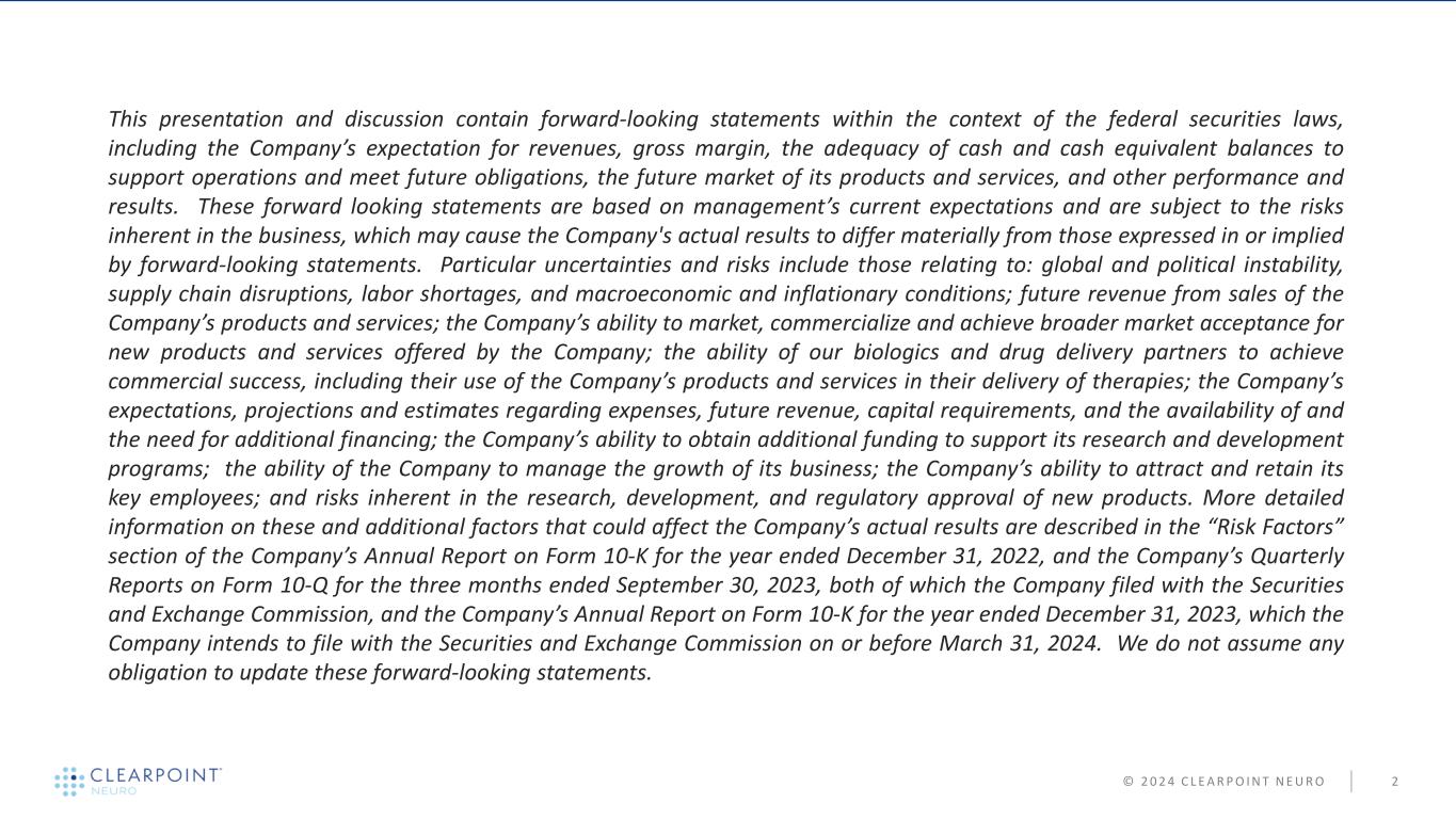 © 2 0 2 4 C L E A R P O I N T N E U R O 2 This presentation and discussion contain forward-looking statements within the context of the federal securities laws, including the Company’s expectation for revenues, gross margin, the adequacy of cash and cash equivalent balances to support operations and meet future obligations, the future market of its products and services, and other performance and results. These forward looking statements are based on management’s current expectations and are subject to the risks inherent in the business, which may cause the Company's actual results to differ materially from those expressed in or implied by forward-looking statements. Particular uncertainties and risks include those relating to: global and political instability, supply chain disruptions, labor shortages, and macroeconomic and inflationary conditions; future revenue from sales of the Company’s products and services; the Company’s ability to market, commercialize and achieve broader market acceptance for new products and services offered by the Company; the ability of our biologics and drug delivery partners to achieve commercial success, including their use of the Company’s products and services in their delivery of therapies; the Company’s expectations, projections and estimates regarding expenses, future revenue, capital requirements, and the availability of and the need for additional financing; the Company’s ability to obtain additional funding to support its research and development programs; the ability of the Company to manage the growth of its business; the Company’s ability to attract and retain its key employees; and risks inherent in the research, development, and regulatory approval of new products. More detailed information on these and additional factors that could affect the Company’s actual results are described in the “Risk Factors” section of the Company’s Annual Report on Form 10-K for the year ended December 31, 2022, and the Company’s Quarterly Reports on Form 10-Q for the three months ended September 30, 2023, both of which the Company filed with the Securities and Exchange Commission, and the Company’s Annual Report on Form 10-K for the year ended December 31, 2023, which the Company intends to file with the Securities and Exchange Commission on or before March 31, 2024. We do not assume any obligation to update these forward-looking statements.