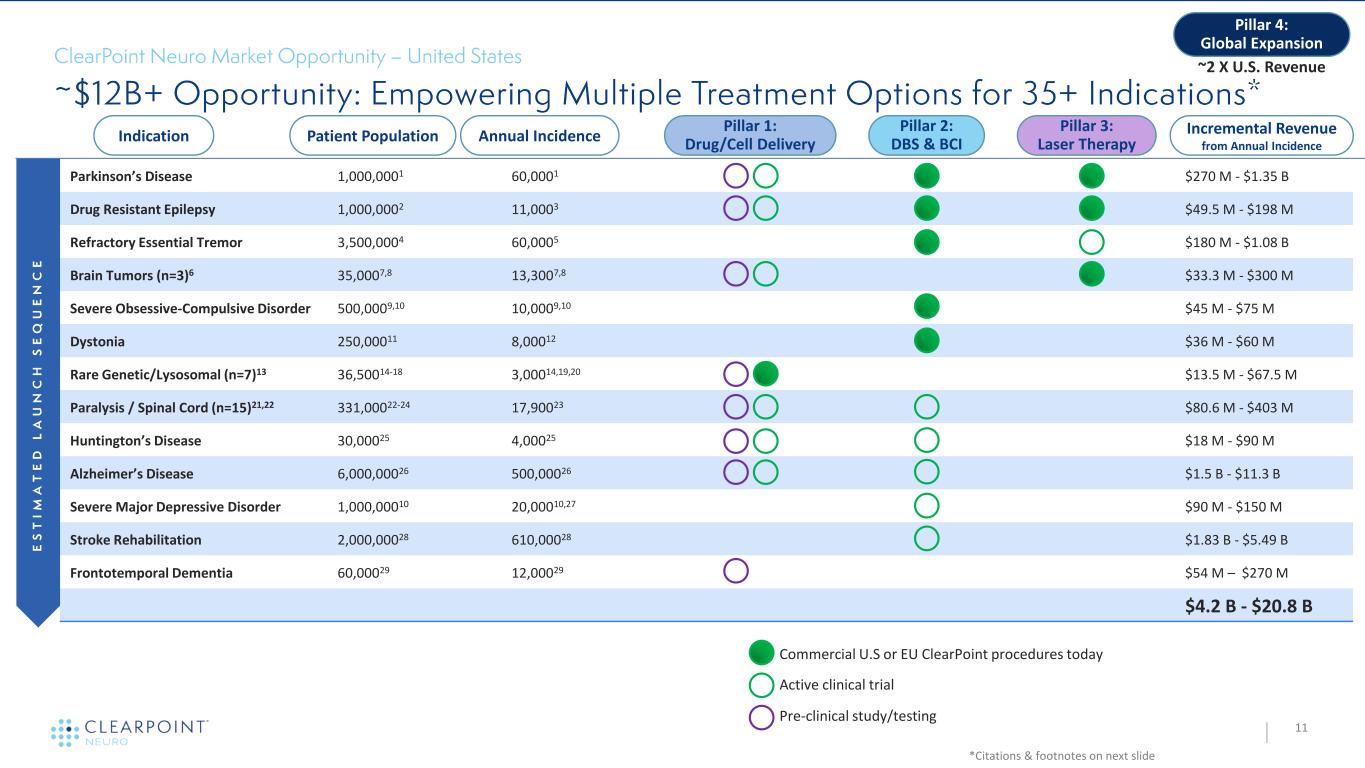© 2 0 2 4 C L E A R P O I N T N E U R O 12 1. “Parkinson’s Disease Statistics,” Parkinson’s News Today, https://parkinsonsnewstoday.com/parkinsons-disease-statistics/#:~:text=An%20estimated%20seven%20to%2010,who%20are%2080%20and%20older 2. Neurona Therapeutics. (2021 November 4). Neurona Therapeutics Receives IND Clearance to Initiate Phase 1/2 Clinical Trial of Neural Cell Therapy NRTX-1001 in Chronic Focal Epilepsy Patients [Press release] https://www.neuronatherapeutics.com/wp-content/uploads/2021/11/2021_11_01_-INDClearance_FINALVersion.pdf 3. Asadi-Pooya AA, Stewart GR, Abrams DJ, Sharan A. Prevalence and Incidence of Drug-Resistant Mesial Temporal Lobe Epilepsy in the United States. World Neurosurg. 2017;99:662-666. 4. Zesiewicz TA, Chari A, Jahan I, Miller AM, Sullivan KL. Overview of essential tremor. Neuropsychiatr Dis Treat. 2010;6:401-408. Published 2010 Sep 7. 5. Diaz NL, Louis ED. Survey of medication usage patterns among essential tremor patients: movement disorder specialists vs. general neurologists. Parkinsonism Relat Disord. 2010;16(9):604-607. 6. Includes: Glioblastoma, Diffuse Intrinsic Pontine Glioma and deep small eloquent brain tumors. 7. “Glioblastoma Multiforme,” American Association of Neurological Surgeons, https://www.aans.org/en/Patients/Neurosurgical-Conditions-and-Treatments/Glioblastoma-Multiforme 8. “About DIPG/DMG,” DIPG/DMG Registry, https://dipgregistry.org/patients-families/about-dipg-dmg/ 9. Medtronic Clinical Summary – Reclaim DBS for Chronic Extreme OCD M947128A001. 10. Mantovani A, Lisanby SH. Brain stimulation in the treatment of anxiety disorders. In: Simpson HB, Neria Y, Lewis-Fernández R, Schneier F, eds. Anxiety Disorders: Theory, Research and Clinical Perspectives. Cambridge: Cambridge University Press; 2010:323-335. 11. https://www.aans.org/en/Patients/Neurosurgical-Conditions-and-Treatments/Dystonia 12. Medtronic DBS™ Therapy for Dystonia - Clinical Summary 2015. 13. Includes: AADC deficiency, Friedreich’s ataxia, Angelman syndrome, multiple system atrophy, metachromatic leukodystrophy, and spinocerebellar ataxia type 3. 14. "Multiple System Atrophy," Medscape, https://emedicine.medscape.com/article/1154583-overview#a6 15. PTC Therapeutics November 30, 2021 Corporate Presentation, https://ir.ptcbio.com/static-files/0fd5d54f-55b8-416b-8006-4eb4c0d82f45 16. “Spinocerebellar ataxia type 3,” Orphanet, https://www.orpha.net/consor/cgi-bin/OC_Exp.php?lng=EN&Expert=98757 17. Lysogene Corporate Presentation at 38th Annual J.P. Morgan Healthcare Conference on Jan 13, 2020, http://www.lysogene.com/wp-content/uploads/2020/01/jpm-2020-corporate-presentation_final.pdf 18. “Metachromatic Leukodystrophy,” National Organization of Rare Disorders, https://rarediseases.org/rare-diseases/metachromatic-leukodystrophy/ 19. “Aromatic L’Amino Acid Decarboxylase Deficiency,” National Organization for Rare Disorders, https://rarediseases.org/rare-diseases/aromatic-l-amino-acid-decarboxylase-deficiency/ 20. Puckett Y, Mallorga-Hernández A, Montaño AM. Epidemiology of mucopolysaccharidoses (MPS) in United States: challenges and opportunities. Orphanet J Rare Dis. 2021;16(1):241. Published 2021 May 29. 21. Includes: stroke, spinal cord injury, multiple sclerosis, cerebral palsy, other (traumatic brain injury, complications from surgery, amyotrophic lateral sclerosis, neurofibromatosis, Chiari malformation, syringomyelia, postpolio syndrome, spinal muscular atrophy, Friedreich’s ataxia, transverse myelitis, and spina bifida). 22. Armour BS, Courtney-Long EA, Fox MH, Fredine H, Cahill A. Prevalence and Causes of Paralysis-United States, 2013. Am J Public Health. 2016;106(10):1855-1857. 23. Wyndaele M, Wyndaele JJ. Incidence, prevalence and epidemiology of spinal cord injury: what learns a worldwide literature survey?. Spinal Cord. 2006;44(9):523-529. 24. National Spinal Cord Injury Statistical Center (NSCISC): 2020 Annual Report and 2021 Facts and Figures. https://www.nscisc.uab.edu/ 25. “Huntington’s Disease,” Mov Disord. 2019 Jun; 34(6): 858–865. 26. “Alzheimer’s Disease: Facts & Figures,” Brightfocus Foundation, https://www.brightfocus.org/alzheimers/article/alzheimers-disease-facts-figures 27. Goodman WK, Alterman RL. Deep brain stimulation for intractable psychiatric disorders. Annu Rev Med. 2012;63:511-524. 28. “Stroke Facts,” Center for Disease Control and Prevention, https://www.cdc.gov/stroke/facts.htm 29. Onyike CU, Diehl-Schmid J. The epidemiology of frontotemporal dementia. Int Rev Psychiatry. 2013;25(2):130-137.