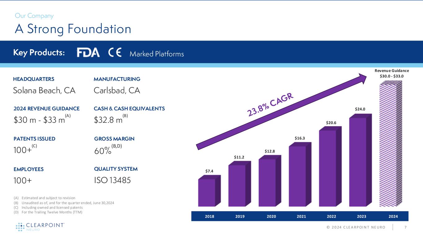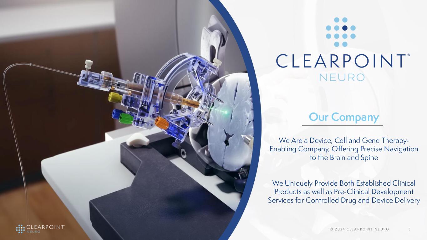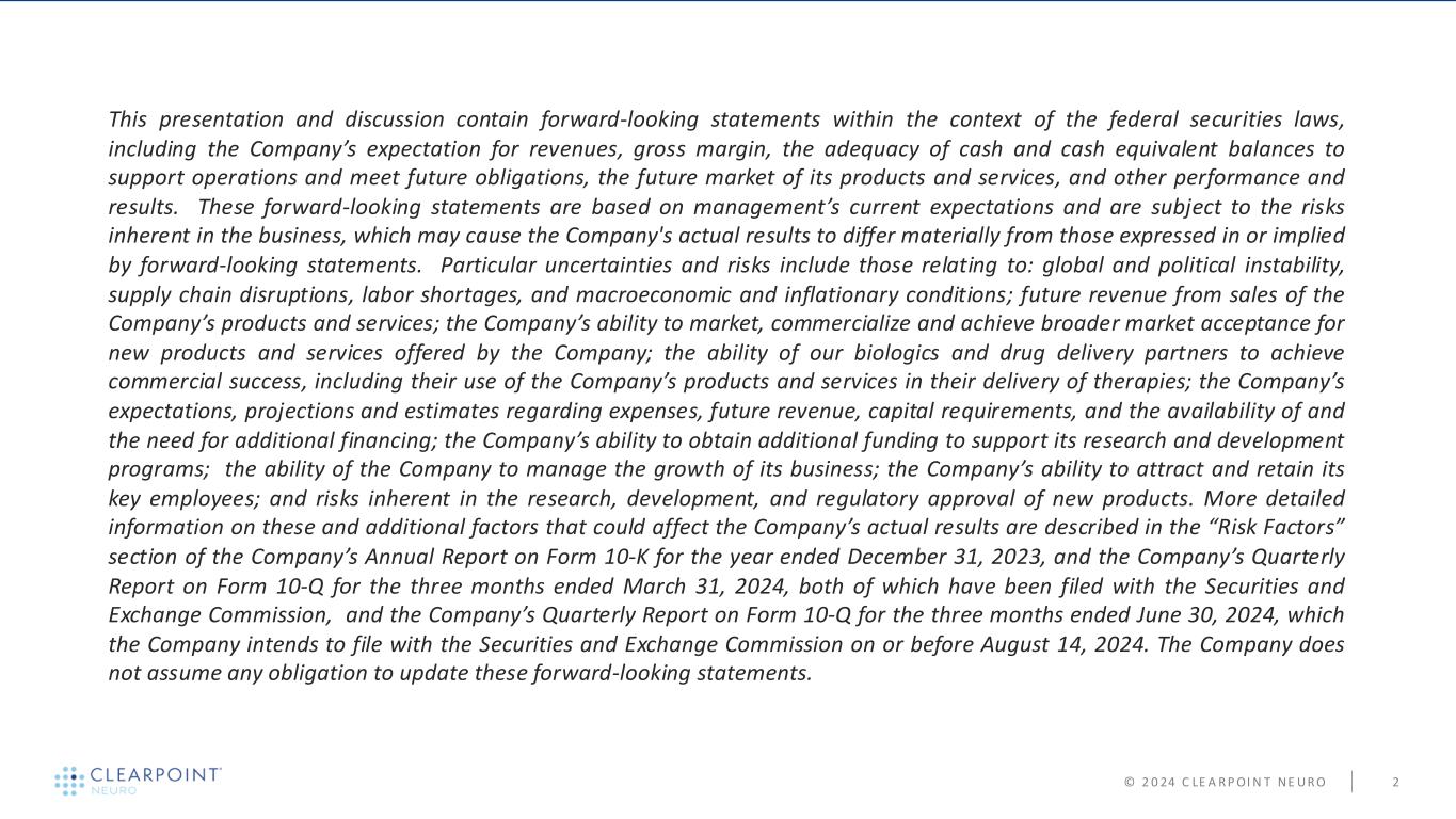 © 2 0 24 C LE A R P OI N T NE UR O 2 This presentation and discussion contain forward-looking statements within the context of the federal securities laws, including the Company’s expectation for revenues, gross margin, the adequacy of cash and cash equivalent balances to support operations and meet future obligations, the future market of its products and services, and other performance and results. These forward-looking statements are based on management’s current expectations and are subject to the risks inherent in the business, which may cause the Company's actual results to differ materially from those expressed in or implied by forward-looking statements. Particular uncertainties and risks include those relating to: global and political instability, supply chain disruptions, labor shortages, and macroeconomic and inflationary conditions; future revenue from sales of the Company’s products and services; the Company’s ability to market, commercialize and achieve broader market acceptance for new products and services offered by the Company; the ability of our biologics and drug delivery partners to achieve commercial success, including their use of the Company’s products and services in their delivery of therapies; the Company’s expectations, projections and estimates regarding expenses, future revenue, capital requirements, and the availability of and the need for additional financing; the Company’s ability to obtain additional funding to support its research and development programs; the ability of the Company to manage the growth of its business; the Company’s ability to attract and retain its key employees; and risks inherent in the research, development, and regulatory approval of new products. More detailed information on these and additional factors that could affect the Company’s actual results are described in the “Risk Factors” section of the Company’s Annual Report on Form 10-K for the year ended December 31, 2023, and the Company’s Quarterly Report on Form 10-Q for the three months ended March 31, 2024, both of which have been filed with the Securities and Exchange Commission, and the Company’s Quarterly Report on Form 10-Q for the three months ended June 30, 2024, which the Company intends to file with the Securities and Exchange Commission on or before August 14, 2024. The Company does not assume any obligation to update these forward-looking statements.