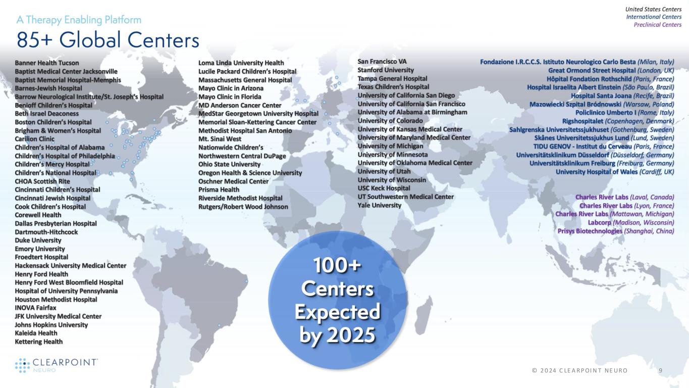 © 2 0 21 C LE A R P OI N T NE UR O 8 • 1,500 sq. ft Class 8 Clean Room with Expansion Capability • 1,300 sq. ft Dedicated R&D Lab Space • ISO 13485/MDSAP/EU MDR Certified Quality System • Successful Audit Outcomes from Global Regulatory Bodies and Pharma • Training Facility with over 100 Surgeons and Pharma Scientist Visitors 8© 2 0 24 C LE A R P OI N T NE UR O