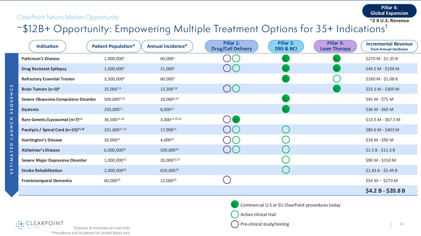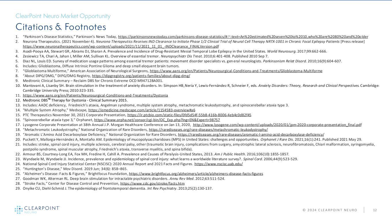 © 2 0 24 C LE A R P OI N T NE UR O 12 1. “Parkinson’s Disease Statistics,” Parkinson’s News Today, https://parkinsonsnewstoday.com/parkinsons-disease-statistics/#:~:text=An%20estimated%20seven%20to%2010,who%20are%2080%20and%20o lder 2. Neurona Therapeutics. (2021 November 4). Neurona Therapeutics Receives IND Clearance to Initiate Phase 1/2 Clinical Trial of Neural Cell Therapy NRTX-1001 in Chronic Focal Epilepsy Patients [Press release] https://www.neuronatherapeutics.com/wp-content/uploads/2021/11/2021_11_01_-INDClearance_FINALVersion.pdf 3. Asadi-Pooya AA, Stewart GR, Abrams DJ, Sharan A. Prevalence and Incidence of Drug-Resistant Mesial Temporal Lobe Epilepsy in the United States. World Neurosurg. 2017;99:662-666. 4. Zesiewicz TA, Chari A, Jahan I, Miller AM, Sullivan KL. Overview of essential tremor. Neuropsychiatr Dis Treat. 2010;6:401-408. Published 2010 Sep 7. 5. Diaz NL, Louis ED. Survey of medication usage patterns among essential tremor patients: movement disorder specialists vs. gen eral neurologists. Parkinsonism Relat Disord. 2010;16(9):604-607. 6. Includes: Glioblastoma, Diffuse Intrinsic Pontine Glioma and deep small eloquent brain tumors. 7. “Glioblastoma Multiforme,” American Association of Neurological Surgeons, https://www.aans.org/en/Patients/Neurosurgical-Conditions-and-Treatments/Glioblastoma-Multiforme 8. “About DIPG/DMG,” DIPG/DMG Registry, https://dipgregistry.org/patients-families/about-dipg-dmg/ 9. Medtronic Clinical Summary – Reclaim DBS for Chronic Extreme OCD M947128A001. 10. Mantovani A, Lisanby SH. Brain stimulation in the treatment of anxiety disorders. In: Simpson HB, Neria Y, Lewis-Fernández R, Schneier F, eds. Anxiety Disorders: Theory, Research and Clinical Perspectives. Cambridge: Cambridge University Press; 2010:323-335. 11. https://www.aans.org/en/Patients/Neurosurgical-Conditions-and-Treatments/Dystonia 12. Medtronic DBS Therapy for Dystonia - Clinical Summary 2015. 13. Includes: AADC deficiency, Friedreich’s ataxia, Angelman syndrome, multiple system atrophy, metachromatic leukodystrophy, an d spinocerebellar ataxia type 3. 14. "Multiple System Atrophy," Medscape, https://emedicine.medscape.com/article/1154583-overview#a6 15. PTC Therapeutics November 30, 2021 Corporate Presentation, https://ir.ptcbio.com/static-files/0fd5d54f-55b8-416b-8006-4eb4c0d82f45 16. “Spinocerebellar ataxia type 3,” Orphanet, https://www.orpha.net/consor/cgi-bin/OC_Exp.php?lng=EN&Expert=98757 17. Lysogene Corporate Presentation at 38th Annual J.P. Morgan Healthcare Conference on Jan 13, 2020, http://www.lysogene.com/wp-content/uploads/2020/01/jpm-2020-corporate-presentation_final.pdf 18. “Metachromatic Leukodystrophy,” National Organization of Rare Disorders, https://rarediseases.org/rare-diseases/metachromatic-leukodystrophy/ 19. “Aromatic L’Amino Acid Decarboxylase Deficiency,” National Organization for Rare Disorders, https://rarediseases.org/rare-diseases/aromatic-l-amino-acid-decarboxylase-deficiency/ 20. Puckett Y, Mallorga-Hernández A, Montaño AM. Epidemiology of mucopolysaccharidoses (MPS) in United States: challenges and opportunities. Orphanet J Rare Dis. 2021;16(1):241. Published 2021 May 29. 21. Includes: stroke, spinal cord injury, multiple sclerosis, cerebral palsy, other (traumatic brain injury, complications from surgery, amy otrophic lateral sclerosis, neurofibromatosis, Chiari malformation, syringomyelia, postpolio syndrome, spinal muscular atrophy, Friedreich’s ataxia, transverse myelitis, and spina bifida). 22. Armour BS, Courtney-Long EA, Fox MH, Fredine H, Cahill A. Prevalence and Causes of Paralysis-United States, 2013. Am J Public Health. 2016;106(10):1855-1857. 23. Wyndaele M, Wyndaele JJ. Incidence, prevalence and epidemiology of spinal cord injury: what learns a worldwide literature survey?. Spinal Cord. 2006;44(9):523-529. 24. National Spinal Cord Injury Statistical Center (NSCISC): 2020 Annual Report and 2021 Facts and Figures. https://www.nscisc.uab.edu/ 25. “Huntington’s Disease,” Mov Disord. 2019 Jun; 34(6): 858–865. 26. “Alzheimer’s Disease: Facts & Figures,” Brightfocus Foundation, https://www.brightfocus.org/alzheimers/article/alzheimers-disease-facts-figures 27. Goodman WK, Alterman RL. Deep brain stimulation for intractable psychiatric disorders. Annu Rev Med. 2012;63:511-524. 28. “Stroke Facts,” Center for Disease Control and Prevention, https://www.cdc.gov/stroke/facts.htm 29. Onyike CU, Diehl-Schmid J. The epidemiology of frontotemporal dementia. Int Rev Psychiatry. 2013;25(2):130-137.
