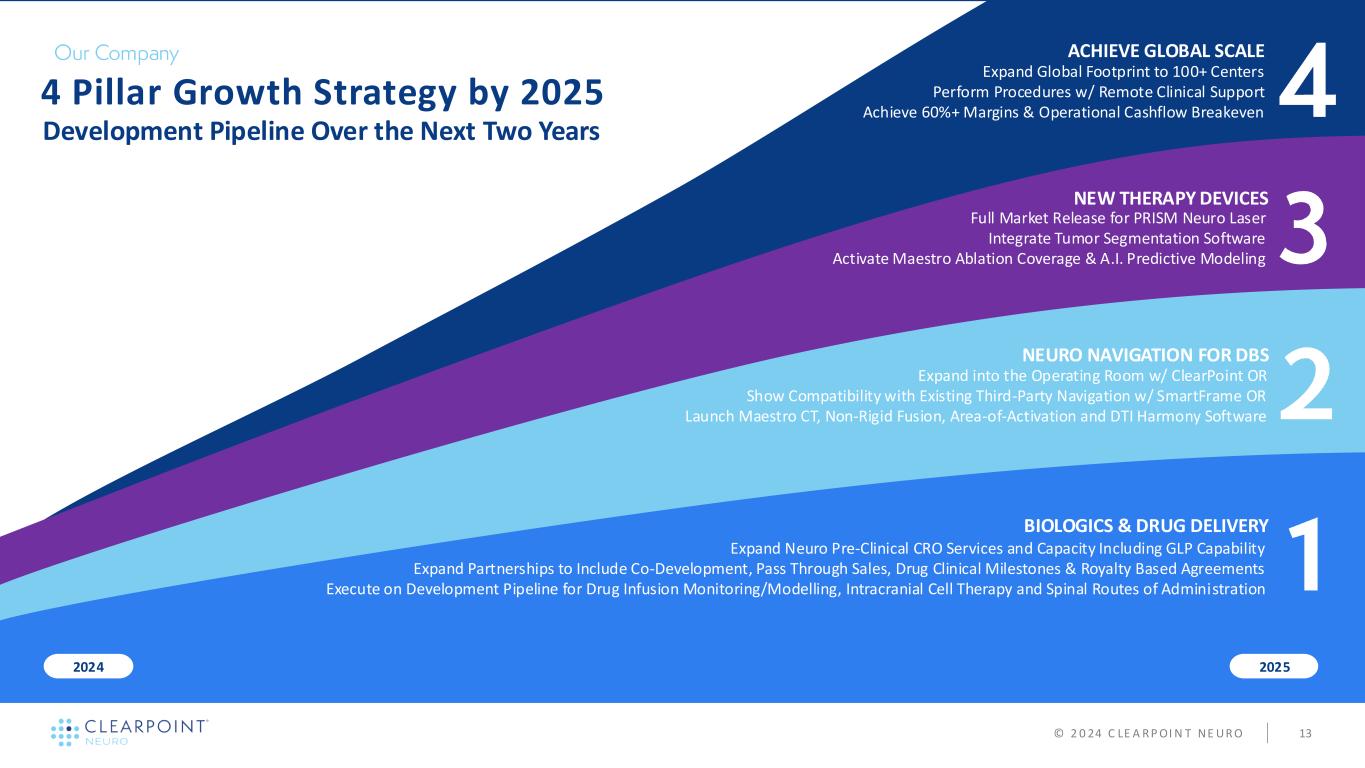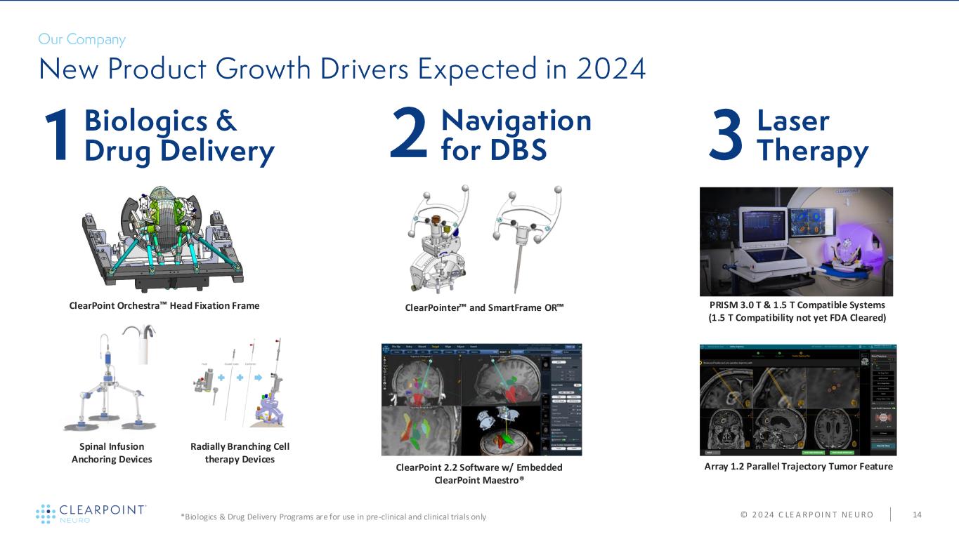 NEW THERAPY DEVICES NEURO NAVIGATION FOR DBS BIOLOGICS & DRUG DELIVERY 20252024 4 Pillar Growth Strategy by 2025 Development Pipeline Over the Next Two Years Full Market Release for PRISM Neuro Laser Integrate Tumor Segmentation Software Activate Maestro Ablation Coverage & A.I. Predictive Modeling ACHIEVE GLOBAL SCALE Expand Global Footprint to 100+ Centers Perform Procedures w/ Remote Clinical Support Achieve 60%+ Margins & Operational Cashflow Breakeven © 2 0 24 C LE A R P OI N T NE UR O 13 Expand Neuro Pre-Clinical CRO Services and Capacity Including GLP Capability Expand Partnerships to Include Co-Development, Pass Through Sales, Drug Clinical Milestones & Royalty Based Agreements Execute on Development Pipeline for Drug Infusion Monitoring/Modelling, Intracranial Cell Therapy and Spinal Routes of Administration Expand into the Operating Room w/ ClearPoint OR Show Compatibility with Existing Third-Party Navigation w/ SmartFrame OR Launch Maestro CT, Non-Rigid Fusion, Area-of-Activation and DTI Harmony Software