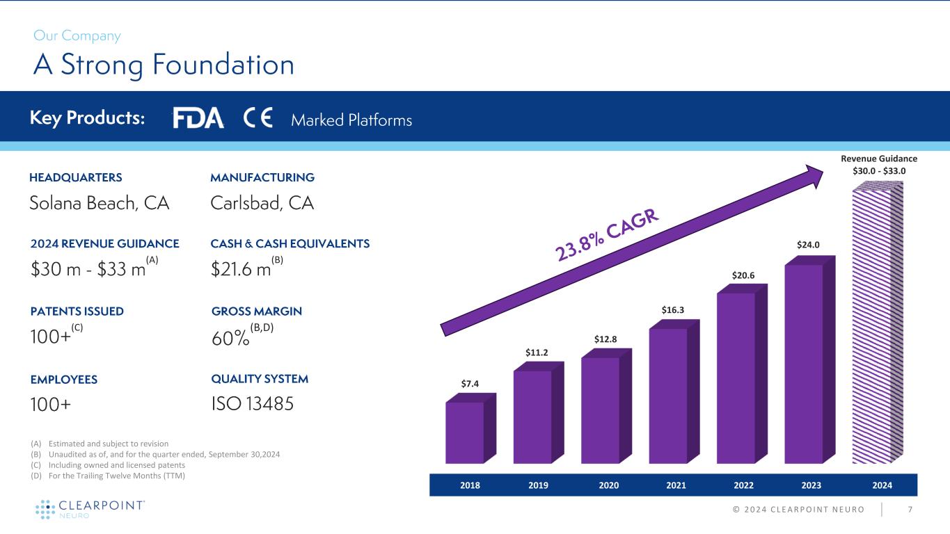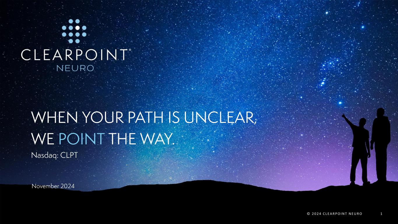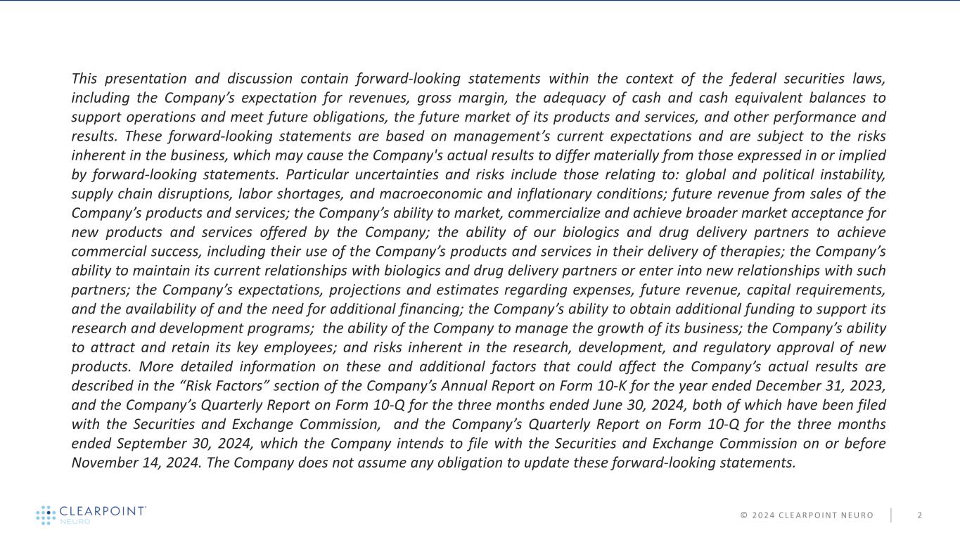 © 2 0 2 4 C L E A R P O I N T N E U R O 2 This presentation and discussion contain forward-looking statements within the context of the federal securities laws, including the Company’s expectation for revenues, gross margin, the adequacy of cash and cash equivalent balances to support operations and meet future obligations, the future market of its products and services, and other performance and results. These forward-looking statements are based on management’s current expectations and are subject to the risks inherent in the business, which may cause the Company's actual results to differ materially from those expressed in or implied by forward-looking statements. Particular uncertainties and risks include those relating to: global and political instability, supply chain disruptions, labor shortages, and macroeconomic and inflationary conditions; future revenue from sales of the Company’s products and services; the Company’s ability to market, commercialize and achieve broader market acceptance for new products and services offered by the Company; the ability of our biologics and drug delivery partners to achieve commercial success, including their use of the Company’s products and services in their delivery of therapies; the Company’s ability to maintain its current relationships with biologics and drug delivery partners or enter into new relationships with such partners; the Company’s expectations, projections and estimates regarding expenses, future revenue, capital requirements, and the availability of and the need for additional financing; the Company’s ability to obtain additional funding to support its research and development programs; the ability of the Company to manage the growth of its business; the Company’s ability to attract and retain its key employees; and risks inherent in the research, development, and regulatory approval of new products. More detailed information on these and additional factors that could affect the Company’s actual results are described in the “Risk Factors” section of the Company’s Annual Report on Form 10-K for the year ended December 31, 2023, and the Company’s Quarterly Report on Form 10-Q for the three months ended June 30, 2024, both of which have been filed with the Securities and Exchange Commission, and the Company’s Quarterly Report on Form 10-Q for the three months ended September 30, 2024, which the Company intends to file with the Securities and Exchange Commission on or before November 14, 2024. The Company does not assume any obligation to update these forward-looking statements.