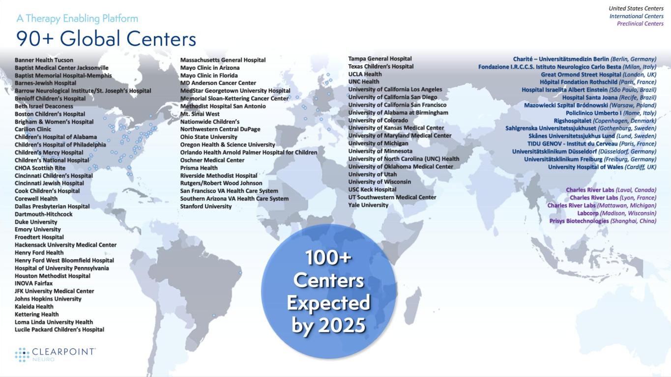 © 2 0 2 4 C L E A R P O I N T N E U R O 12 1. “Parkinson’s Disease Statistics,” Parkinson’s News Today, https://parkinsonsnewstoday.com/parkinsons-disease-statistics/#:~:text=An%20estimated%20seven%20to%2010,who%20are%2080%20and%20older 2. Neurona Therapeutics. (2021 November 4). Neurona Therapeutics Receives IND Clearance to Initiate Phase 1/2 Clinical Trial of Neural Cell Therapy NRTX-1001 in Chronic Focal Epilepsy Patients [Press release] https://www.neuronatherapeutics.com/wp-content/uploads/2021/11/2021_11_01_-INDClearance_FINALVersion.pdf 3. Asadi-Pooya AA, Stewart GR, Abrams DJ, Sharan A. Prevalence and Incidence of Drug-Resistant Mesial Temporal Lobe Epilepsy in the United States. World Neurosurg. 2017;99:662-666. 4. Zesiewicz TA, Chari A, Jahan I, Miller AM, Sullivan KL. Overview of essential tremor. Neuropsychiatr Dis Treat. 2010;6:401-408. Published 2010 Sep 7. 5. Diaz NL, Louis ED. Survey of medication usage patterns among essential tremor patients: movement disorder specialists vs. general neurologists. Parkinsonism Relat Disord. 2010;16(9):604-607. 6. Includes: Glioblastoma, Diffuse Intrinsic Pontine Glioma and deep small eloquent brain tumors. 7. “Glioblastoma Multiforme,” American Association of Neurological Surgeons, https://www.aans.org/en/Patients/Neurosurgical-Conditions-and-Treatments/Glioblastoma-Multiforme 8. “About DIPG/DMG,” DIPG/DMG Registry, https://dipgregistry.org/patients-families/about-dipg-dmg/ 9. Medtronic Clinical Summary – Reclaim DBS for Chronic Extreme OCD M947128A001. 10. Mantovani A, Lisanby SH. Brain stimulation in the treatment of anxiety disorders. In: Simpson HB, Neria Y, Lewis-Fernández R, Schneier F, eds. Anxiety Disorders: Theory, Research and Clinical Perspectives. Cambridge: Cambridge University Press; 2010:323-335. 11. https://www.aans.org/en/Patients/Neurosurgical-Conditions-and-Treatments/Dystonia 12. Medtronic DBS Therapy for Dystonia - Clinical Summary 2015. 13. Includes: AADC deficiency, Friedreich’s ataxia, Angelman syndrome, multiple system atrophy, metachromatic leukodystrophy, and spinocerebellar ataxia type 3. 14. "Multiple System Atrophy," Medscape, https://emedicine.medscape.com/article/1154583-overview#a6 15. PTC Therapeutics November 30, 2021 Corporate Presentation, https://ir.ptcbio.com/static-files/0fd5d54f-55b8-416b-8006-4eb4c0d82f45 16. “Spinocerebellar ataxia type 3,” Orphanet, https://www.orpha.net/consor/cgi-bin/OC_Exp.php?lng=EN&Expert=98757 17. Lysogene Corporate Presentation at 38th Annual J.P. Morgan Healthcare Conference on Jan 13, 2020, http://www.lysogene.com/wp-content/uploads/2020/01/jpm-2020-corporate-presentation_final.pdf 18. “Metachromatic Leukodystrophy,” National Organization of Rare Disorders, https://rarediseases.org/rare-diseases/metachromatic-leukodystrophy/ 19. “Aromatic L’Amino Acid Decarboxylase Deficiency,” National Organization for Rare Disorders, https://rarediseases.org/rare-diseases/aromatic-l-amino-acid-decarboxylase-deficiency/ 20. Puckett Y, Mallorga-Hernández A, Montaño AM. Epidemiology of mucopolysaccharidoses (MPS) in United States: challenges and opportunities. Orphanet J Rare Dis. 2021;16(1):241. Published 2021 May 29. 21. Includes: stroke, spinal cord injury, multiple sclerosis, cerebral palsy, other (traumatic brain injury, complications from surgery, amyotrophic lateral sclerosis, neurofibromatosis, Chiari malformation, syringomyelia, postpolio syndrome, spinal muscular atrophy, Friedreich’s ataxia, transverse myelitis, and spina bifida). 22. Armour BS, Courtney-Long EA, Fox MH, Fredine H, Cahill A. Prevalence and Causes of Paralysis-United States, 2013. Am J Public Health. 2016;106(10):1855-1857. 23. Wyndaele M, Wyndaele JJ. Incidence, prevalence and epidemiology of spinal cord injury: what learns a worldwide literature survey?. Spinal Cord. 2006;44(9):523-529. 24. National Spinal Cord Injury Statistical Center (NSCISC): 2020 Annual Report and 2021 Facts and Figures. https://www.nscisc.uab.edu/ 25. “Huntington’s Disease,” Mov Disord. 2019 Jun; 34(6): 858–865. 26. “Alzheimer’s Disease: Facts & Figures,” Brightfocus Foundation, https://www.brightfocus.org/alzheimers/article/alzheimers-disease-facts-figures 27. Goodman WK, Alterman RL. Deep brain stimulation for intractable psychiatric disorders. Annu Rev Med. 2012;63:511-524. 28. “Stroke Facts,” Center for Disease Control and Prevention, https://www.cdc.gov/stroke/facts.htm 29. Onyike CU, Diehl-Schmid J. The epidemiology of frontotemporal dementia. Int Rev Psychiatry. 2013;25(2):130-137.