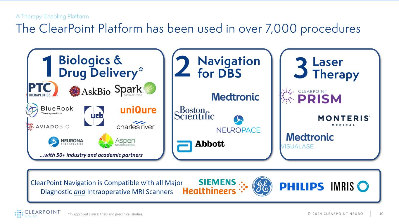© 2 0 2 4 C L E A R P O I N T N E U R O 10 VISUALASE ClearPoint Navigation is Compatible with all Major Diagnostic and Intraoperative MRI Scanners …with 50+ industry and academic partners *In approved clinical trials and preclinical studies.