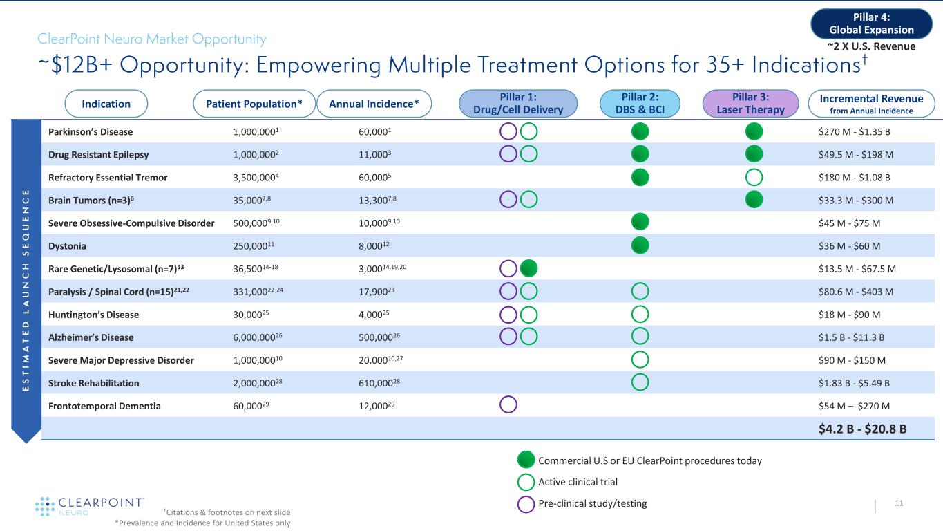 Parkinson’s Disease 1,000,0001 60,0001 • $270 M - $1.35 B Drug Resistant Epilepsy 1,000,0002 11,0003 • $49.5 M - $198 M Refractory Essential Tremor 3,500,0004 60,0005 $180 M - $1.08 B Brain Tumors (n=3)6 35,0007,8 13,3007,8 $33.3 M - $300 M Severe Obsessive-Compulsive Disorder 500,0009,10 10,0009,10 $45 M - $75 M Dystonia 250,00011 8,00012 $36 M - $60 M Rare Genetic/Lysosomal (n=7)13 36,50014-18 3,00014,19,20 $13.5 M - $67.5 M Paralysis / Spinal Cord (n=15)21,22 331,00022-24 17,90023 $80.6 M - $403 M Huntington’s Disease 30,00025 4,00025 $18 M - $90 M Alzheimer’s Disease 6,000,00026 500,00026 $1.5 B - $11.3 B Severe Major Depressive Disorder 1,000,00010 20,00010,27 $90 M - $150 M Stroke Rehabilitation 2,000,00028 610,00028 $1.83 B - $5.49 B Frontotemporal Dementia 60,00029 12,00029 $54 M – $270 M $4.2 B - $20.8 B 11 †Citations & footnotes on next slide *Prevalence and Incidence for United States only Indication Patient Population* Annual Incidence* Pillar 2: DBS & BCI Pillar 3: Laser Therapy Pillar 1: Drug/Cell Delivery Incremental Revenue from Annual Incidence Pillar 4: Global Expansion Commercial U.S or EU ClearPoint procedures today ~2 X U.S. Revenue Active clinical trial Pre-clinical study/testing