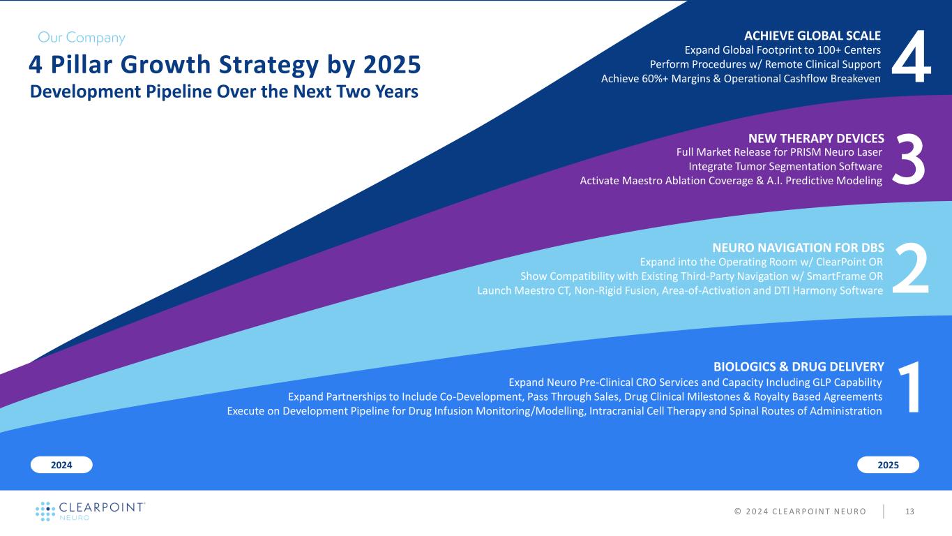 NEW THERAPY DEVICES NEURO NAVIGATION FOR DBS BIOLOGICS & DRUG DELIVERY 20252024 4 Pillar Growth Strategy by 2025 Development Pipeline Over the Next Two Years Full Market Release for PRISM Neuro Laser Integrate Tumor Segmentation Software Activate Maestro Ablation Coverage & A.I. Predictive Modeling ACHIEVE GLOBAL SCALE Expand Global Footprint to 100+ Centers Perform Procedures w/ Remote Clinical Support Achieve 60%+ Margins & Operational Cashflow Breakeven © 2 0 2 4 C L E A R P O I N T N E U R O 13 Expand Neuro Pre-Clinical CRO Services and Capacity Including GLP Capability Expand Partnerships to Include Co-Development, Pass Through Sales, Drug Clinical Milestones & Royalty Based Agreements Execute on Development Pipeline for Drug Infusion Monitoring/Modelling, Intracranial Cell Therapy and Spinal Routes of Administration Expand into the Operating Room w/ ClearPoint OR Show Compatibility with Existing Third-Party Navigation w/ SmartFrame OR Launch Maestro CT, Non-Rigid Fusion, Area-of-Activation and DTI Harmony Software