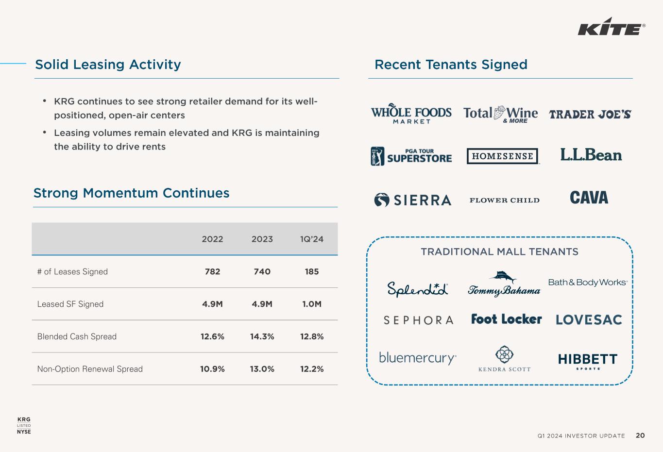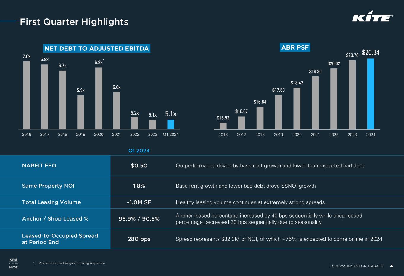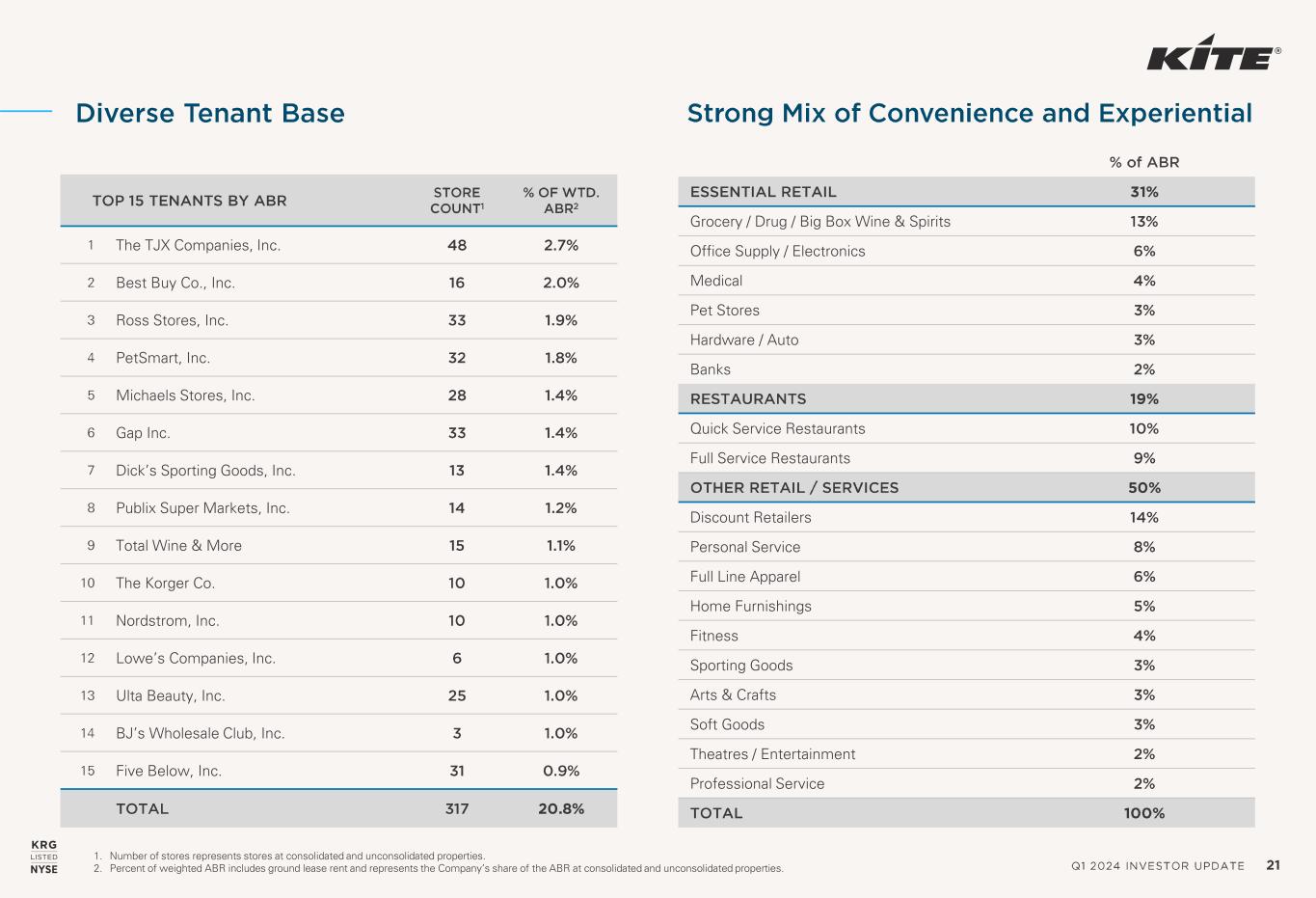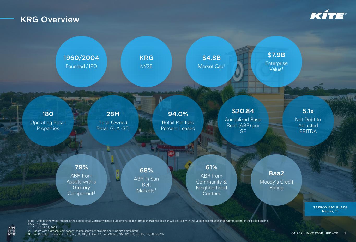 Note: Unless otherwise indicated, the source of all Company data is publicly available information that has been or will be filed with the Securities and Exchange Commission for the period ending March 31, 2024. 1. As of April 29, 2024. 2. Assets with a grocery component include centers with a big box wine and spirits store. 3. Sun Belt states include AL, AR, AZ, CA, CO, FL, GA, KY, LA, MS, NC, NM, NV, OK, SC, TN, TX, UT and VA. Founded / IPO NYSE Market Cap1 Enterprise Value1 Operating Retail Properties Total Owned Retail GLA (SF) Retail Portfolio Percent Leased Annualized Base Rent (ABR) per SF Net Debt to Adjusted EBITDA ABR from Assets with a Grocery Component2 ABR in Sun Belt Markets3 ABR from Community & Neighborhood Centers Moody’s Credit Rating