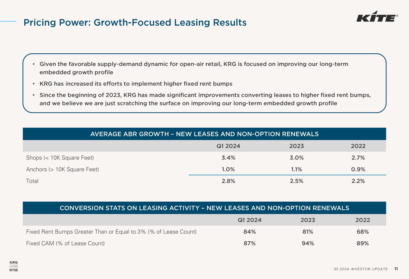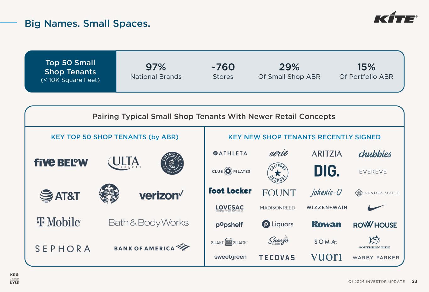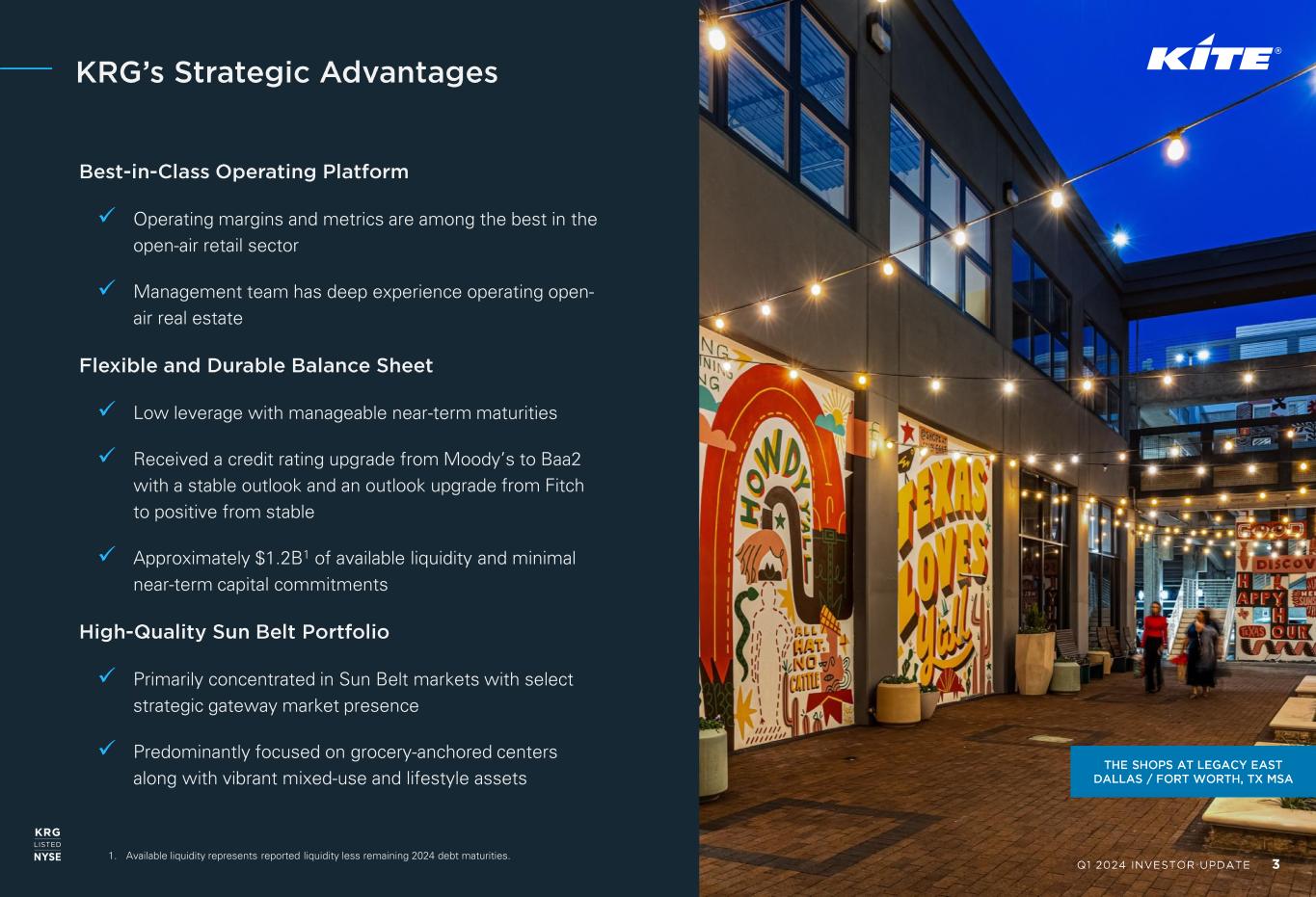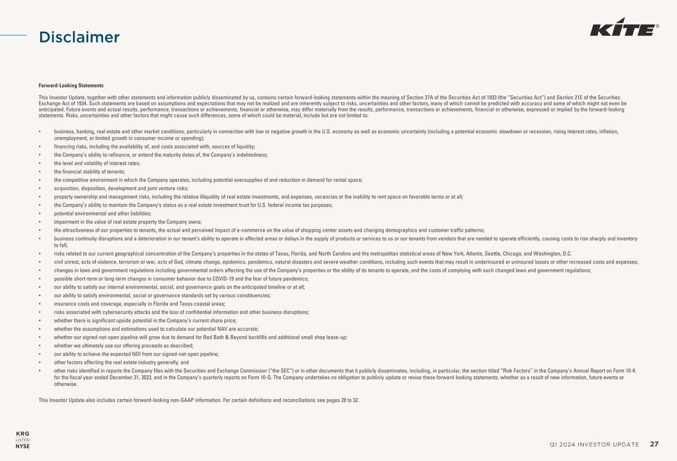 Forward-Looking Statements This Investor Update, together with other statements and information publicly disseminated by us, contains certain forward-looking statements within the meaning of Section 27A of the Securities Act of 1933 (the “Securities Act”) and Section 21E of the Securities Exchange Act of 1934. Such statements are based on assumptions and expectations that may not be realized and are inherently subject to risks, uncertainties and other factors, many of which cannot be predicted with accuracy and some of which might not even be anticipated. Future events and actual results, performance, transactions or achievements, financial or otherwise, may differ materially from the results, performance, transactions or achievements, financial or otherwise, expressed or implied by the forward-looking statements. Risks, uncertainties and other factors that might cause such differences, some of which could be material, include but are not limited to: • business, banking, real estate and other market conditions, particularly in connection with low or negative growth in the U.S. economy as well as economic uncertainty (including a potential economic slowdown or recession, rising interest rates, inflation, unemployment, or limited growth in consumer income or spending); • financing risks, including the availability of, and costs associated with, sources of liquidity; • the Company’s ability to refinance, or extend the maturity dates of, the Company’s indebtedness; • the level and volatility of interest rates; • the financial stability of tenants; • the competitive environment in which the Company operates, including potential oversupplies of and reduction in demand for rental space; • acquisition, disposition, development and joint venture risks; • property ownership and management risks, including the relative illiquidity of real estate investments, and expenses, vacancies or the inability to rent space on favorable terms or at all; • the Company’s ability to maintain the Company’s status as a real estate investment trust for U.S. federal income tax purposes; • potential environmental and other liabilities; • impairment in the value of real estate property the Company owns; • the attractiveness of our properties to tenants, the actual and perceived impact of e-commerce on the value of shopping center assets and changing demographics and customer traffic patterns; • business continuity disruptions and a deterioration in our tenant’s ability to operate in affected areas or delays in the supply of products or services to us or our tenants from vendors that are needed to operate efficiently, causing costs to rise sharply and inventory to fall; • risks related to our current geographical concentration of the Company’s properties in the states of Texas, Florida, and North Carolina and the metropolitan statistical areas of New York, Atlanta, Seattle, Chicago, and Washington, D.C. • civil unrest, acts of violence, terrorism or war, acts of God, climate change, epidemics, pandemics, natural disasters and severe weather conditions, including such events that may result in underinsured or uninsured losses or other increased costs and expenses; • changes in laws and government regulations including governmental orders affecting the use of the Company’s properties or the ability of its tenants to operate, and the costs of complying with such changed laws and government regulations; • possible short-term or long-term changes in consumer behavior due to COVID-19 and the fear of future pandemics; • our ability to satisfy our internal environmental, social, and governance goals on the anticipated timeline or at all; • our ability to satisfy environmental, social or governance standards set by various constituencies; • insurance costs and coverage, especially in Florida and Texas coastal areas; • risks associated with cybersecurity attacks and the loss of confidential information and other business disruptions; • whether there is significant upside potential in the Company’s current share price; • whether the assumptions and estimations used to calculate our potential NAV are accurate; • whether our signed-not-open pipeline will grow due to demand for Bed Bath & Beyond backfills and additional small shop lease-up; • whether we ultimately use our offering proceeds as described; • our ability to achieve the expected NOI from our signed-not-open pipeline; • other factors affecting the real estate industry generally; and • other risks identified in reports the Company files with the Securities and Exchange Commission (“the SEC”) or in other documents that it publicly disseminates, including, in particular, the section titled “Risk Factors” in the Company’s Annual Report on Form 10-K for the fiscal year ended December 31, 2023, and in the Company’s quarterly reports on Form 10-Q. The Company undertakes no obligation to publicly update or revise these forward-looking statements, whether as a result of new information, future events or otherwise. This Investor Update also includes certain forward-looking non-GAAP information. For certain definitions and reconciliations see pages 28 to 32.