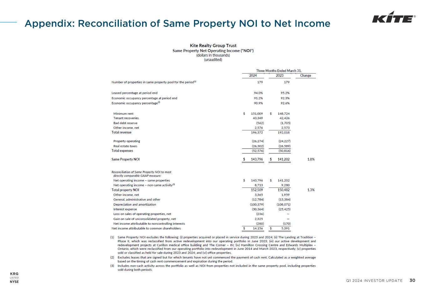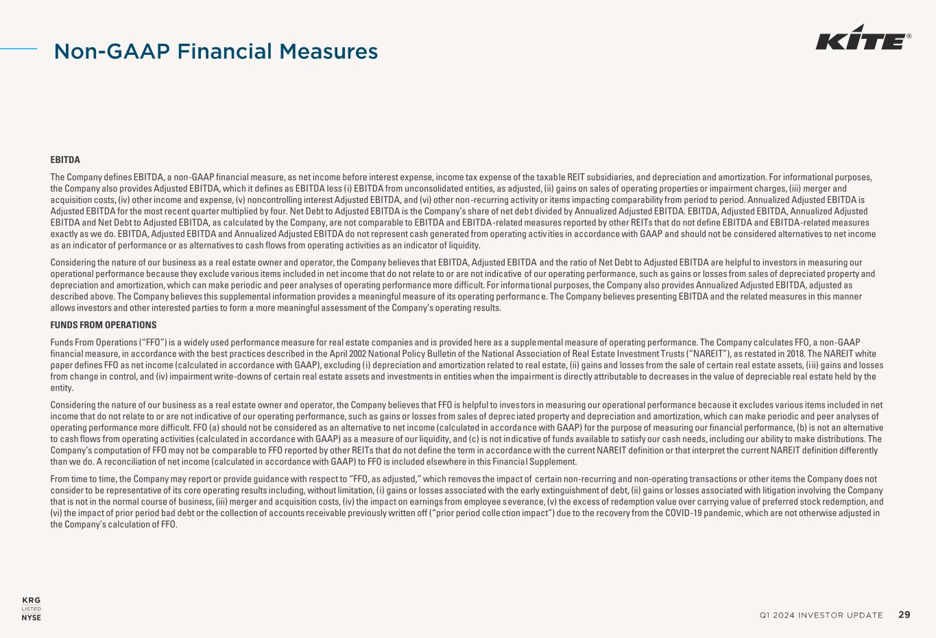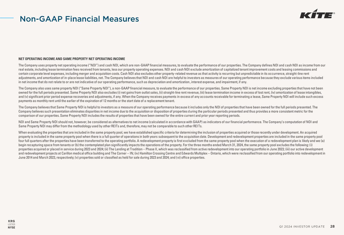 NET OPERATING INCOME AND SAME PROPERTY NET OPERATING INCOME The Company uses property net operating income (“NOI”) and cash NOI, which are non-GAAP financial measures, to evaluate the performance of our properties. The Company defines NOI and cash NOI as income from our real estate, including lease termination fees received from tenants, less our property operating expenses. NOI and cash NOI exclude amortization of capitalized tenant improvement costs and leasing commissions and certain corporate level expenses, including merger and acquisition costs. Cash NOI also excludes other property-related revenue as that activity is recurring but unpredictable in its occurrence, straight-line rent adjustments, and amortization of in-place lease liabilities, net. The Company believes that NOI and cash NOI are helpful to investors as measures of our operating performance because they exclude various items included in net income that do not relate to or are not indicative of our operating performance, such as depreciation and amortization, interest expense, and impairment, if any. The Company also uses same property NOI (“Same Property NOI”), a non-GAAP financial measure, to evaluate the performance of our properties. Same Property NOI is net income excluding properties that have not been owned for the full periods presented. Same Property NOI also excludes (i) net gains from outlot sales, (ii) straight-line rent revenue, (iii) lease termination income in excess of lost rent, (iv) amortization of lease intangibles, and (v) significant prior period expense recoveries and adjustments, if any. When the Company receives payments in excess of any accounts receivable for terminating a lease, Same Property NOI will include such excess payments as monthly rent until the earlier of the expiration of 12 months or the start date of a replacement tenant. The Company believes that Same Property NOI is helpful to investors as a measure of our operating performance because it includes only the NOI of properties that have been owned for the full periods presented. The Company believes such presentation eliminates disparities in net income due to the acquisition or disposition of properties during the particular periods presented and thus provides a more consistent metric for the comparison of our properties. Same Property NOI includes the results of properties that have been owned for the entire current and prior year reporting periods. NOI and Same Property NOI should not, however, be considered as alternatives to net income (calculated in accordance with GAAP) as indicators of our financial performance. The Company’s computation of NOI and Same Property NOI may differ from the methodology used by other REITs and, therefore, may not be comparable to such other REITs. When evaluating the properties that are included in the same property pool, we have established specific criteria for determining the inclusion of properties acquired or those recently under development. An acquired property is included in the same property pool when there is a full quarter of operations in both years subsequent to the acquisition date. Development and redevelopment properties are included in the same property pool four full quarters after the properties have been transferred to the operating portfolio. A redevelopment property is first excluded from the same property pool when the execution of a redevelopment plan is likely and we (a) begin recapturing space from tenants or (b) the contemplated plan significantly impacts the operations of the property. For the three months ended March 31, 2024, the same property pool excludes the following: (i) properties acquired or placed in service during 2023 and 2024; (ii) The Landing at Tradition – Phase II, which was reclassified from active redevelopment into our operating portfolio in June 2023; (iii) our active development and redevelopment projects at Carillon medical office building and The Corner – IN; (iv) Hamilton Crossing Centre and Edwards Multiplex – Ontario, which were reclassified from our operating portfolio into redevelopment in June 2014 and March 2023, respectively; (v) properties sold or classified as held for sale during 2023 and 2024; and (vi) office properties.