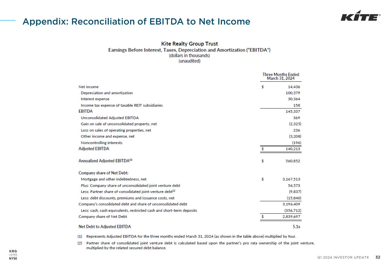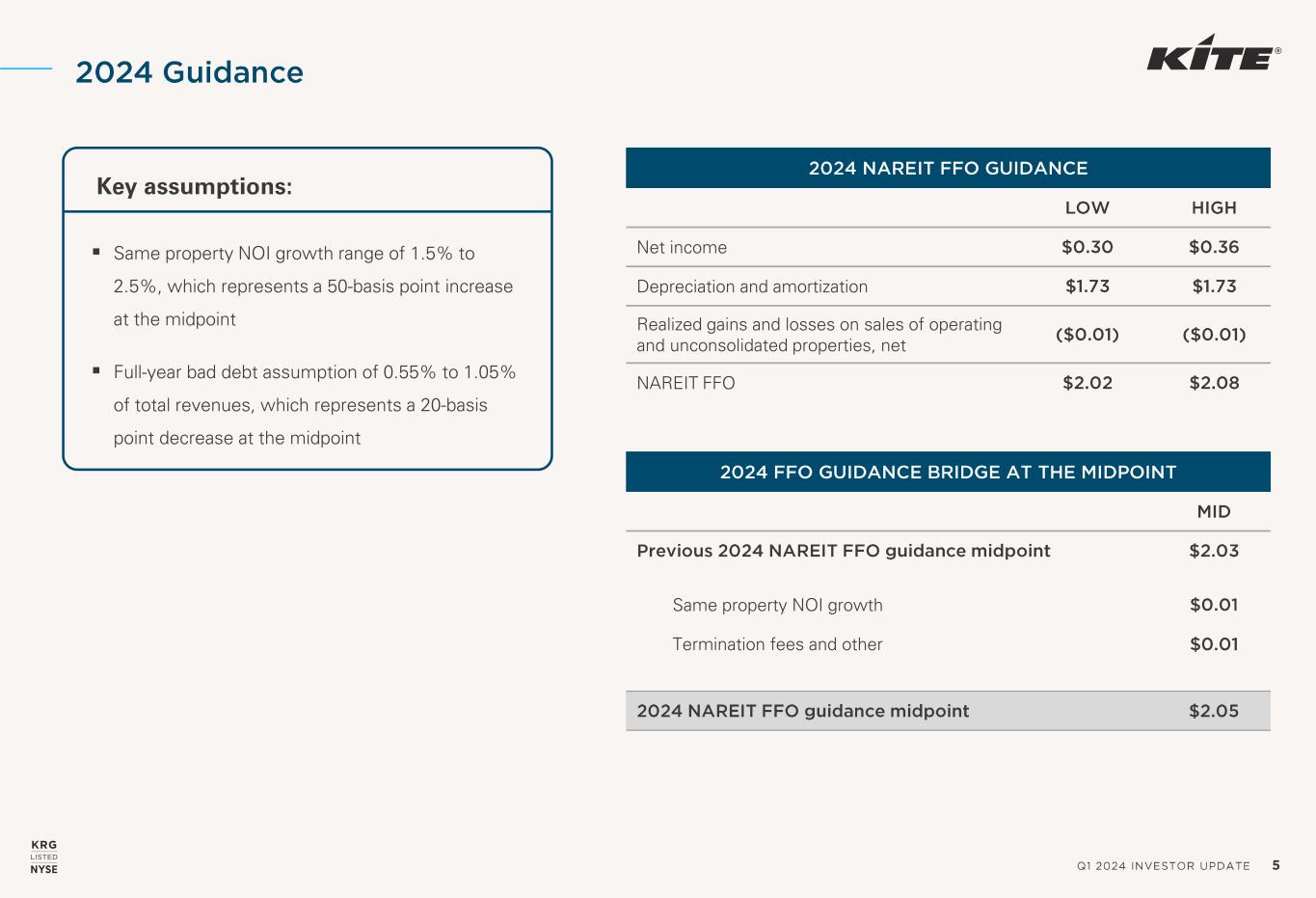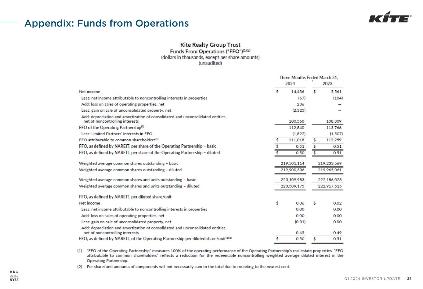NET OPERATING INCOME AND SAME PROPERTY NET OPERATING INCOME The Company uses property net operating income (“NOI”) and cash NOI, which are non-GAAP financial measures, to evaluate the performance of our properties. The Company defines NOI and cash NOI as income from our real estate, including lease termination fees received from tenants, less our property operating expenses. NOI and cash NOI exclude amortization of capitalized tenant improvement costs and leasing commissions and certain corporate level expenses, including merger and acquisition costs. Cash NOI also excludes other property-related revenue as that activity is recurring but unpredictable in its occurrence, straight-line rent adjustments, and amortization of in-place lease liabilities, net. The Company believes that NOI and cash NOI are helpful to investors as measures of our operating performance because they exclude various items included in net income that do not relate to or are not indicative of our operating performance, such as depreciation and amortization, interest expense, and impairment, if any. The Company also uses same property NOI (“Same Property NOI”), a non-GAAP financial measure, to evaluate the performance of our properties. Same Property NOI is net income excluding properties that have not been owned for the full periods presented. Same Property NOI also excludes (i) net gains from outlot sales, (ii) straight-line rent revenue, (iii) lease termination income in excess of lost rent, (iv) amortization of lease intangibles, and (v) significant prior period expense recoveries and adjustments, if any. When the Company receives payments in excess of any accounts receivable for terminating a lease, Same Property NOI will include such excess payments as monthly rent until the earlier of the expiration of 12 months or the start date of a replacement tenant. The Company believes that Same Property NOI is helpful to investors as a measure of our operating performance because it includes only the NOI of properties that have been owned for the full periods presented. The Company believes such presentation eliminates disparities in net income due to the acquisition or disposition of properties during the particular periods presented and thus provides a more consistent metric for the comparison of our properties. Same Property NOI includes the results of properties that have been owned for the entire current and prior year reporting periods. NOI and Same Property NOI should not, however, be considered as alternatives to net income (calculated in accordance with GAAP) as indicators of our financial performance. The Company’s computation of NOI and Same Property NOI may differ from the methodology used by other REITs and, therefore, may not be comparable to such other REITs. When evaluating the properties that are included in the same property pool, we have established specific criteria for determining the inclusion of properties acquired or those recently under development. An acquired property is included in the same property pool when there is a full quarter of operations in both years subsequent to the acquisition date. Development and redevelopment properties are included in the same property pool four full quarters after the properties have been transferred to the operating portfolio. A redevelopment property is first excluded from the same property pool when the execution of a redevelopment plan is likely and we (a) begin recapturing space from tenants or (b) the contemplated plan significantly impacts the operations of the property. For the three months ended March 31, 2024, the same property pool excludes the following: (i) properties acquired or placed in service during 2023 and 2024; (ii) The Landing at Tradition – Phase II, which was reclassified from active redevelopment into our operating portfolio in June 2023; (iii) our active development and redevelopment projects at Carillon medical office building and The Corner – IN; (iv) Hamilton Crossing Centre and Edwards Multiplex – Ontario, which were reclassified from our operating portfolio into redevelopment in June 2014 and March 2023, respectively; (v) properties sold or classified as held for sale during 2023 and 2024; and (vi) office properties.
