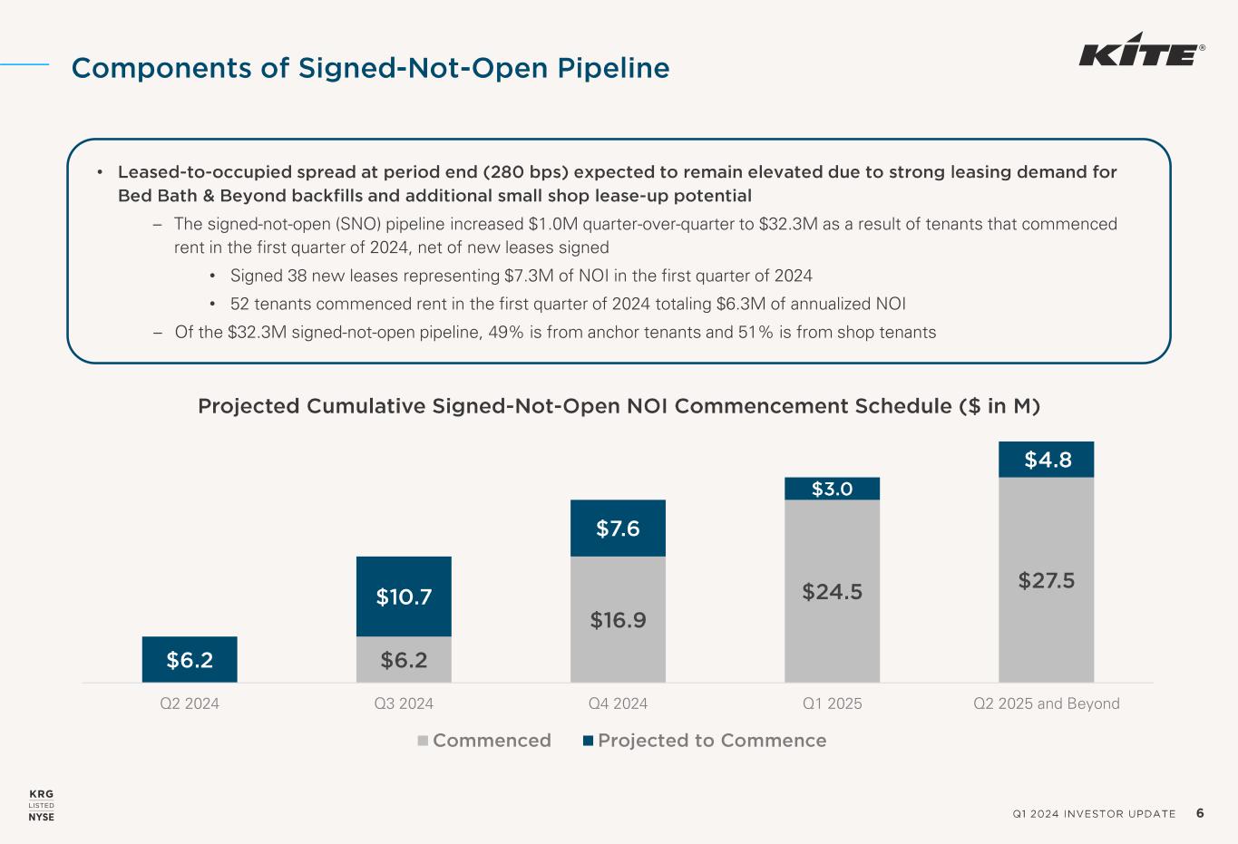 • – The signed-not-open (SNO) pipeline increased $1.0M quarter-over-quarter to $32.3M as a result of tenants that commenced rent in the first quarter of 2024, net of new leases signed • Signed 38 new leases representing $7.3M of NOI in the first quarter of 2024 • 52 tenants commenced rent in the first quarter of 2024 totaling $6.3M of annualized NOI – Of the $32.3M signed-not-open pipeline, 49% is from anchor tenants and 51% is from shop tenants Q2 2024 Q3 2024 Q4 2024 Q1 2025 Q2 2025 and Beyond