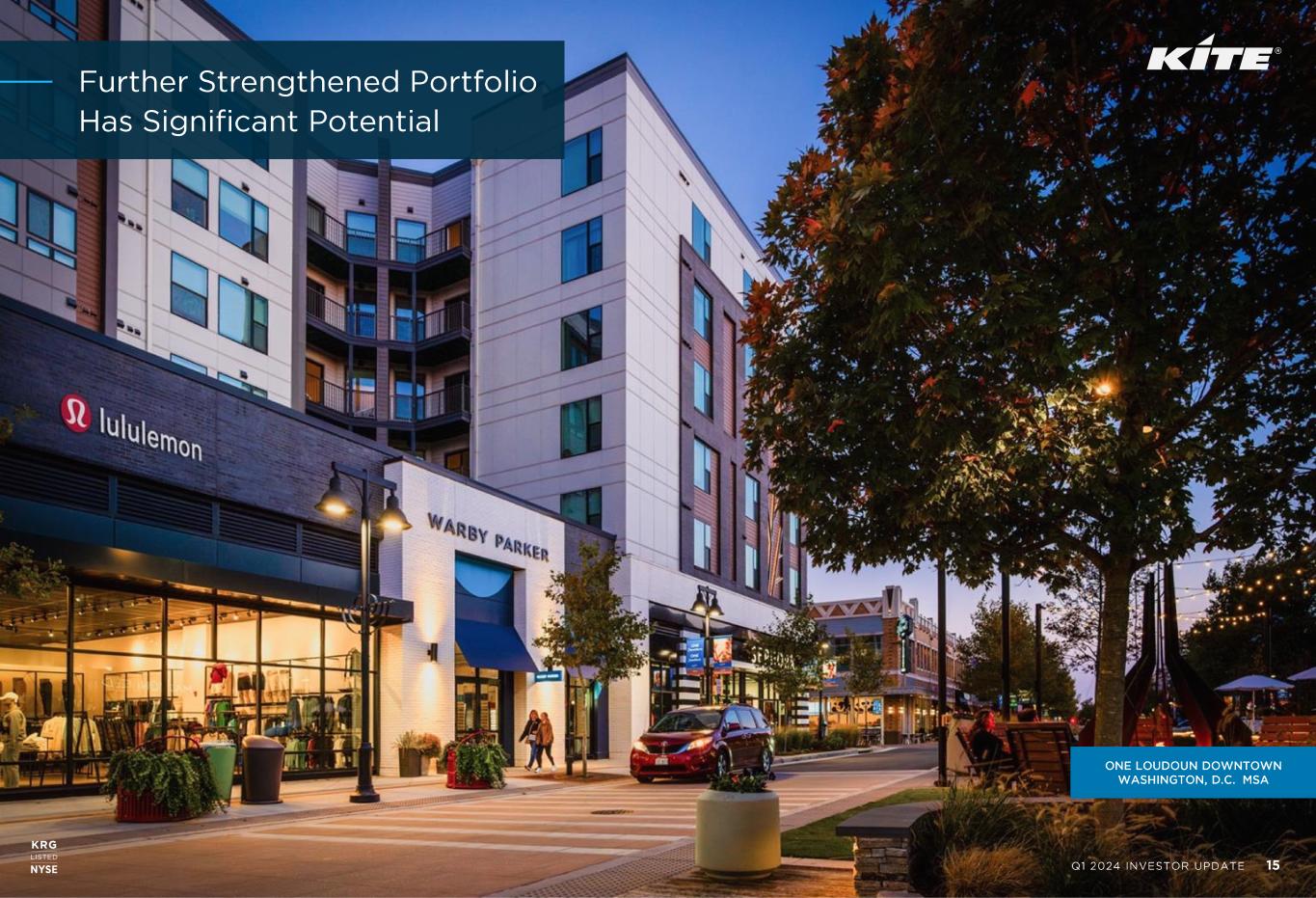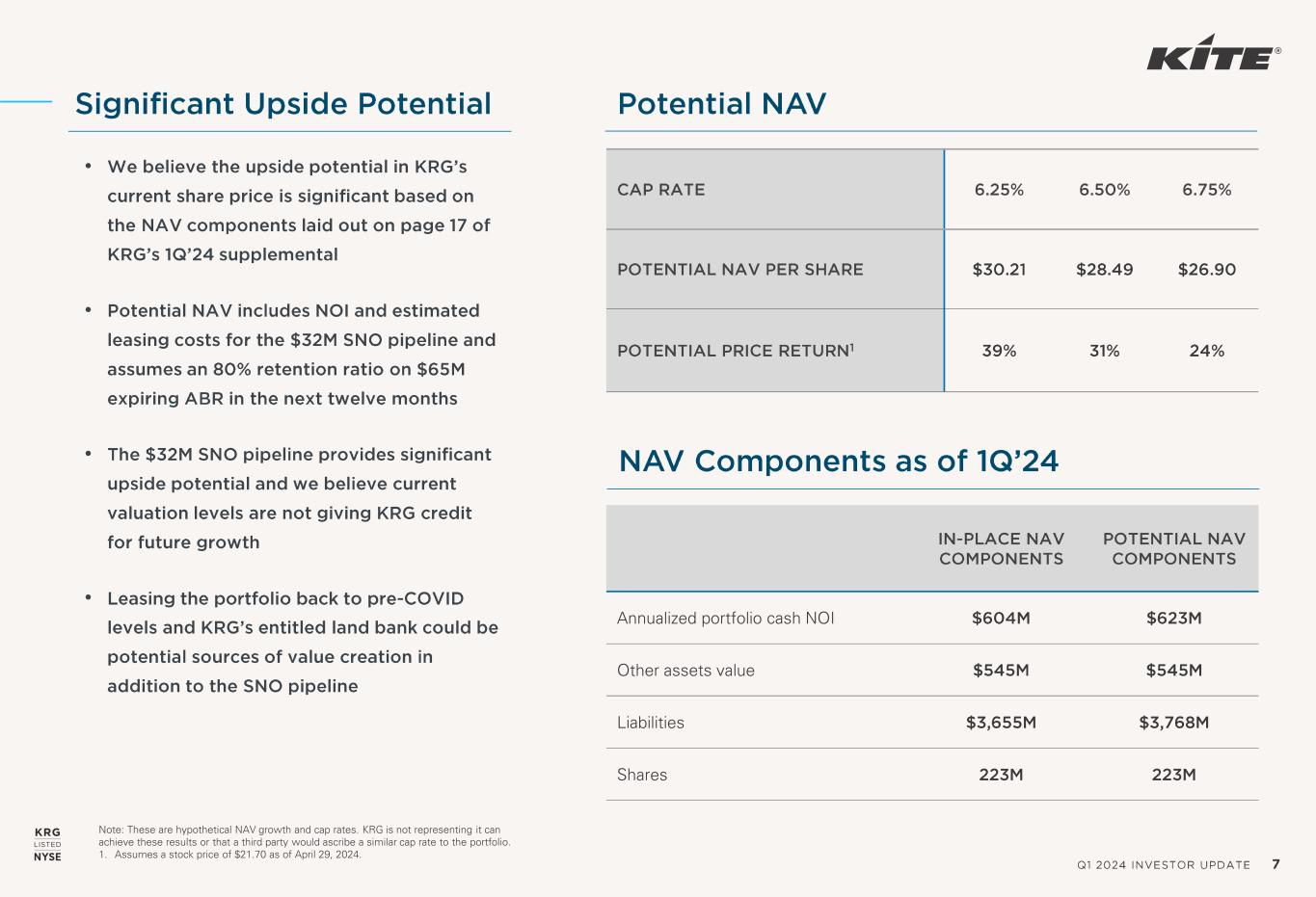 • • • • Annualized portfolio cash NOI Other assets value Liabilities Shares Note: These are hypothetical NAV growth and cap rates. KRG is not representing it can achieve these results or that a third party would ascribe a similar cap rate to the portfolio. 1. Assumes a stock price of $21.70 as of April 29, 2024.