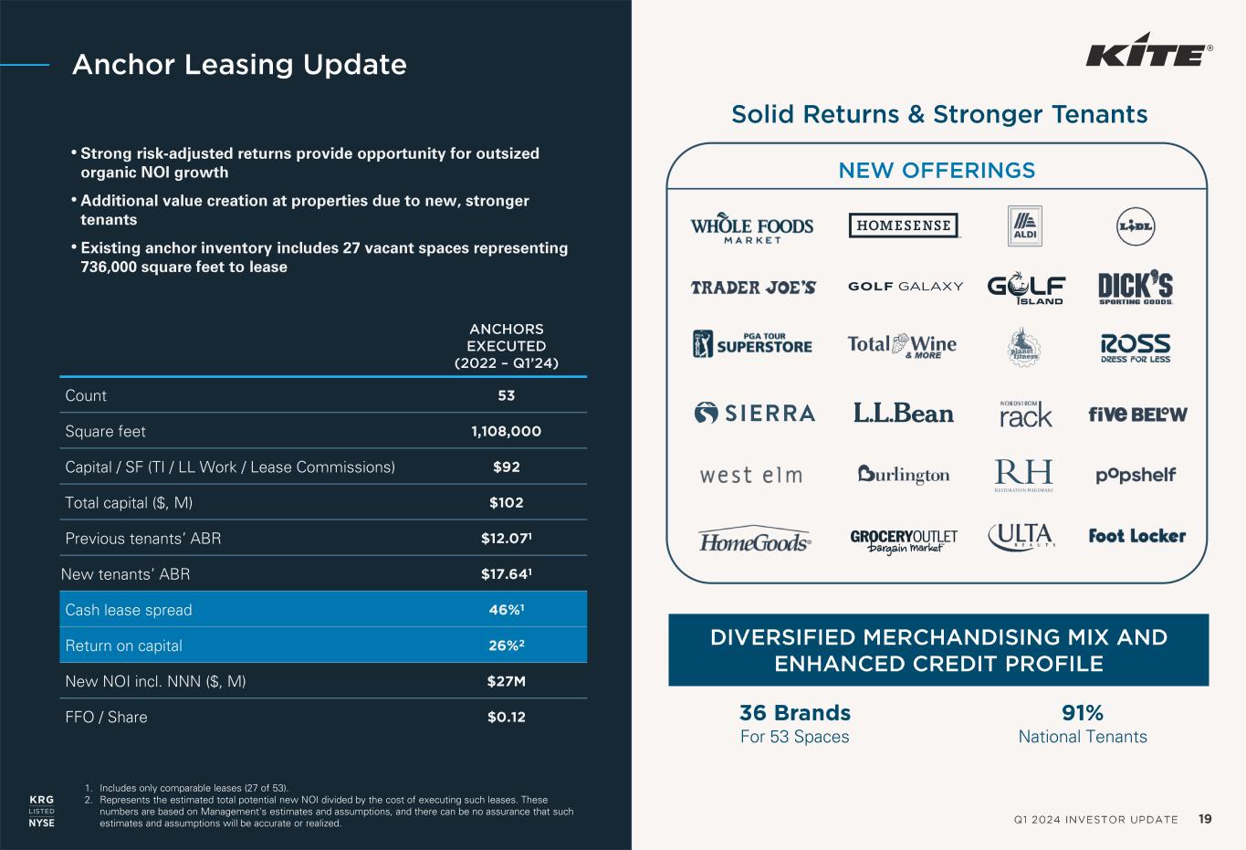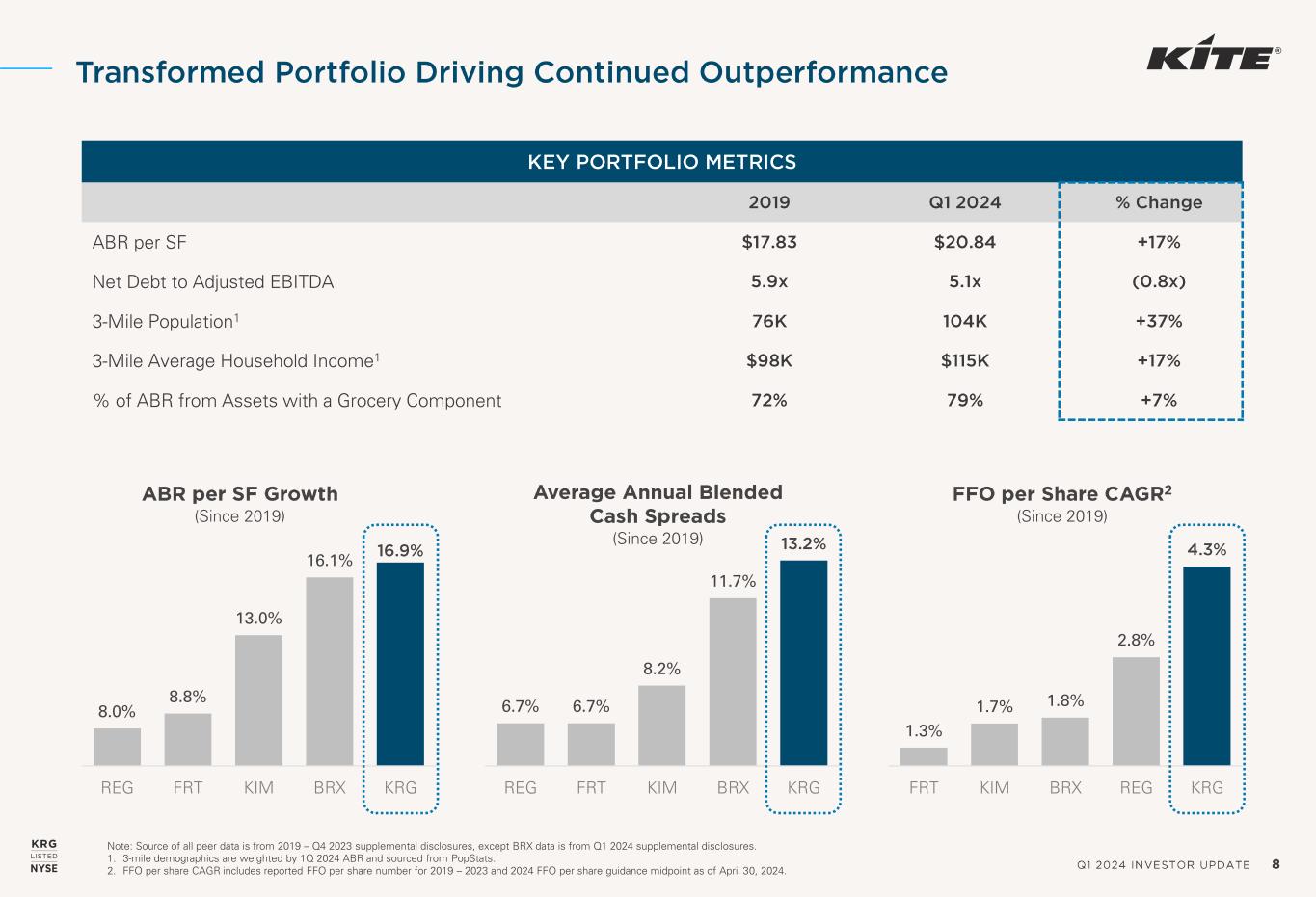ABR per SF Net Debt to Adjusted EBITDA 3-Mile Population1 3-Mile Average Household Income1 % of ABR from Assets with a Grocery Component 8.0% 8.8% 13.0% 16.1% REG FRT KIM BRX KRG (Since 2019) 6.7% 6.7% 8.2% 11.7% REG FRT KIM BRX KRG (Since 2019) 1.3% 1.7% 1.8% 2.8% FRT KIM BRX REG KRG (Since 2019) Note: Source of all peer data is from 2019 – Q4 2023 supplemental disclosures, except BRX data is from Q1 2024 supplemental disclosures. 1. 3-mile demographics are weighted by 1Q 2024 ABR and sourced from PopStats. 2. FFO per share CAGR includes reported FFO per share number for 2019 – 2023 and 2024 FFO per share guidance midpoint as of April 30, 2024.