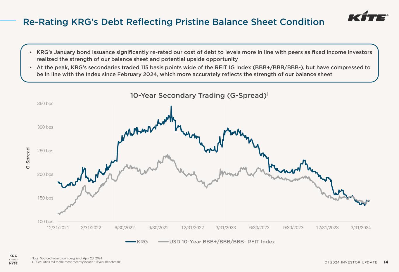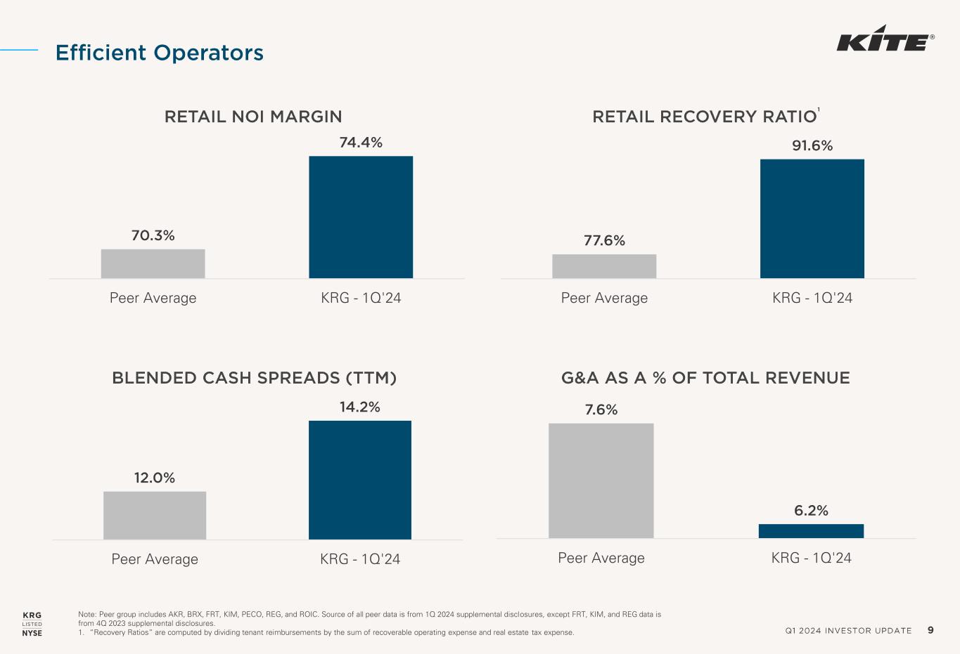 Peer Average KRG - 1Q'24 Note: Peer group includes AKR, BRX, FRT, KIM, PECO, REG, and ROIC. Source of all peer data is from 1Q 2024 supplemental disclosures, except FRT, KIM, and REG data is from 4Q 2023 supplemental disclosures. 1. “Recovery Ratios” are computed by dividing tenant reimbursements by the sum of recoverable operating expense and real estate tax expense. Peer Average KRG - 1Q'24 Peer Average KRG - 1Q'24 Peer Average KRG - 1Q'24