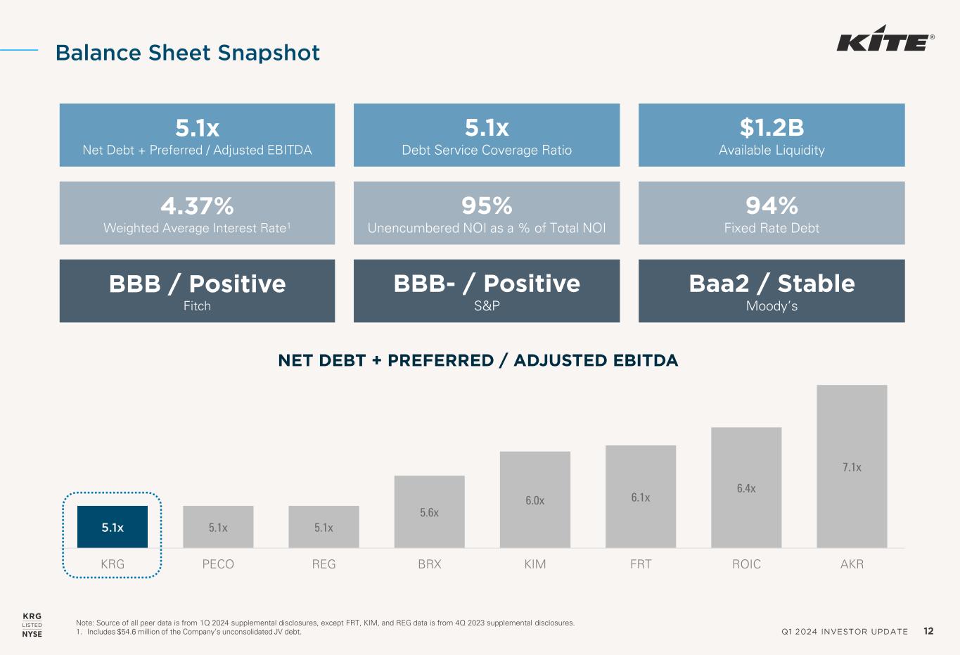 Note: Source of all peer data is from 1Q 2024 supplemental disclosures, except FRT, KIM, and REG data is from 4Q 2023 supplemental disclosures. 1. Includes $54.6 million of the Company’s unconsolidated JV debt. Net Debt + Preferred / Adjusted EBITDA Debt Service Coverage Ratio Available Liquidity Weighted Average Interest Rate1 Unencumbered NOI as a % of Total NOI Fixed Rate Debt Fitch S&P Moody’s 5.1x 5.1x 5.6x 6.0x 6.1x 6.4x 7.1x KRG PECO REG BRX KIM FRT ROIC AKR