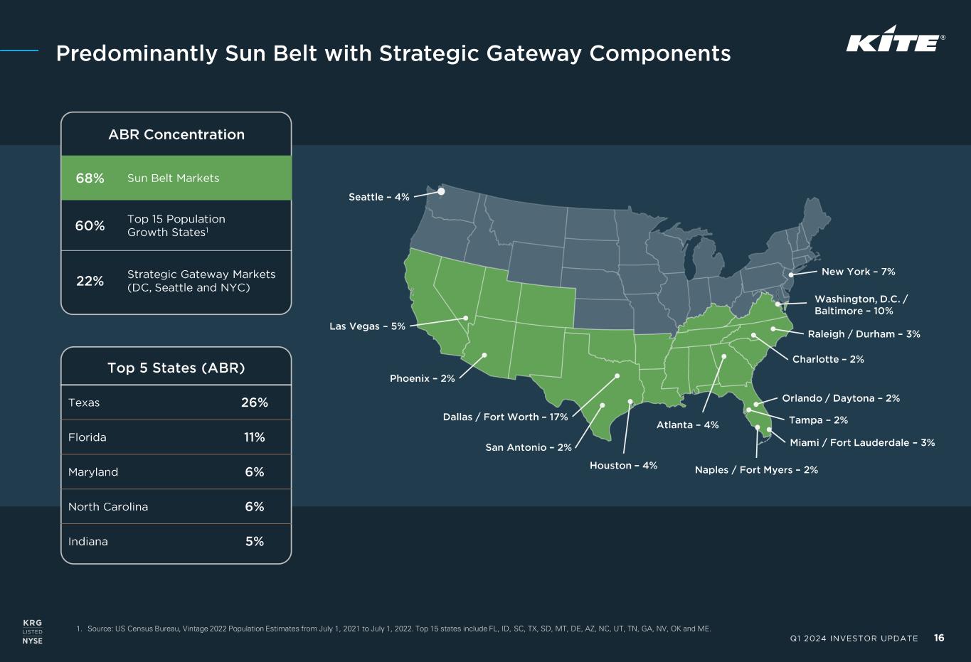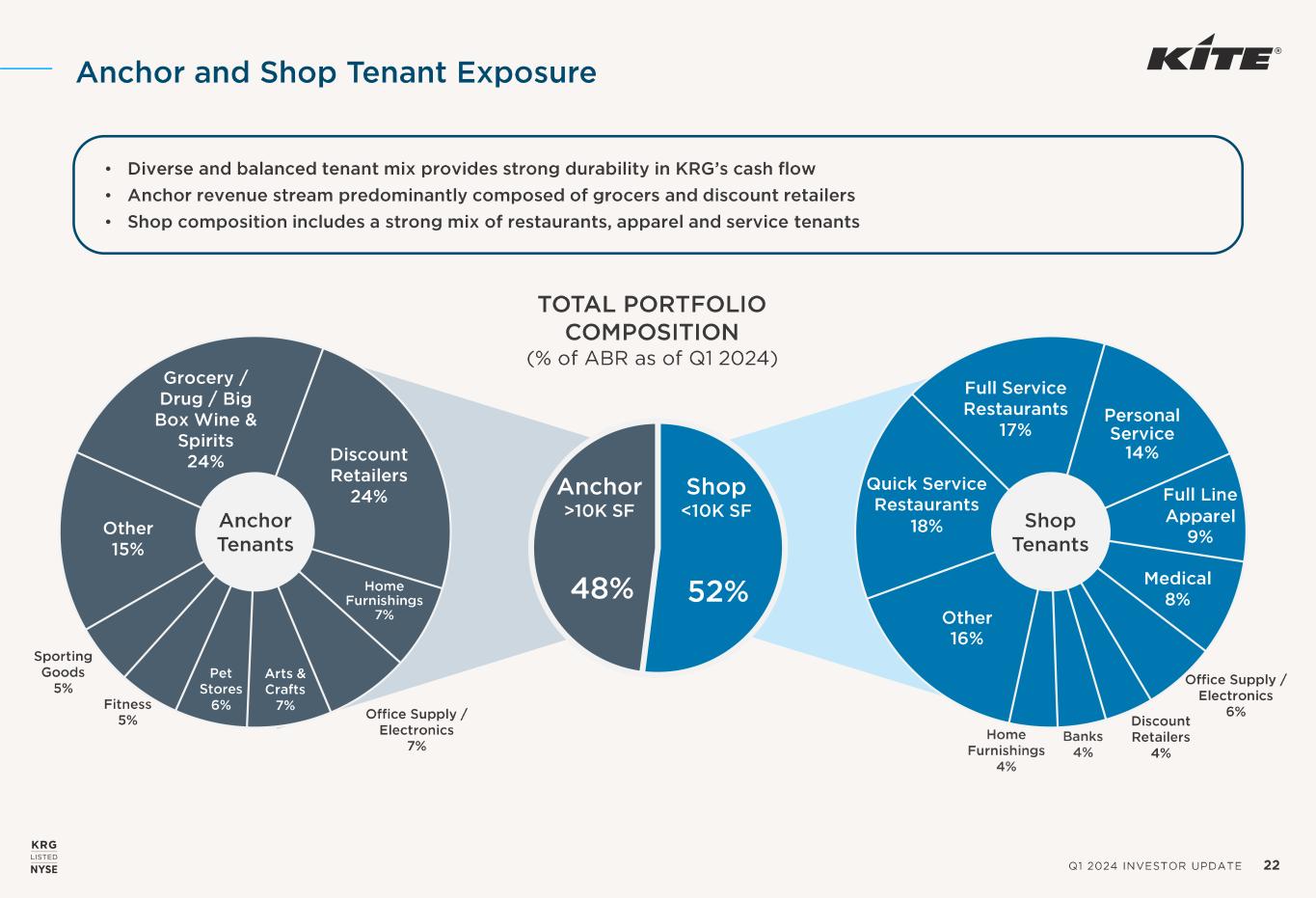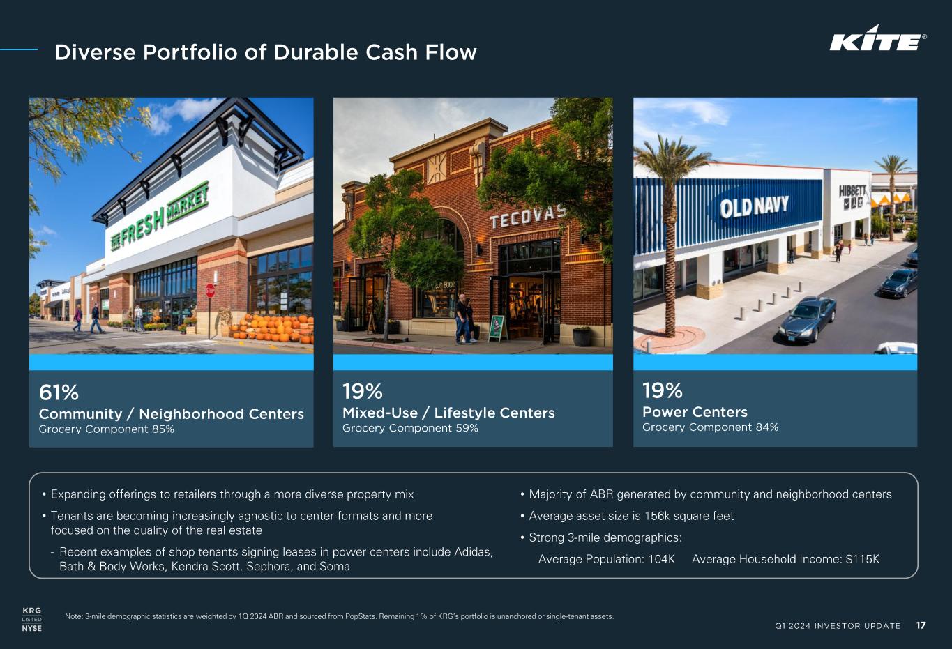 Note: 3-mile demographic statistics are weighted by 1Q 2024 ABR and sourced from PopStats. Remaining 1% of KRG’s portfolio is unanchored or single-tenant assets. • • • • •