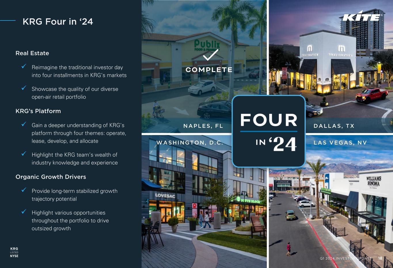 ✓ Reimagine the traditional investor day into four installments in KRG’s markets ✓ Showcase the quality of our diverse open-air retail portfolio ✓ Gain a deeper understanding of KRG’s platform through four themes: operate, lease, develop, and allocate ✓ Highlight the KRG team’s wealth of industry knowledge and experience ✓ Provide long-term stabilized growth trajectory potential ✓ Highlight various opportunities throughout the portfolio to drive outsized growth