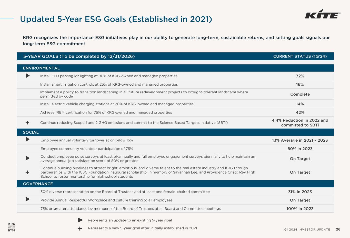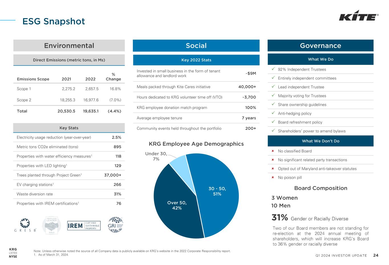 Scope 1 2,275.2 2,657.5 16.8% Scope 2 18,255.3 16,977.6 (7.0%) Electricity usage reduction (year-over-year) Metric tons CO2e eliminated (tons) Properties with water efficiency measures1 Properties with LED lighting1 Trees planted through Project Green1 EV charging stations1 Waste diversion rate Properties with IREM certifications1 Invested in small business in the form of tenant allowance and landlord work Meals packed through Kite Cares initiative Hours dedicated to KRG volunteer time off (VTO) KRG employee donation match program Average employee tenure Community events held throughout the portfolio ✓ 92% Independent Trustees ✓ Entirely independent committees ✓ Lead independent Trustee ✓ Majority voting for Trustees ✓ Share ownership guidelines ✓ Anti-hedging policy ✓ Board refreshment policy ✓ Shareholders’ power to amend bylaws  No classified Board  No significant related party transactions  Opted out of Maryland anti-takeover statutes  No poison pill Note: Unless otherwise noted the source of all Company data is publicly available on KRG’s website in the 2022 Corporate Responsibility report. 1. As of March 31, 2024.
