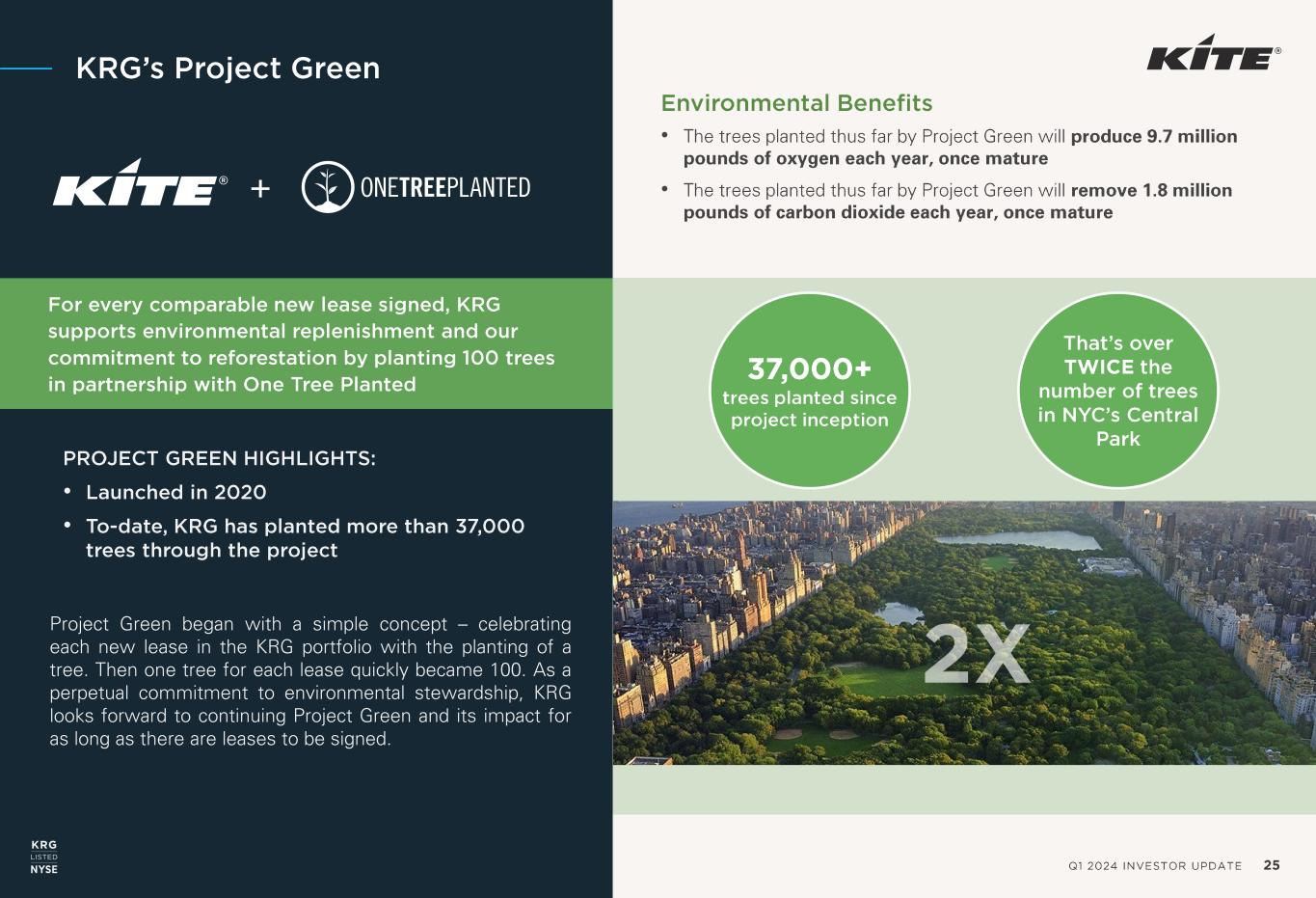 • • Project Green began with a simple concept – celebrating each new lease in the KRG portfolio with the planting of a tree. Then one tree for each lease quickly became 100. As a perpetual commitment to environmental stewardship, KRG looks forward to continuing Project Green and its impact for as long as there are leases to be signed. • •