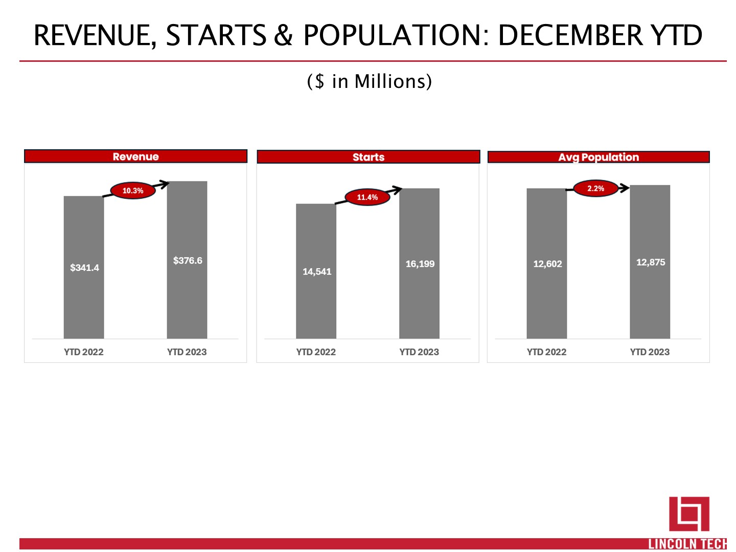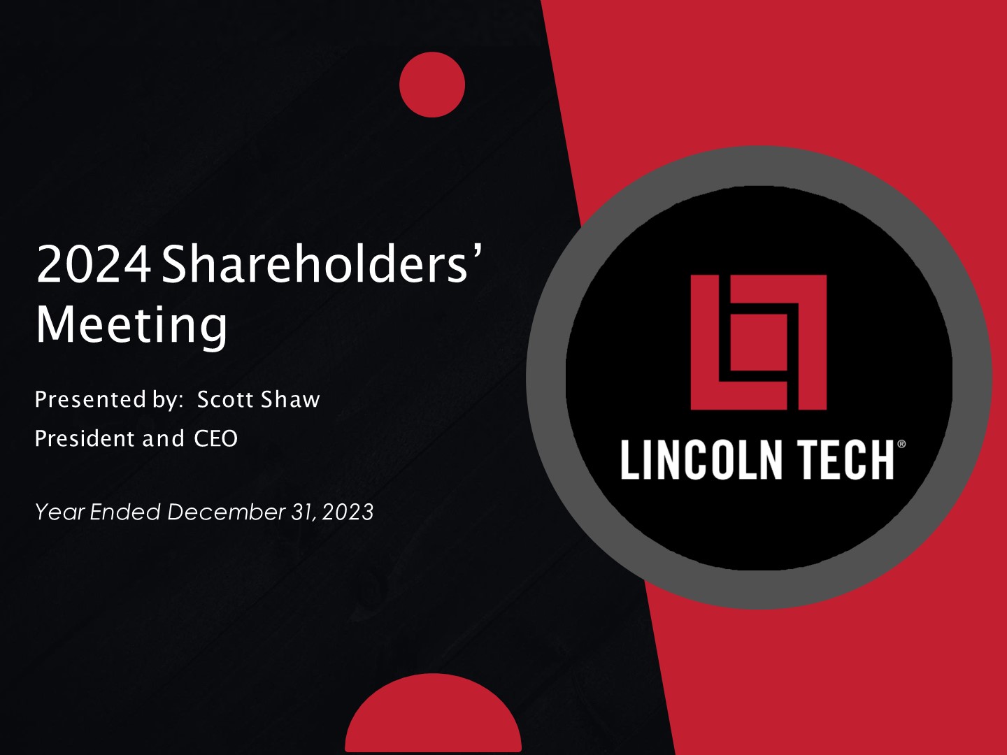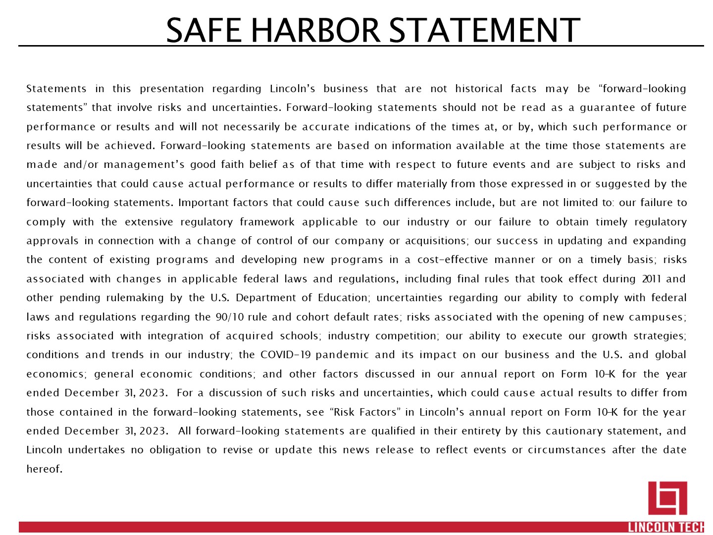 SAFE HARBOR STATEMENT   Statements in this presentation regarding Lincoln’s business that are not historical facts may be “forward-looking statements” that involve risks and uncertainties. Forward-looking statements should not be read as a guarantee of future performance or results and will not necessarily be accurate indications of the times at, or by, which such performance or results will be achieved. Forward-looking statements are based on information available at the time those statements are made and/or management’s good faith belief as of that time with respect to future events and are subject to risks and uncertainties that could cause actual performance or results to differ materially from those expressed in or suggested by the forward-looking statements. Important factors that could cause such differences include, but are not limited to: our failure to comply with the extensive regulatory framework applicable to our industry or our failure to obtain timely regulatory approvals in connection with a change of control of our company or acquisitions; our success in updating and expanding the content of existing programs and developing new programs in a cost-effective manner or on a timely basis; risks associated with changes in applicable federal laws and regulations, including final rules that took effect during 2011 and other pending rulemaking by the U.S. Department of Education; uncertainties regarding our ability to comply with federal laws and regulations regarding the 90/10 rule and cohort default rates; risks associated with the opening of new campuses; risks associated with integration of acquired schools; industry competition; our ability to execute our growth strategies; conditions and trends in our industry; the COVID-19 pandemic and its impact on our business and the U.S. and global economics; general economic conditions; and other factors discussed in our annual report on Form 10-K for the year ended December 31, 2023. For a discussion of such risks and uncertainties, which could cause actual results to differ from those contained in the forward-looking statements, see “Risk Factors” in Lincoln’s annual report on Form 10-K for the year ended December 31, 2023. All forward-looking statements are qualified in their entirety by this cautionary statement, and Lincoln undertakes no obligation to revise or update this news release to reflect events or circumstances after the date hereof.