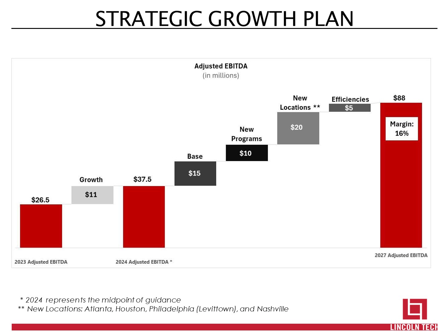 STRATEGIC GROWTH PLAN   * 2024 represents the midpoint of guidance  ** New Locations: Atlanta, Houston, Philadelphia (Levittown), and Nashville