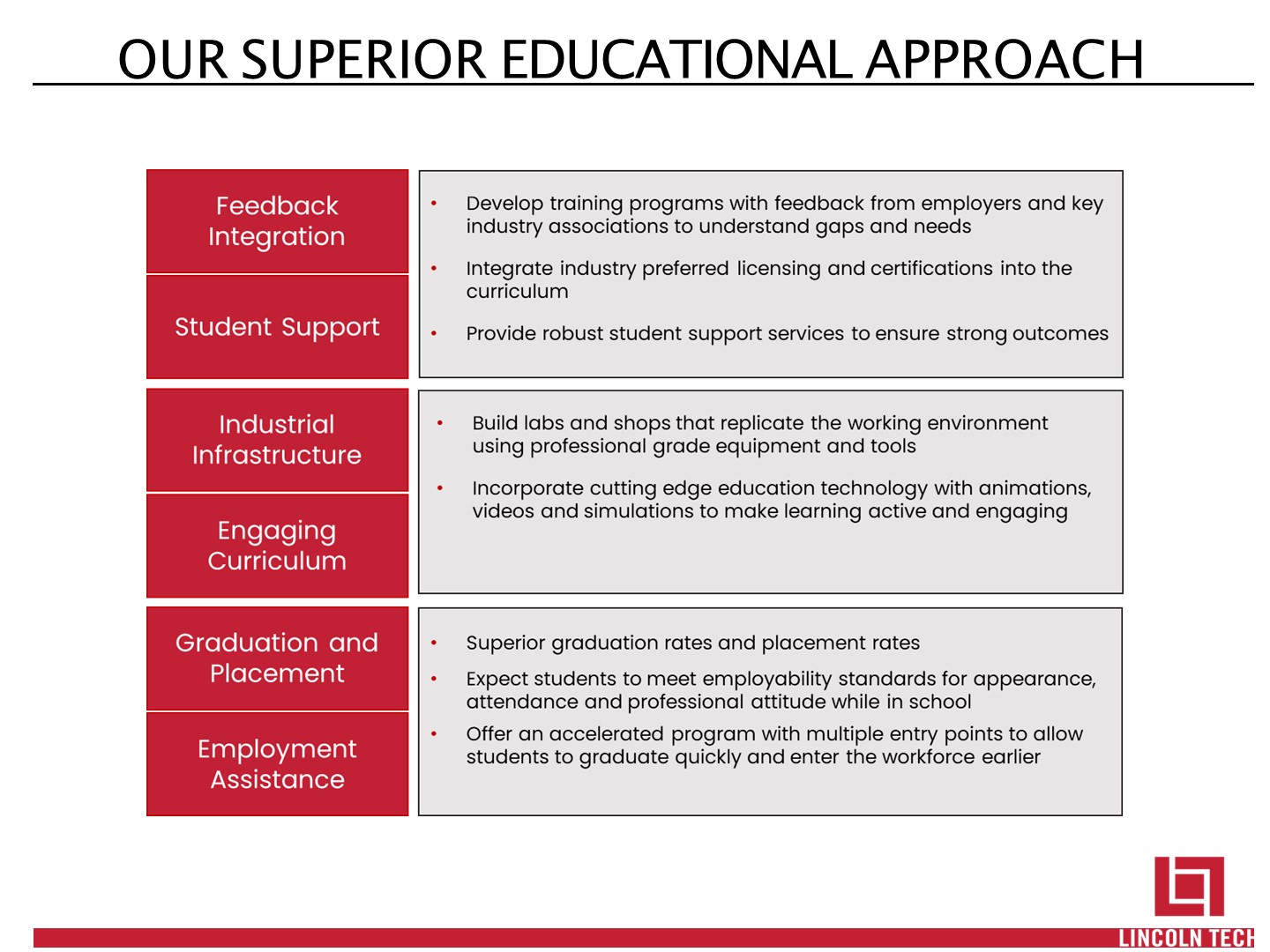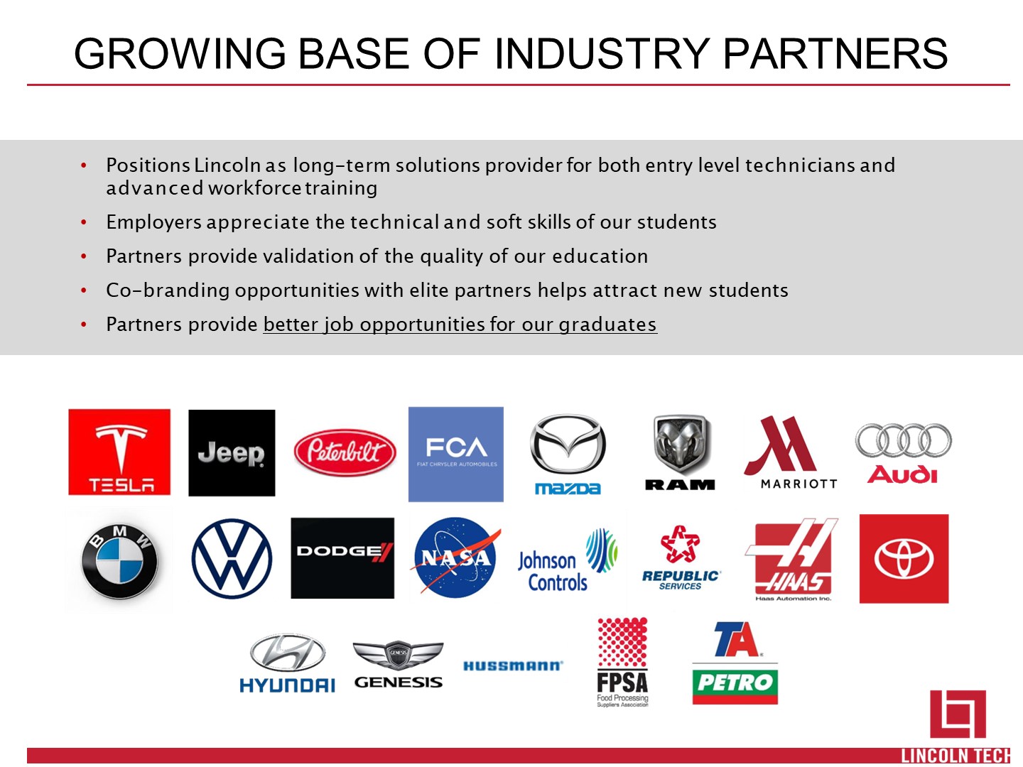 GROWING BASE OF INDUSTRY PARTNERS  Positions Lincoln as long-term solutions provider for both entry level technicians and advanced workforce training  Employers appreciate the technical and soft skills of our students  Partners provide validation of the quality of our education  Co-branding opportunities with elite partners helps attract new students  Partners provide better job opportunities for our graduates