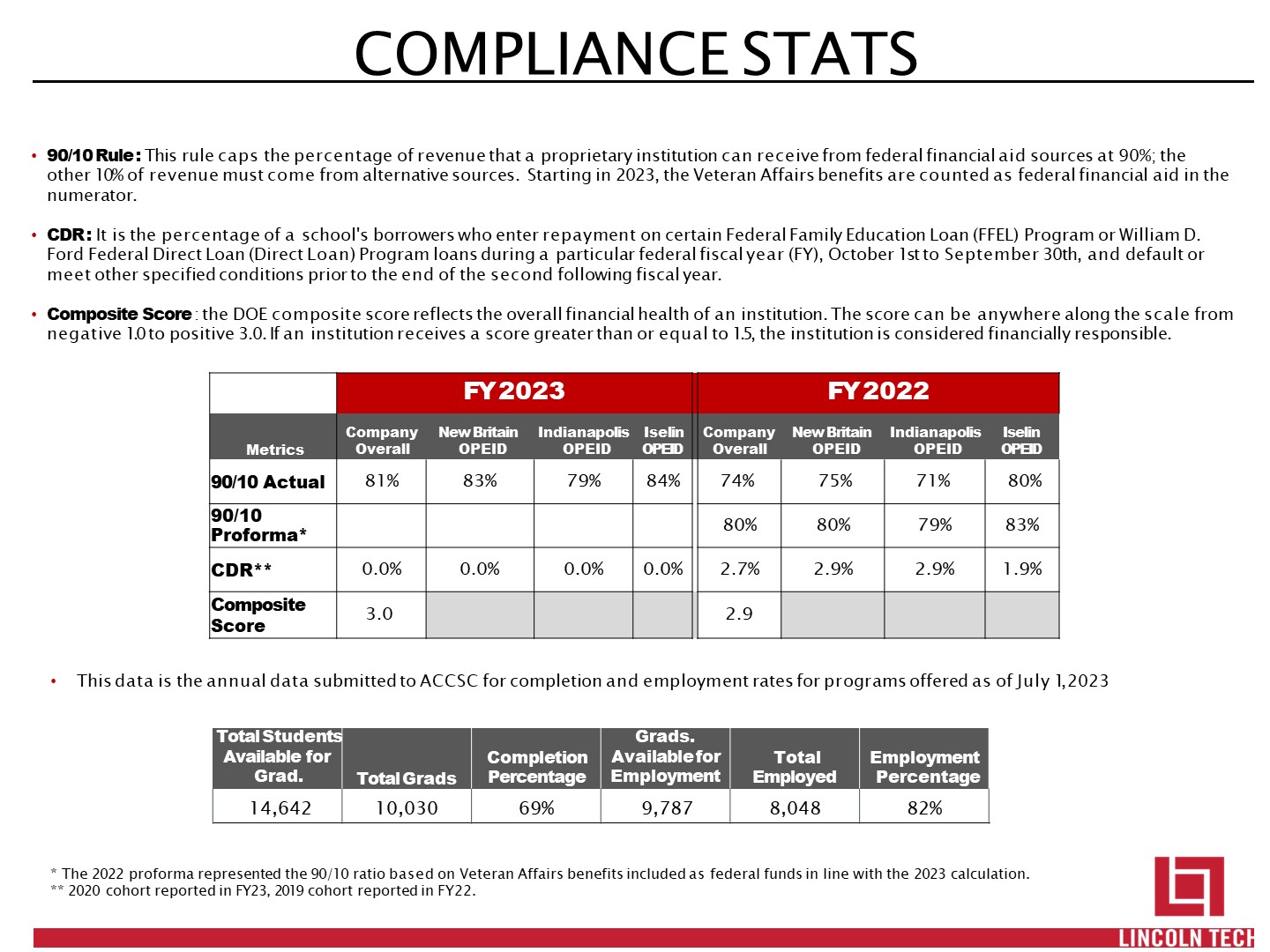 COMPLIANCE STATS   90/10 Rule : This rule caps the percentage of revenue that a proprietary institution can receive from federal financial aid sources at 90%; the other 10% of revenue must come from alternative sources. Starting in 2023, the Veteran Affairs benefits are counted as federal financial aid in the numerator.  CDR : It is the percentage of a school's borrowers who enter repayment on certain Federal Family Education Loan (FFEL) Program or William D. Ford Federal Direct Loan (Direct Loan) Program loans during a particular federal fiscal year (FY), October 1st to September 30th, and default or meet other specified conditions prior to the end of the second following fiscal year.  Composite Score : the DOE composite score reflects the overall financial health of an institution. The score can be anywhere along the scale from  negative 1.0 to positive 3.0. If an institution receives a score greater than or equal to 1.5, the institution is considered financially responsible.  FY 2023  FY 2022  Metrics  Company Overall  New Britain OPEID  Indianapolis OPEID  Iselin OPEID  Company Overall  New Britain OPEID  Indianapolis OPEID  Iselin OPEID  90/10 Actual  81%  83%  79%  84%  74%  75%  71%  80%  90/10  Proforma*  80%  80%  79%  83%  CDR**  0.0%  0.0%  0.0%  0.0%  2.7%  2.9%  2.9%  1.9%  Composite Score  3.0  2.9  This data is the annual data submitted to ACCSC for completion and employment rates for programs offered as of July 1, 2023  Total Students  Available for Grad.  Total Grads  Completion Percentage  Grads.  Available for Employment  Total Employed  Employment Percentage  14,642  10,030  69%  9,787  8,048  82%  * The 2022 proforma represented the 90/10 ratio based on Veteran Affairs benefits included as federal funds in line with the 2023 calculation.  ** 2020 cohort reported in FY23, 2019 cohort reported in FY22.