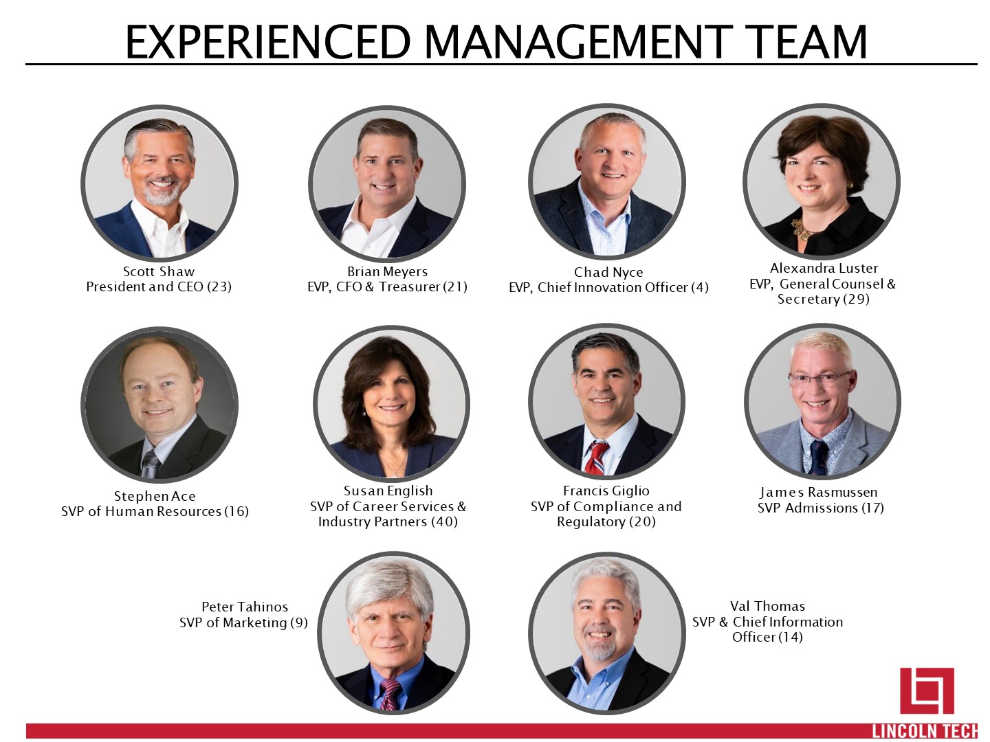 EXPERIENCED MANAGEMENT TEAM   Chad Nyce  EVP, Chief Innovation Officer (4)  Alexandra Luster EVP, General Counsel &  Secretary (29)  Peter Tahinos SVP of Marketing (9)  Val Thomas  SVP & Chief Information Officer (14)  Stephen Ace  SVP of Human Resources (16)  Susan English  SVP of Career Services & Industry Partners (40)  Francis Giglio  SVP of Compliance and Regulatory (20)  James Rasmussen SVP Admissions (17)  Scott Shaw  President and CEO (23)  Brian Meyers  EVP, CFO & Treasurer (21)