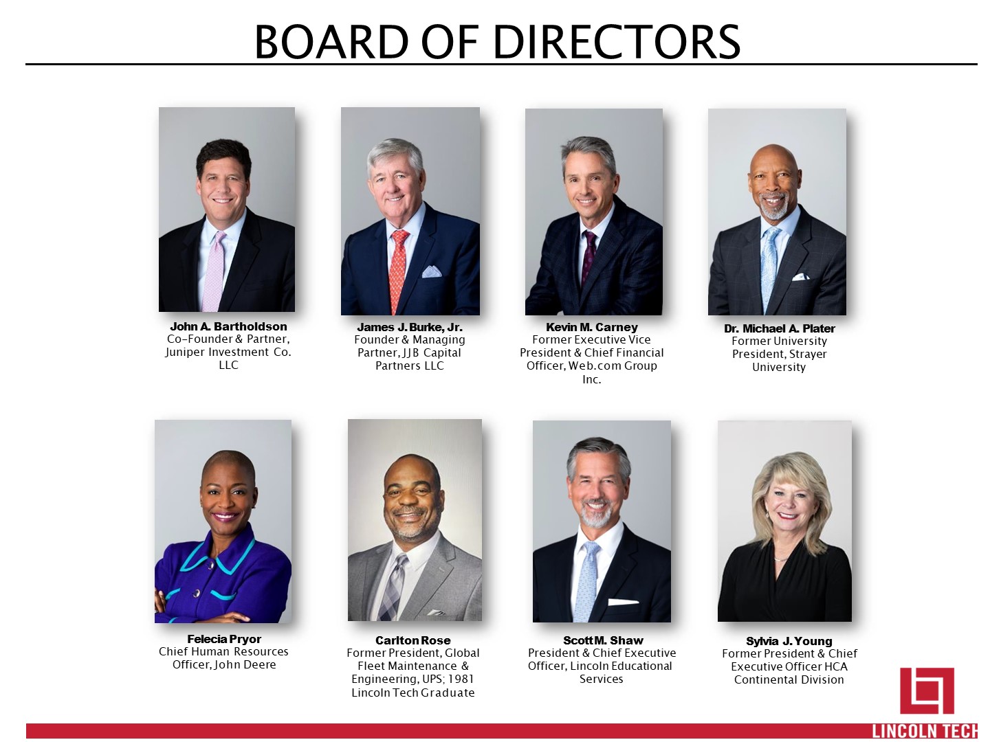 BOARD OF DIRECTORS   Carlton Rose  Former President, Global Fleet Maintenance & Engineering, UPS; 1981 Lincoln Tech Graduate  Scott M. Shaw President & Chief Executive Officer, Lincoln Educational  Services  Felecia Pryor  Chief Human Resources  Officer, John Deere  Sylvia J. Young  Former President & Chief Executive Officer HCA Continental Division  James J. Burke, Jr. Founder & Managing Partner, JJB Capital Partners LLC  Kevin M. Carney  Former Executive Vice President & Chief Financial Officer, Web.com Group Inc.  John A. Bartholdson Co-Founder & Partner, Juniper Investment Co.  LLC  Dr. Michael A. Plater Former University President, Strayer University