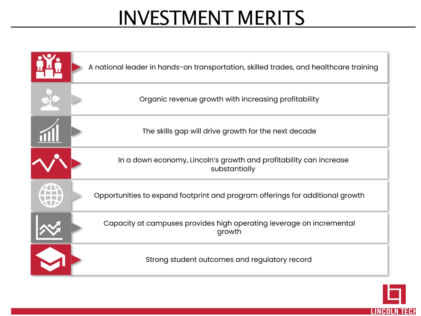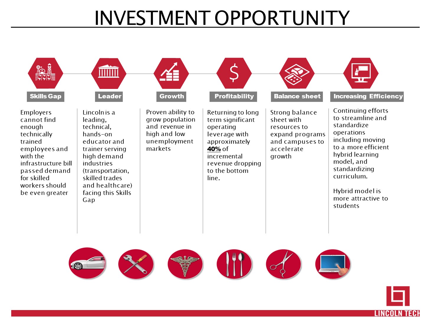 Employers cannot find enough technically trained employees and with the infrastructure bill passed demand for skilled workers should be even greater  Lincoln is a leading, technical, hands-on educator and trainer serving high demand industries (transportation, skilled trades and healthcare) facing this Skills Gap  Proven ability to grow population and revenue in high and low unemployment markets  Returning to long term significant operating leverage with approximately 40% of incremental revenue dropping to the bottom line.  Strong balance sheet with resources to expand programs and campuses to accelerate growth  Continuing efforts to streamline and standardize operations including moving to a more efficient hybrid learning model, and standardizing curriculum.  Hybrid model is more attractive to students  Skills Gap  Leader  Growth  Profitability  Increasing Efficiency  Balance sheet   INVESTMENT OPPORTUNITY