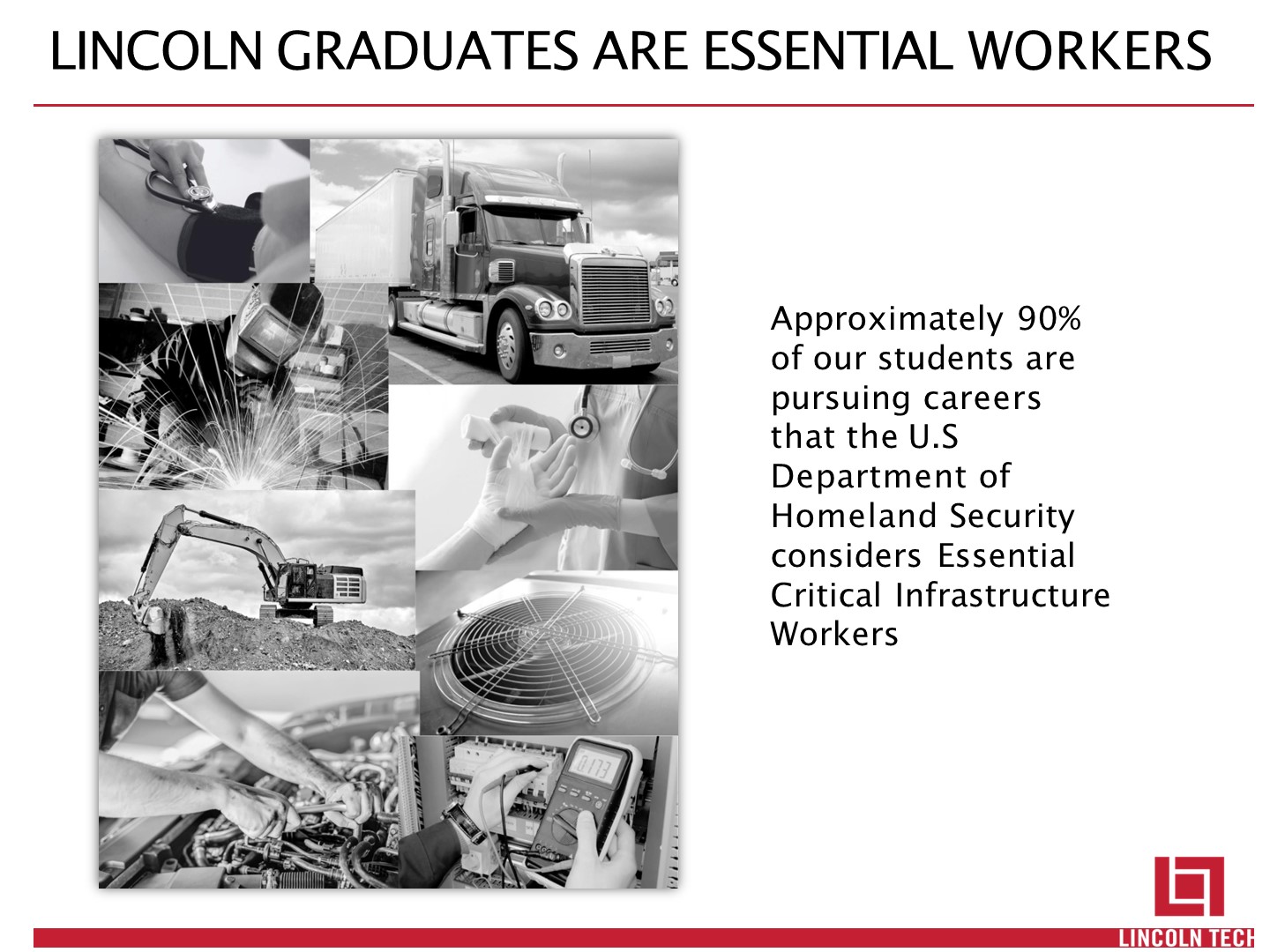 LINCOLN GRADUATES ARE ESSENTIAL WORKERS  Approximately 90% of our students are pursuing careers that the U.S Department of Homeland Security considers Essential Critical Infrastructure Workers