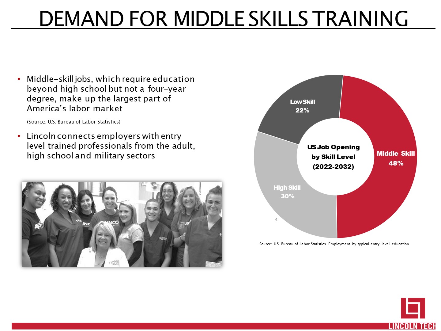 DEMAND FOR MIDDLE SKILLS TRAINING   4  Middle-skill jobs, which require education beyond high school but not a four-year degree, make up the largest part of America’s labor market  (Source: U.S. Bureau of Labor Statistics)  Lincoln connects employers with entry level trained professionals from the adult, high school and military sectors  Low Skill  22%  Middle Skill 48%  High Skill 30%  US Job Opening by Skill Level (2022-2032)  Source: U.S. Bureau of Labor Statistics Employment by typical entry-level education