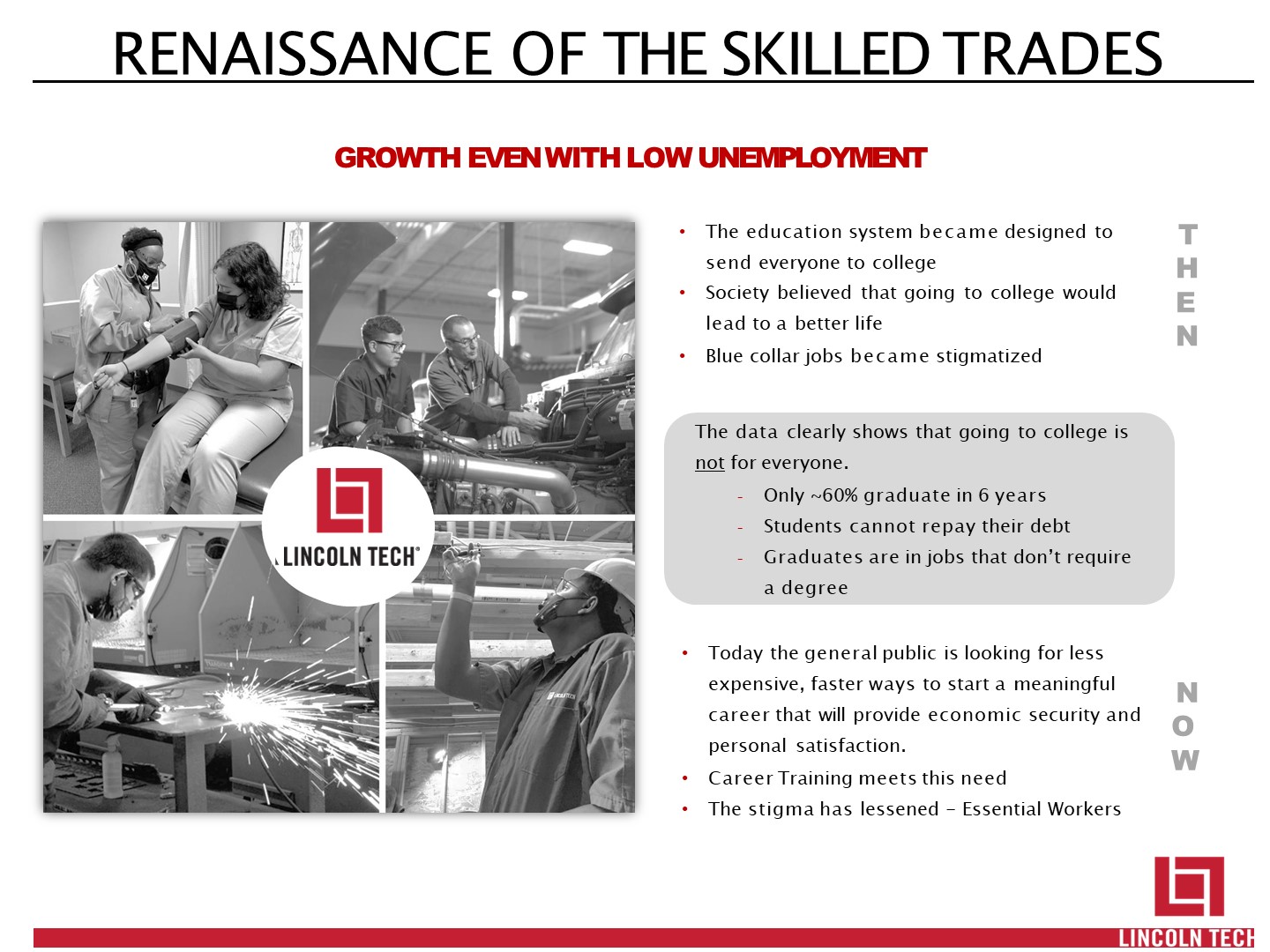 The education system became designed to send everyone to college  Society believed that going to college would lead to a better life  Blue collar jobs became stigmatized   RENAISSANCE OF THE SKILLED TRADES   Today the general public is looking for less expensive, faster ways to start a meaningful career that will provide economic security and personal satisfaction.  Career Training meets this need  The stigma has lessened - Essential Workers  The data clearly shows that going to college is not for everyone.  Only ~60% graduate in 6 years  Students cannot repay their debt  Graduates are in jobs that don’t require  a degree  GROWTH EVEN WITH LOW UNEMPLOYMENT  T H E N  N O W