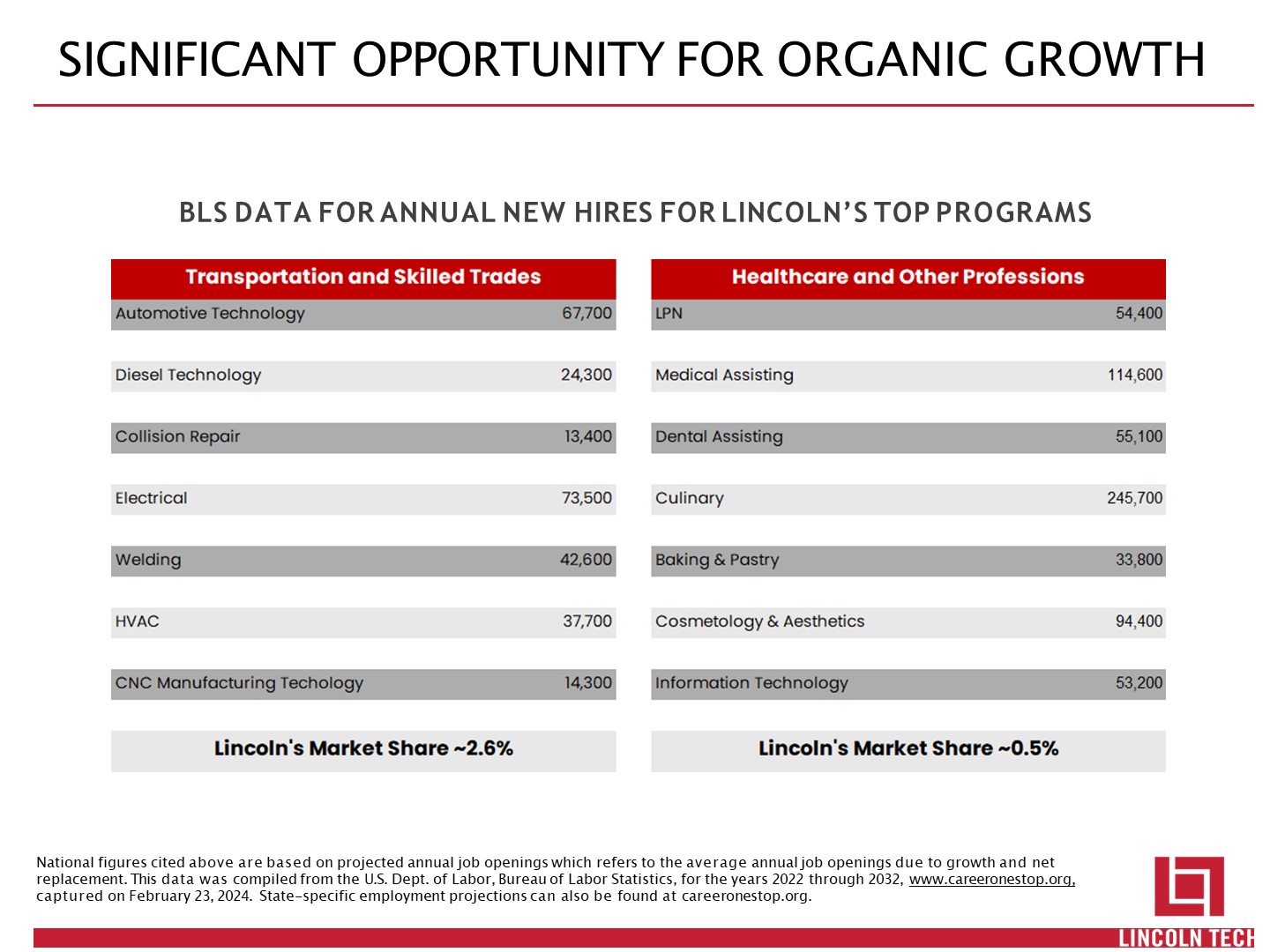 SIGNIFICANT OPPORTUNITY FOR ORGANIC GROWTH  BLS DATA FOR ANNUAL NEW HIRES FOR LINCOLN’S TOP PROGRAMS  National figures cited above are based on projected annual job openings which refers to the average annual job openings due to growth and net replacement. This data was compiled from the U.S. Dept. of Labor, Bureau of Labor Statistics, for the years 2022 through 2032, www.careeronestop.org, captured on February 23, 2024. State-specific employment projections can also be found at careeronestop.org.