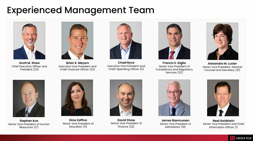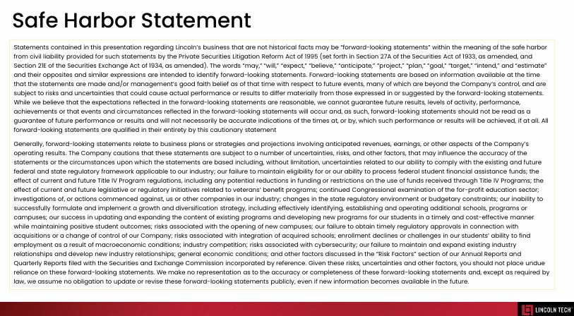 Safe Harbor Statement  Statements contained in this presentation regarding Lincoln’s business that are not historical facts may be “forward-looking statements” within the meaning of the safe harbor from civil liability provided for such statements by the Private Securities Litigation Reform Act of 1995 (set forth in Section 27A of the Securities Act of 1933, as amended, and Section 21E of the Securities Exchange Act of 1934, as amended). The words “may,” “will,” “expect,” “believe,” “anticipate,” “project,” “plan,” “goal,” “target,” “intend,” and “estimate” and their opposites and similar expressions are intended to identify forward-looking statements. Forward-looking statements are based on information available at the time that the statements are made and/or management’s good faith belief as of that time with respect to future events, many of which are beyond the Company’s control, and are subject to risks and uncertainties that could cause actual performance or results to differ materially from those expressed in or suggested by the forward-looking statements. While we believe that the expectations reflected in the forward-looking statements are reasonable, we cannot guarantee future results, levels of activity, performance, achievements or that events and circumstances reflected in the forward-looking statements will occur and, as such, forward-looking statements should not be read as a guarantee of future performance or results and will not necessarily be accurate indications of the times at, or by, which such performance or results will be achieved, if at all. All forward-looking statements are qualified in their entirety by this cautionary statement  Generally, forward-looking statements relate to business plans or strategies and projections involving anticipated revenues, earnings, or other aspects of the Company’s operating results. The Company cautions that these statements are subject to a number of uncertainties, risks, and other factors, that may influence the accuracy of the statements or the circumstances upon which the statements are based including, without limitation, uncertainties related to our ability to comply with the existing and future federal and state regulatory framework applicable to our industry; our failure to maintain eligibility for or our ability to process federal student financial assistance funds; the effect of current and future Title IV Program regulations, including any potential reductions in funding or restrictions on the use of funds received through Title IV Programs; the effect of current and future legislative or regulatory initiatives related to veterans’ benefit programs; continued Congressional examination of the for-profit education sector; investigations of, or actions commenced against, us or other companies in our industry; changes in the state regulatory environment or budgetary constraints; our inability to successfully formulate and implement a growth and diversification strategy, including effectively identifying, establishing and operating additional schools, programs or campuses; our success in updating and expanding the content of existing programs and developing new programs for our students in a timely and cost-effective manner while maintaining positive student outcomes; risks associated with the opening of new campuses; our failure to obtain timely regulatory approvals in connection with acquisitions or a change of control of our Company; risks associated with integration of acquired schools; enrollment declines or challenges in our students’ ability to find employment as a result of macroeconomic conditions; industry competition; risks associated with cybersecurity; our failure to maintain and expand existing industry relationships and develop new industry relationships; general economic conditions; and other factors discussed in the “Risk Factors” section of our Annual Reports and Quarterly Reports filed with the Securities and Exchange Commission incorporated by reference. Given these risks, uncertainties and other factors, you should not place undue reliance on these forward-looking statements. We make no representation as to the accuracy or completeness of these forward-looking statements and, except as required by law, we assume no obligation to update or revise these forward-looking statements publicly, even if new information becomes available in the future.