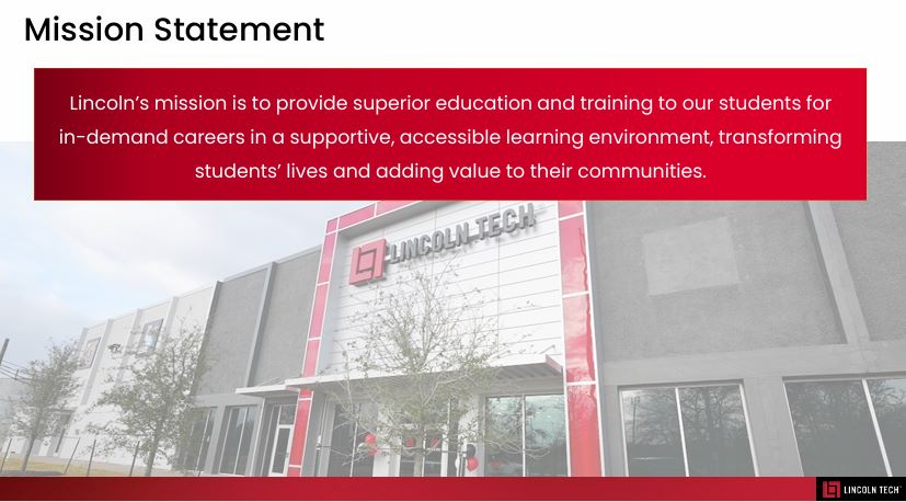 Mission Statement  Lincoln’s mission is to provide superior education and training to our students for in-demand careers in a supportive, accessible learning environment, transforming students’ lives and adding value to their communities.