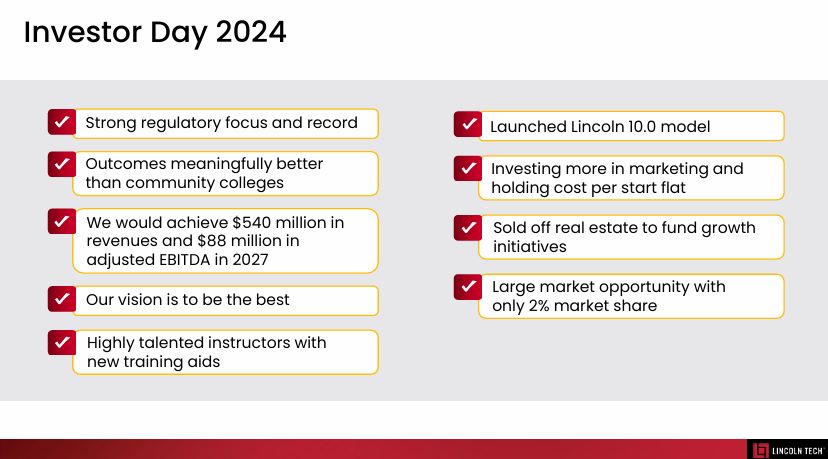 Investor Day 2024  Strong regulatory focus and record  Outcomes meaningfully better than community colleges  We would achieve $540 million in revenues and $88 million in adjusted EBITDA in 2027  Our vision is to be the best  Large market opportunity with only 2% market share  Highly talented instructors with new training aids  Launched Lincoln 10.0 model  Investing more in marketing and holding cost per start flat  Sold off real estate to fund growth initiatives